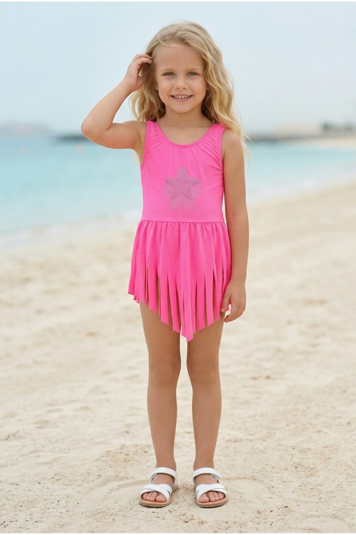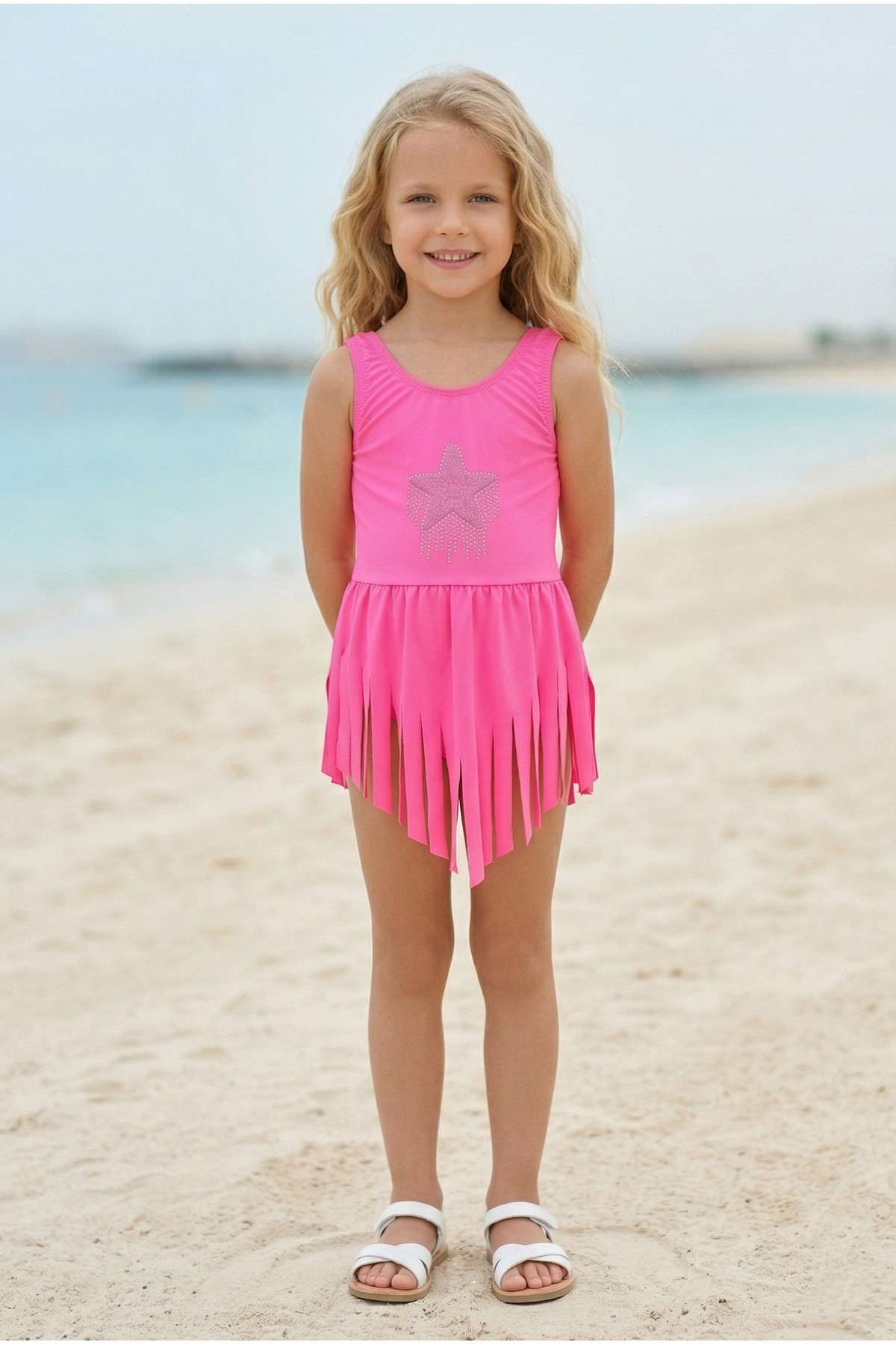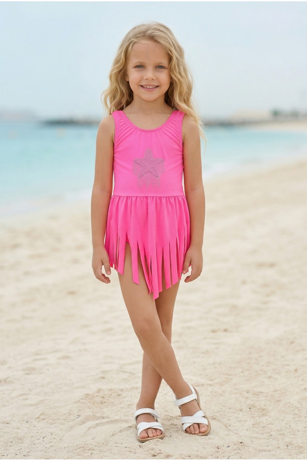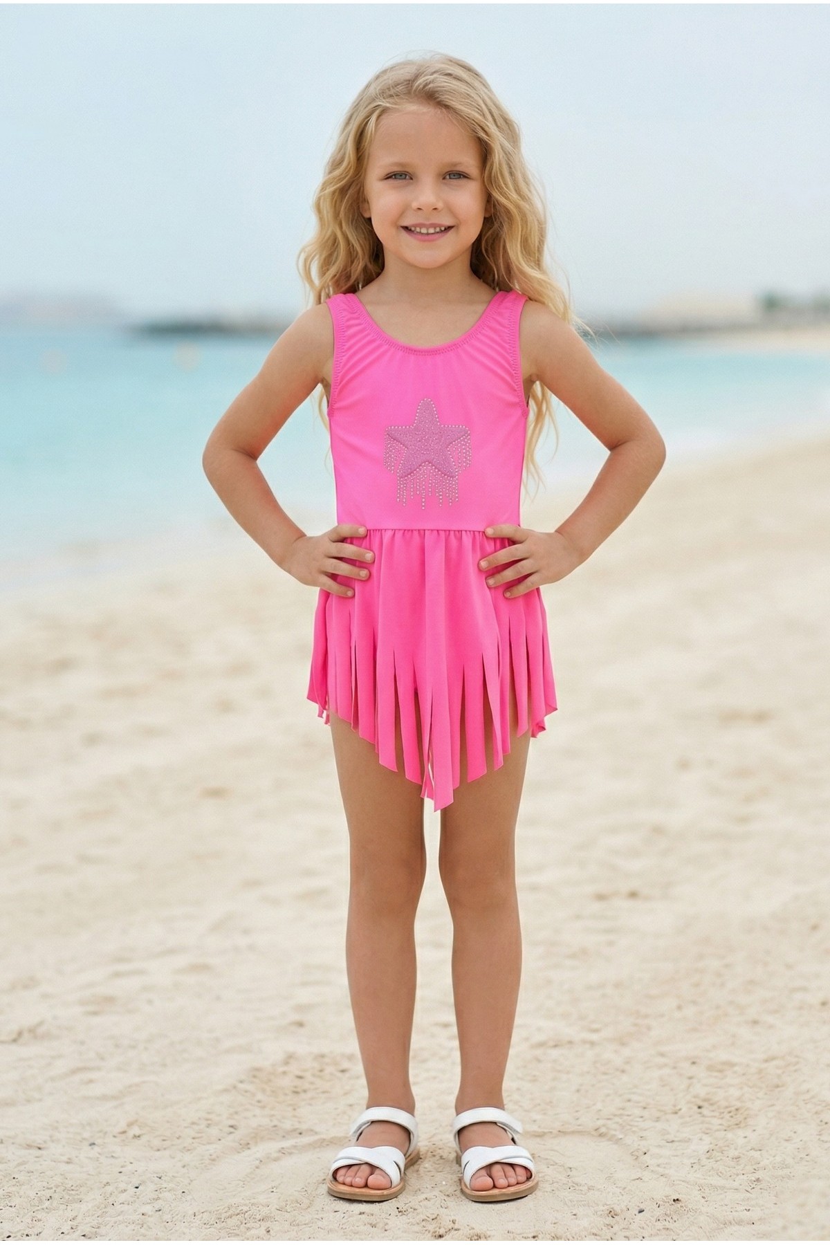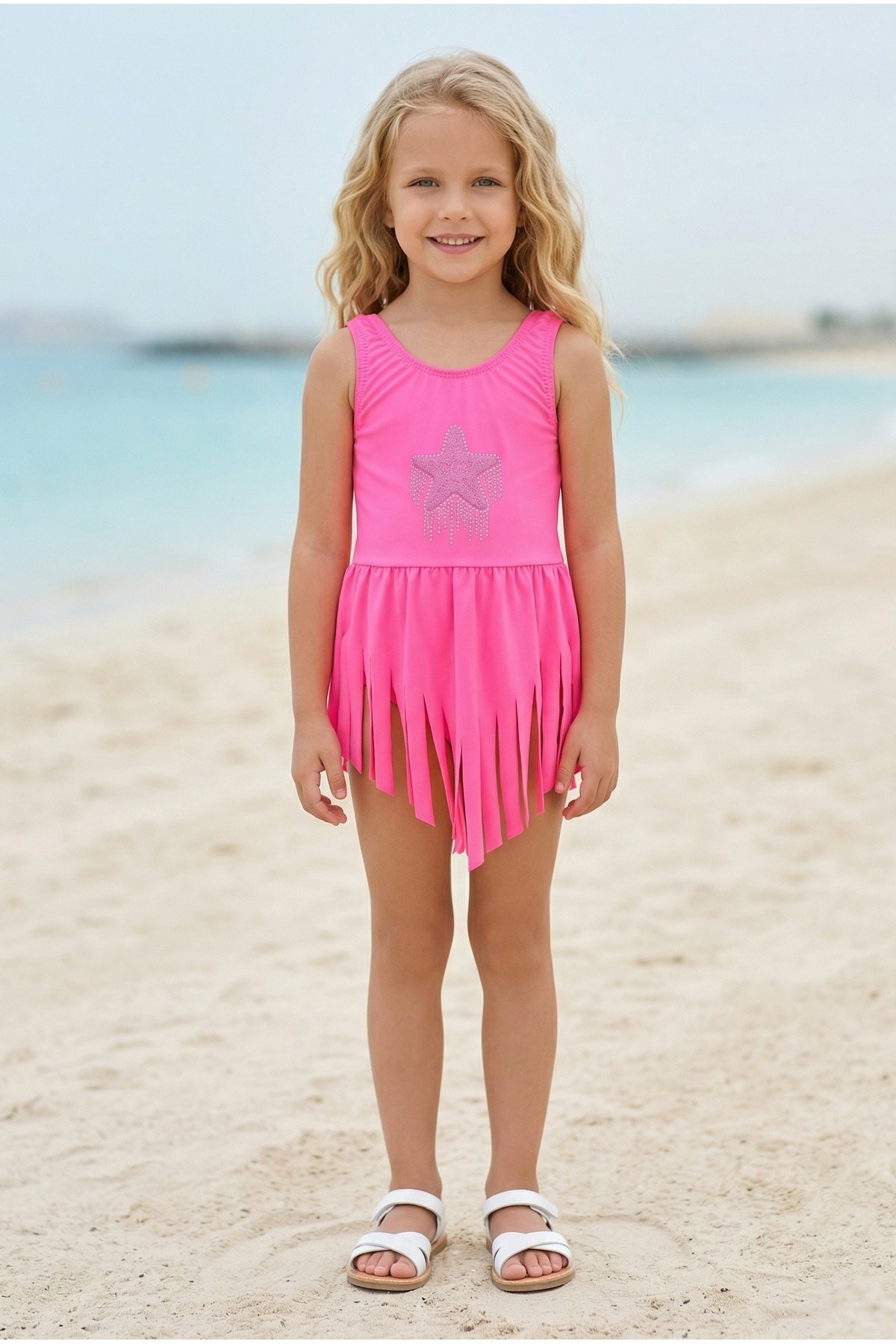 Kız Çocuk Polyester + Elastan Yıldız İşlemeli ve Püskül Detaylı Etekli Şık Tasarım Yüzücü Mayosu