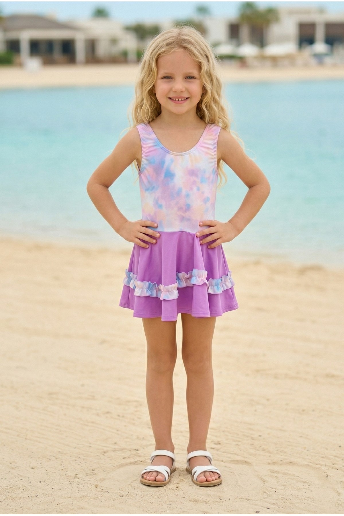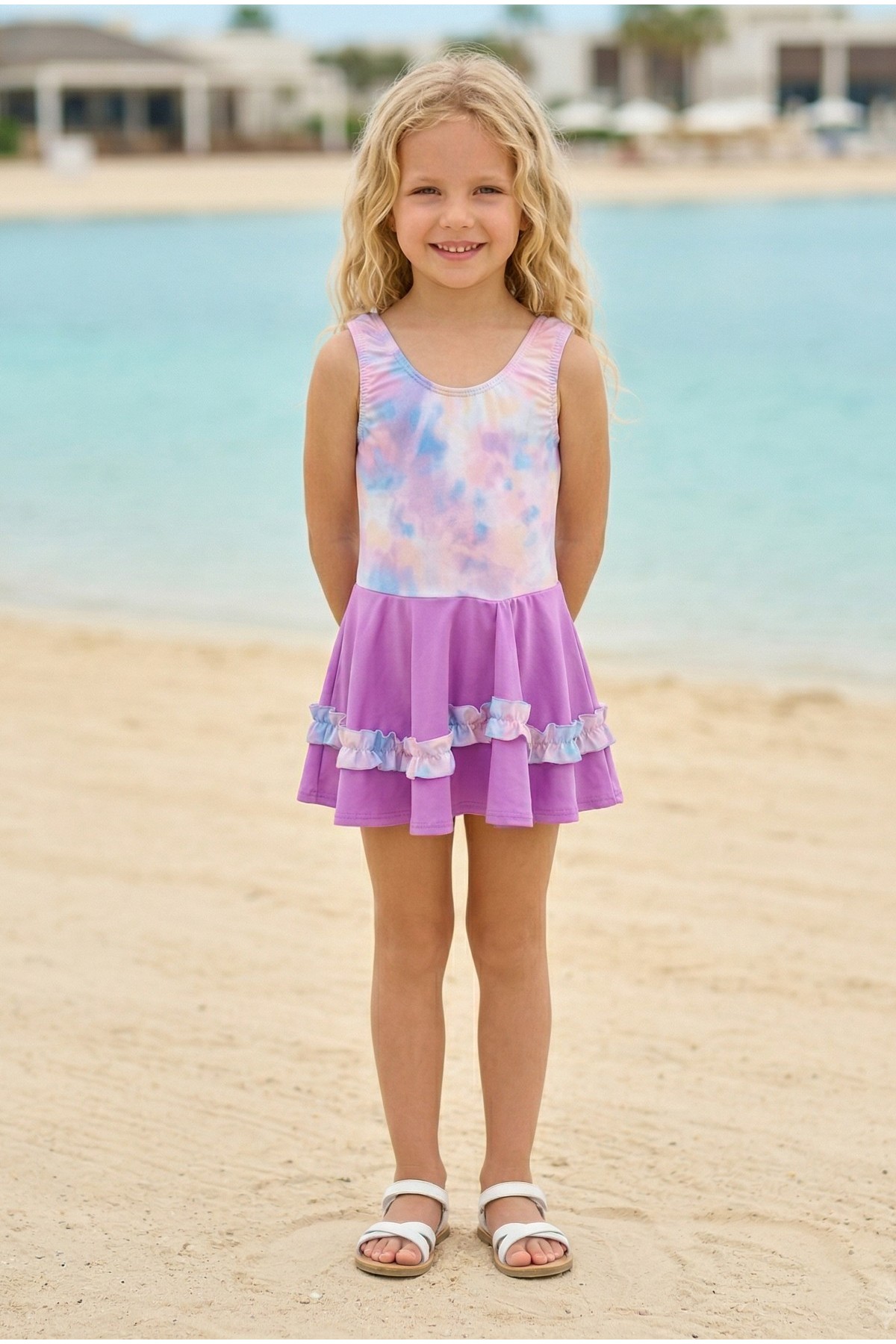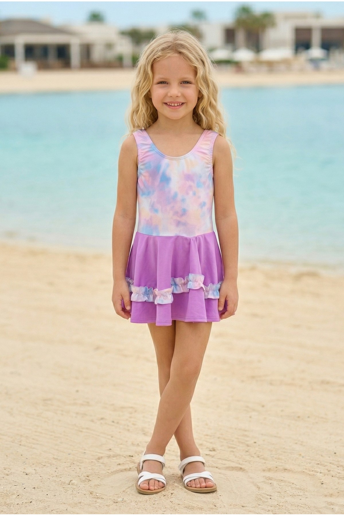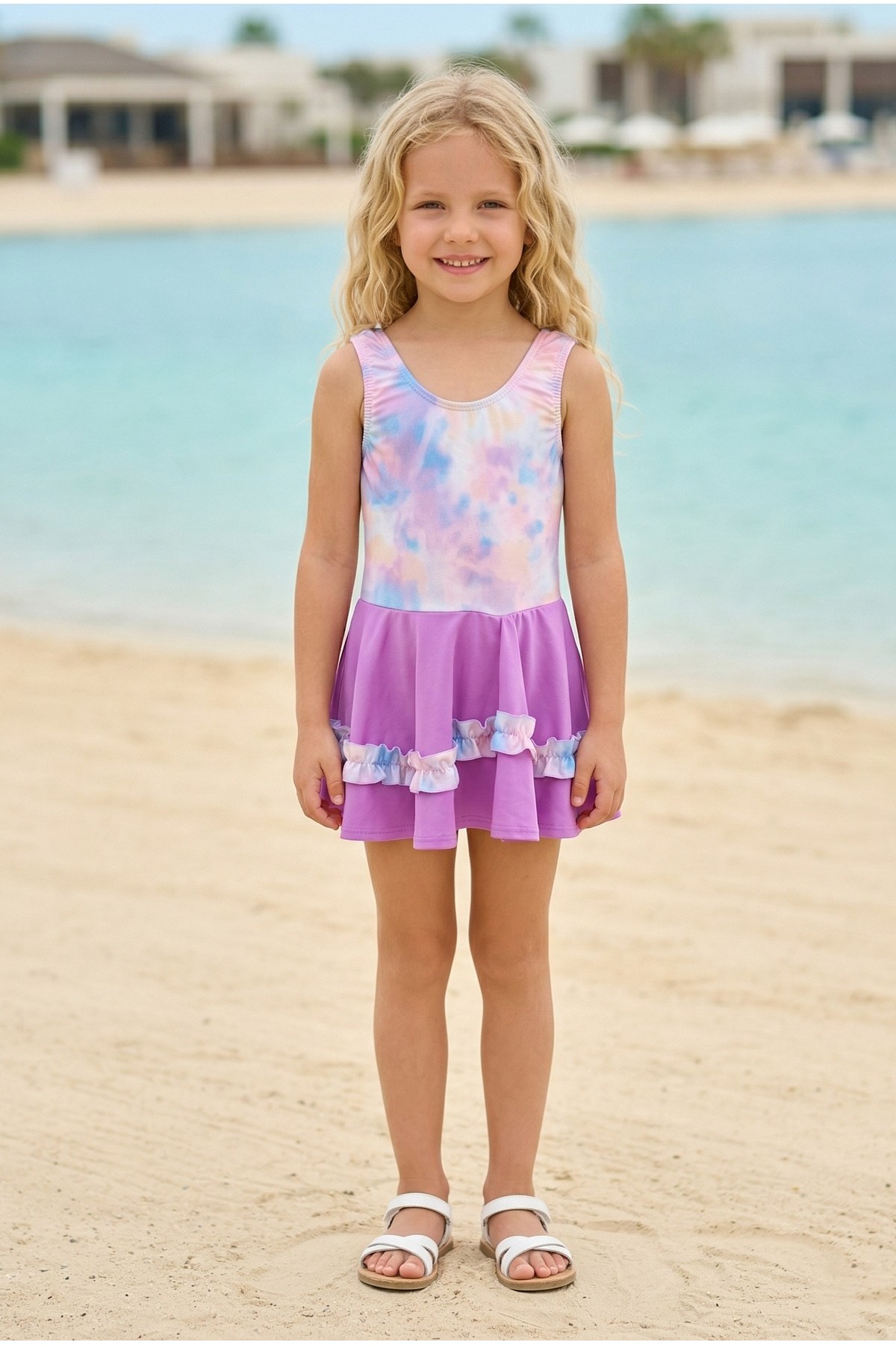 Kız Çocuk Polyester + Elastan Batik Desenli ve Fırfır Detaylı Etekli Kalın Askılı Şık Tasarım Yüzücü Mayosu