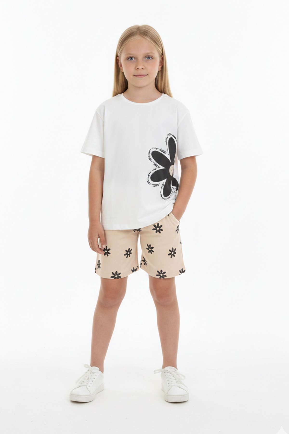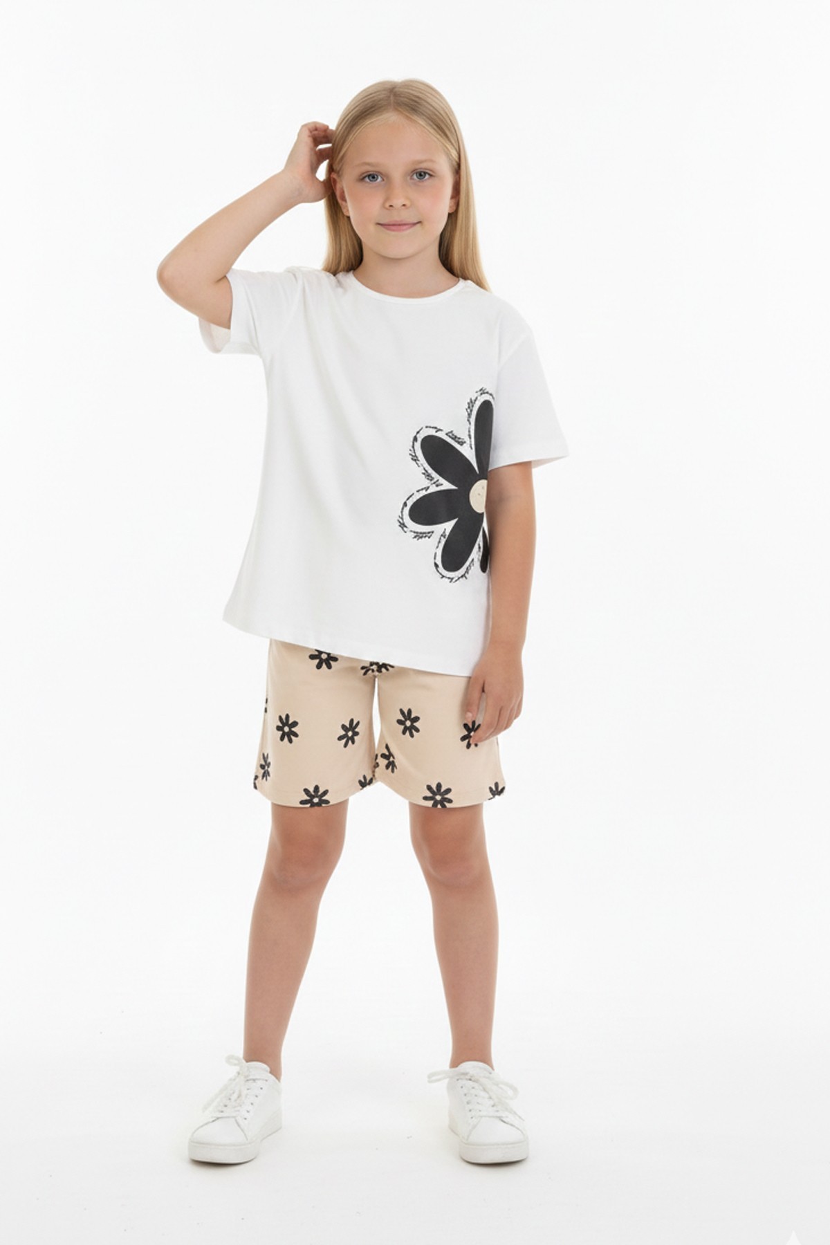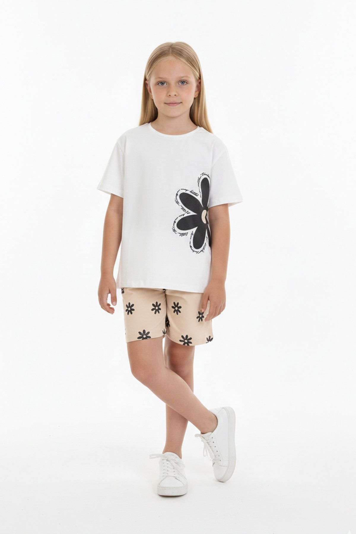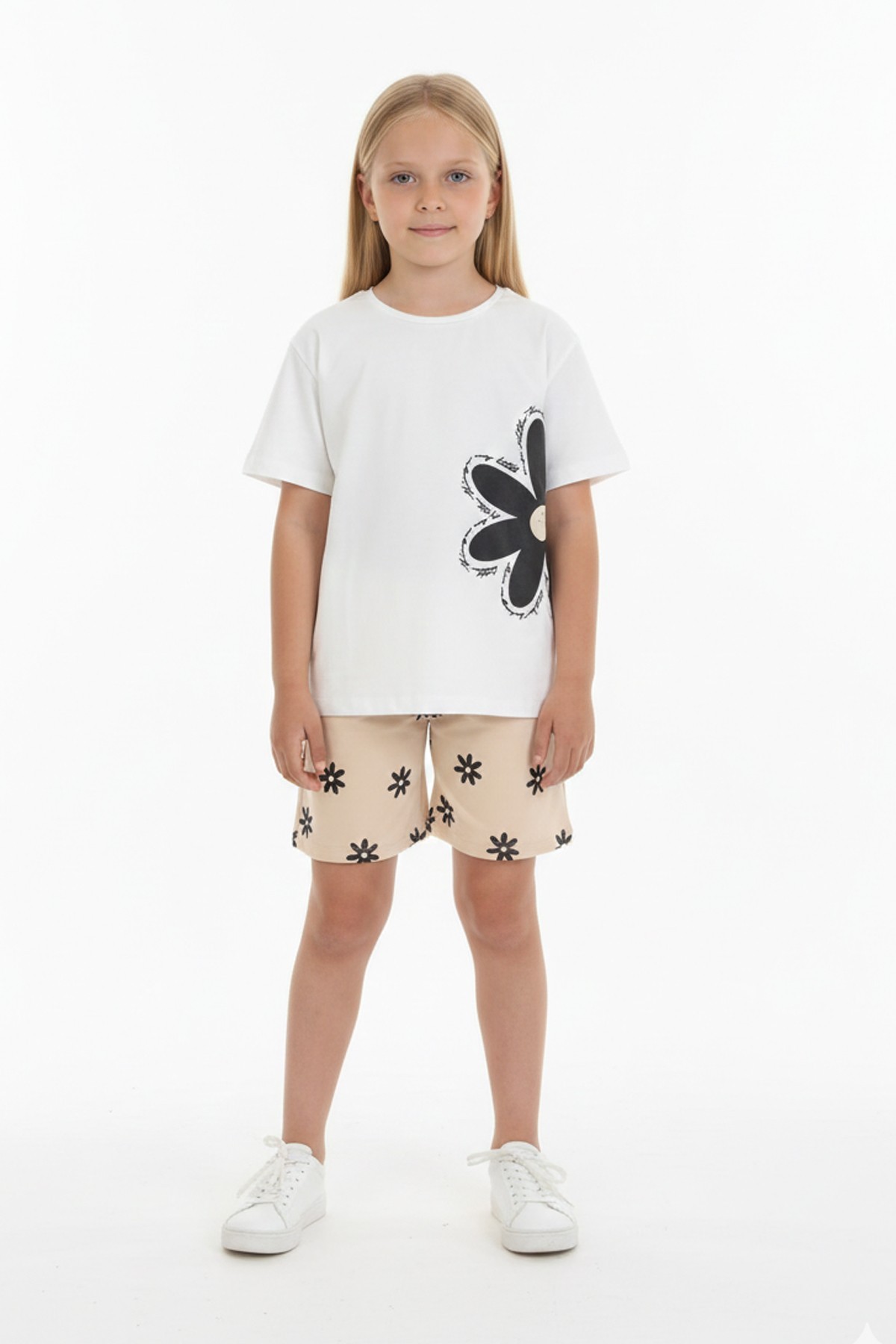 Kız Çocuk Papatya Baskılı Kısa Kollu Tişört Ve Çiçek Desenli Şortlu Pamuklu Takımı
