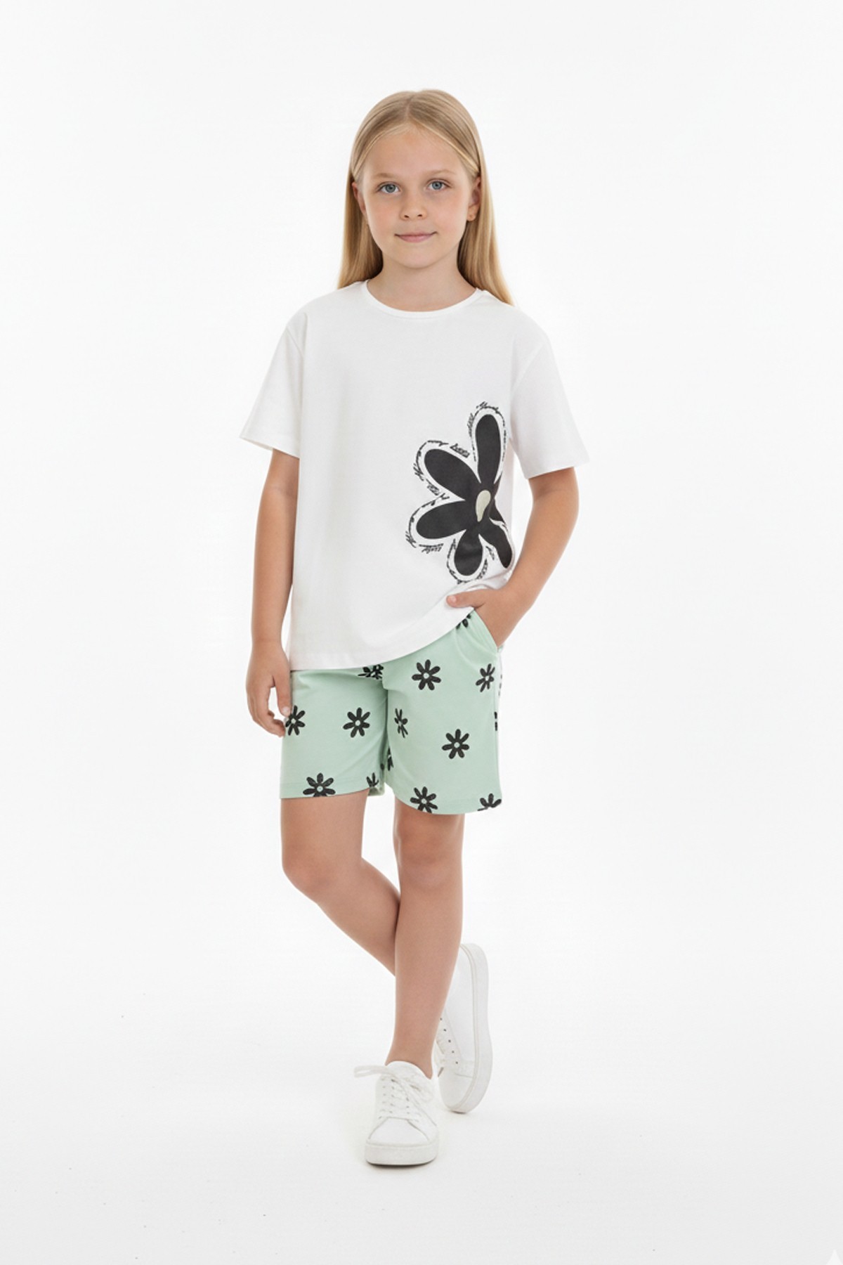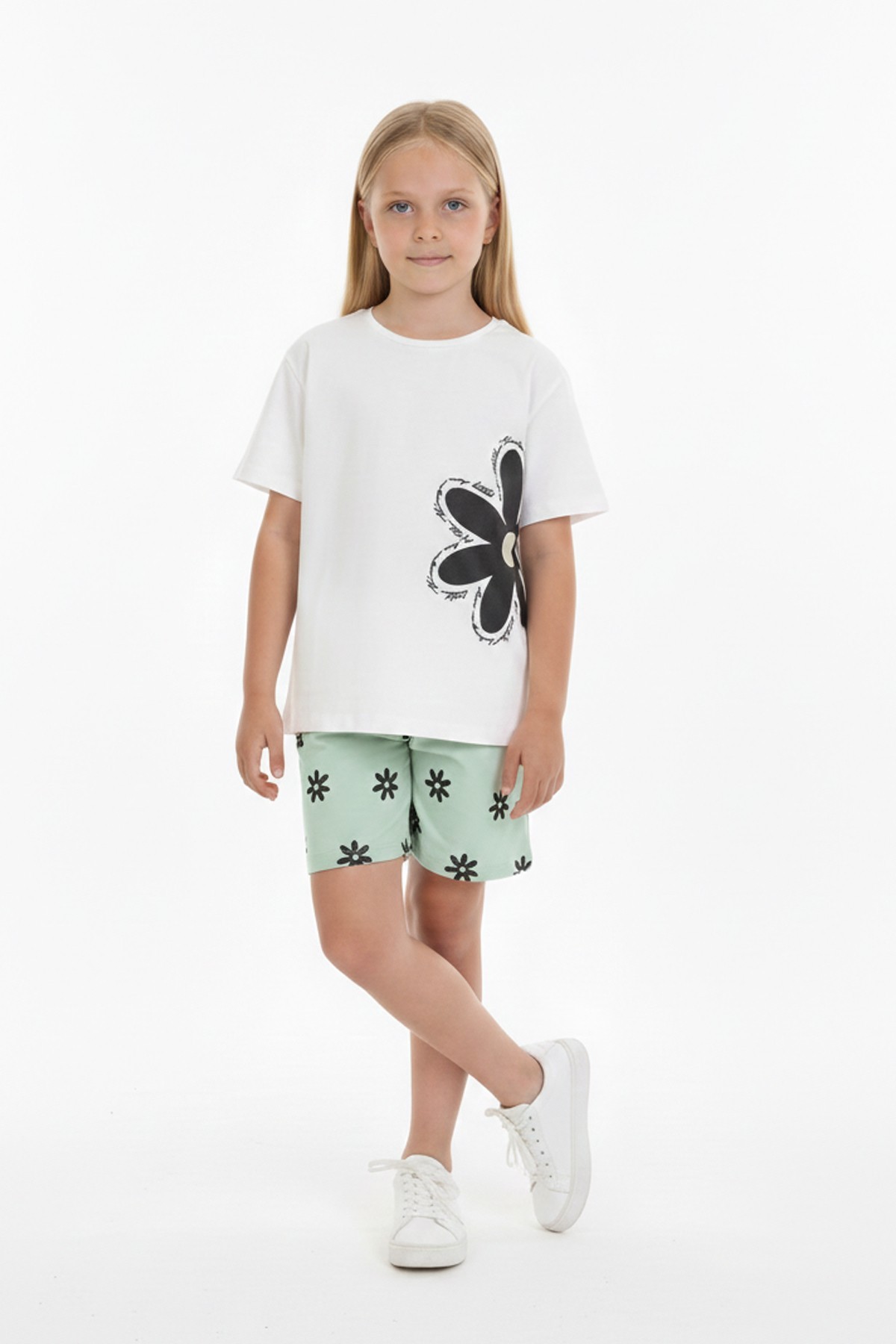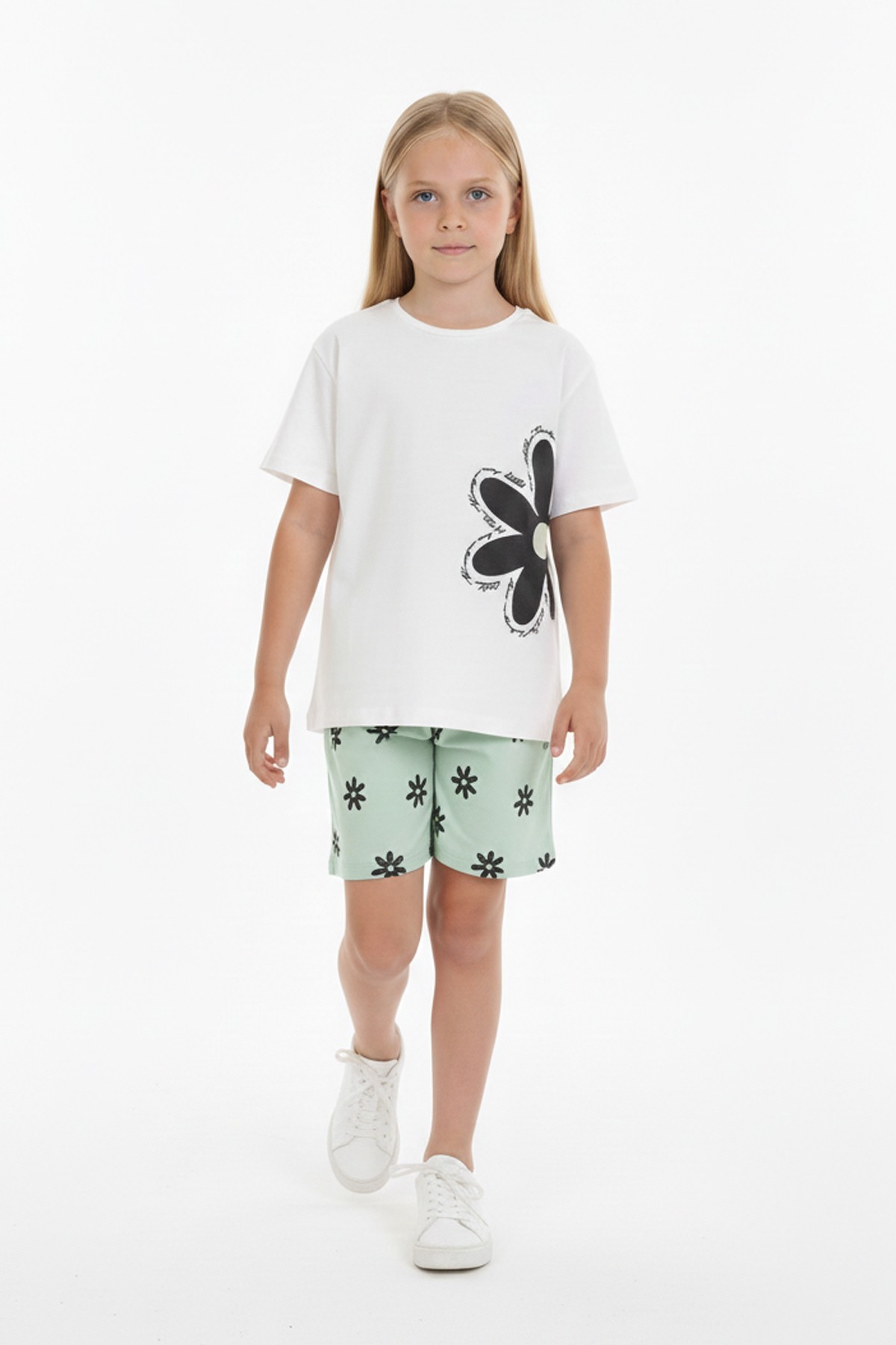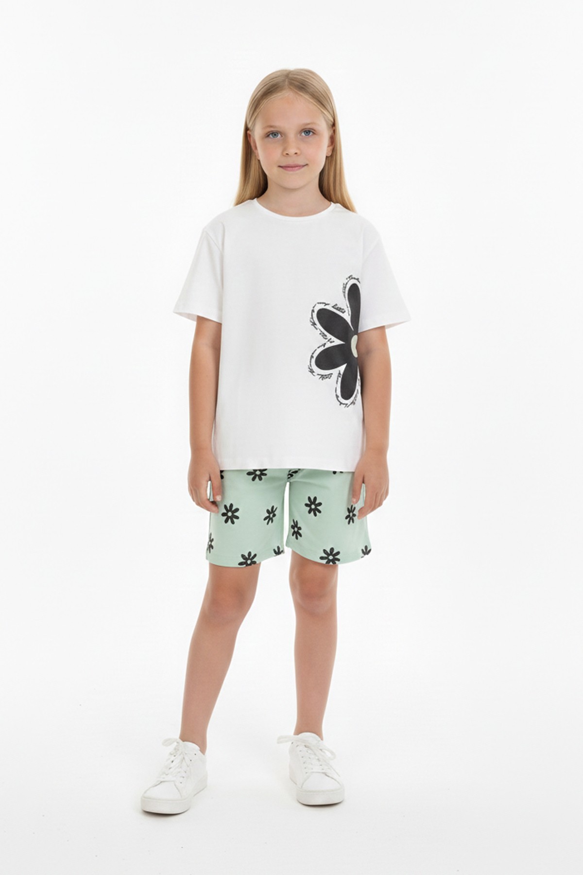 Kız Çocuk Papatya Baskılı Kısa Kollu Tişört Ve Çiçek Desenli Şortlu Pamuklu Takımı