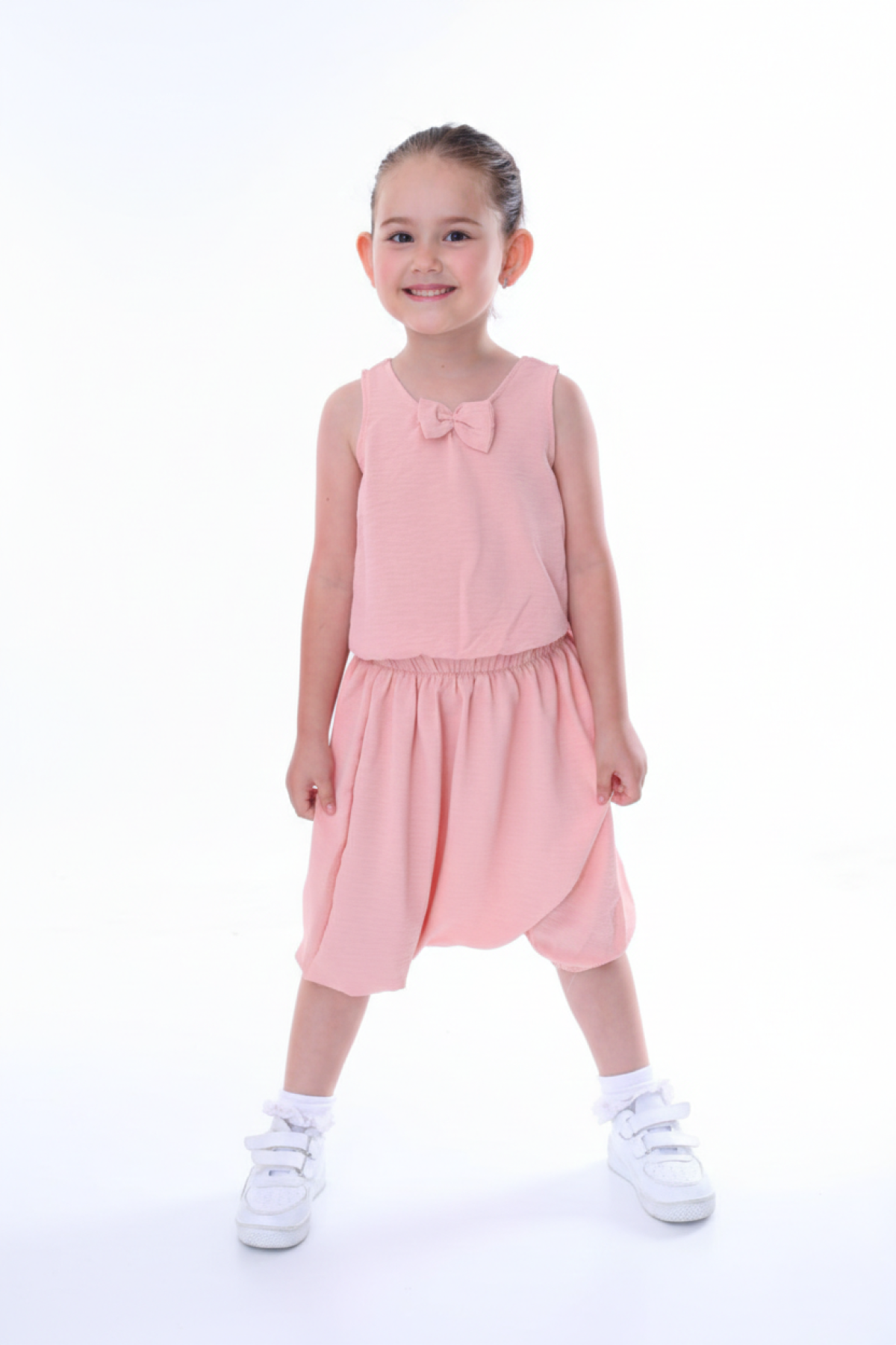 Kız Çocuk Kolsuz V Yaka Fiyonk Detaylı Şalvar Kesim Rahat Yazlık Takım
