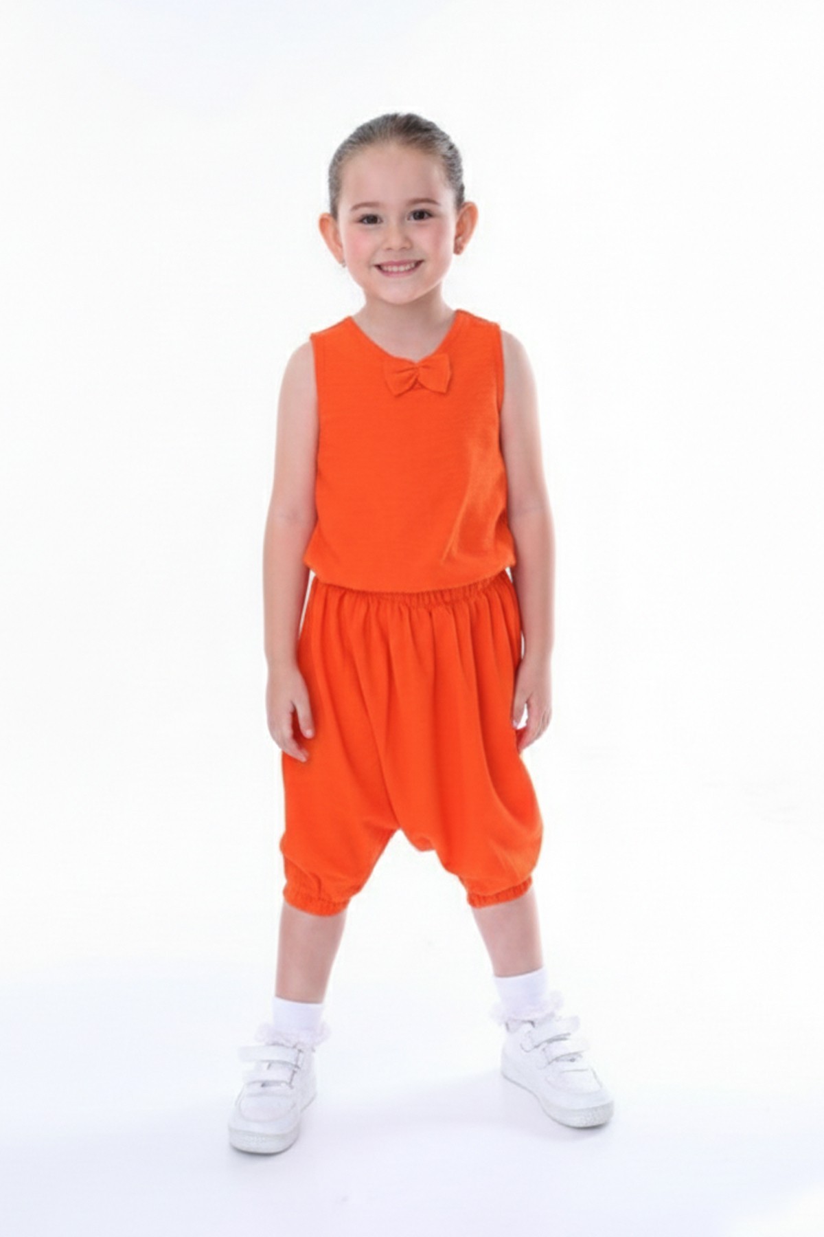 Kız Çocuk Kolsuz V Yaka Fiyonk Detaylı Şalvar Kesim Rahat Yazlık Takım