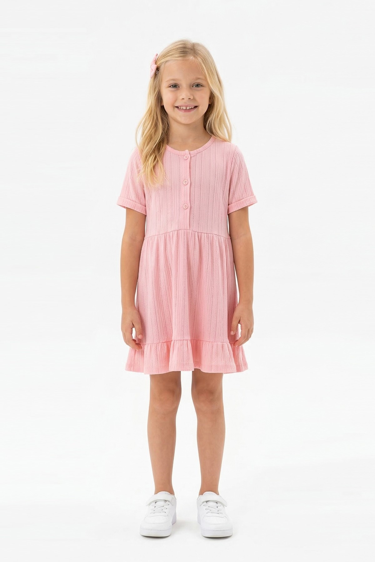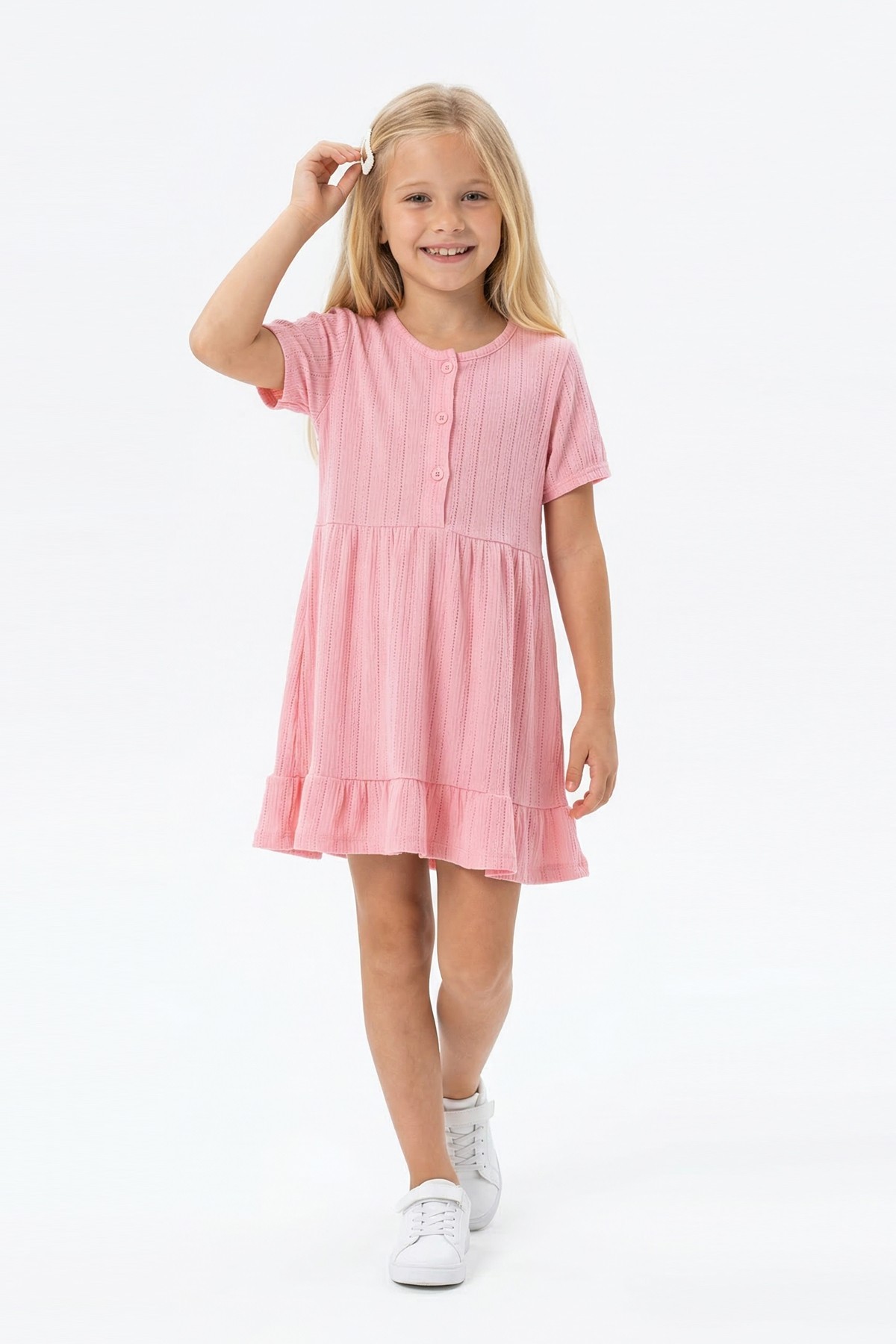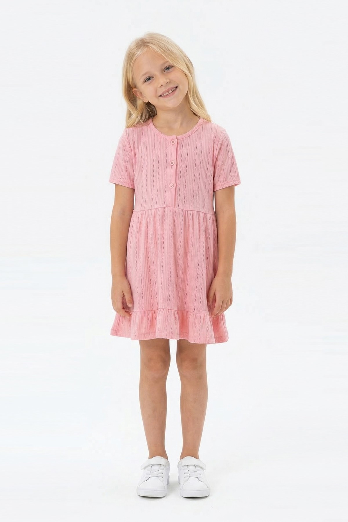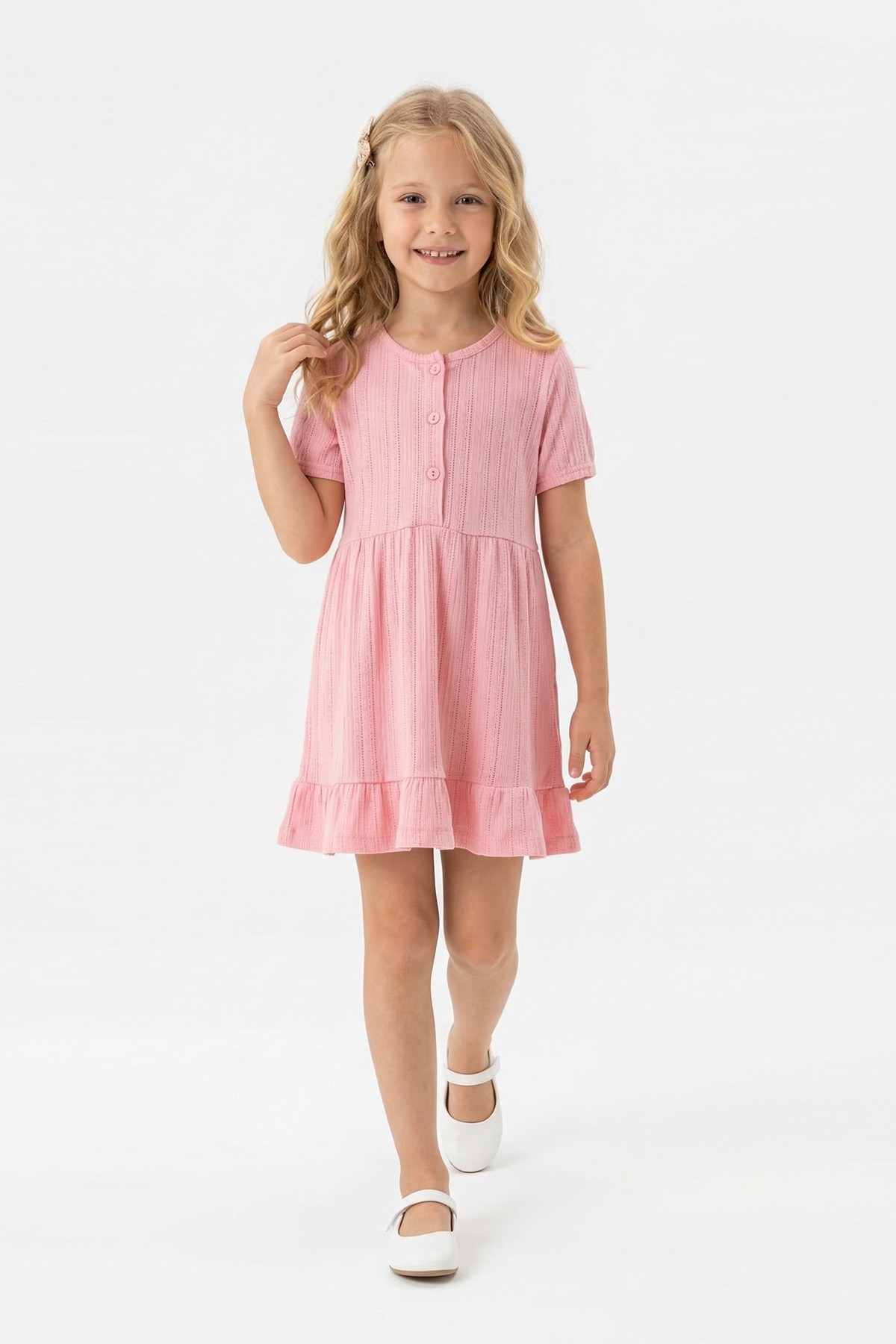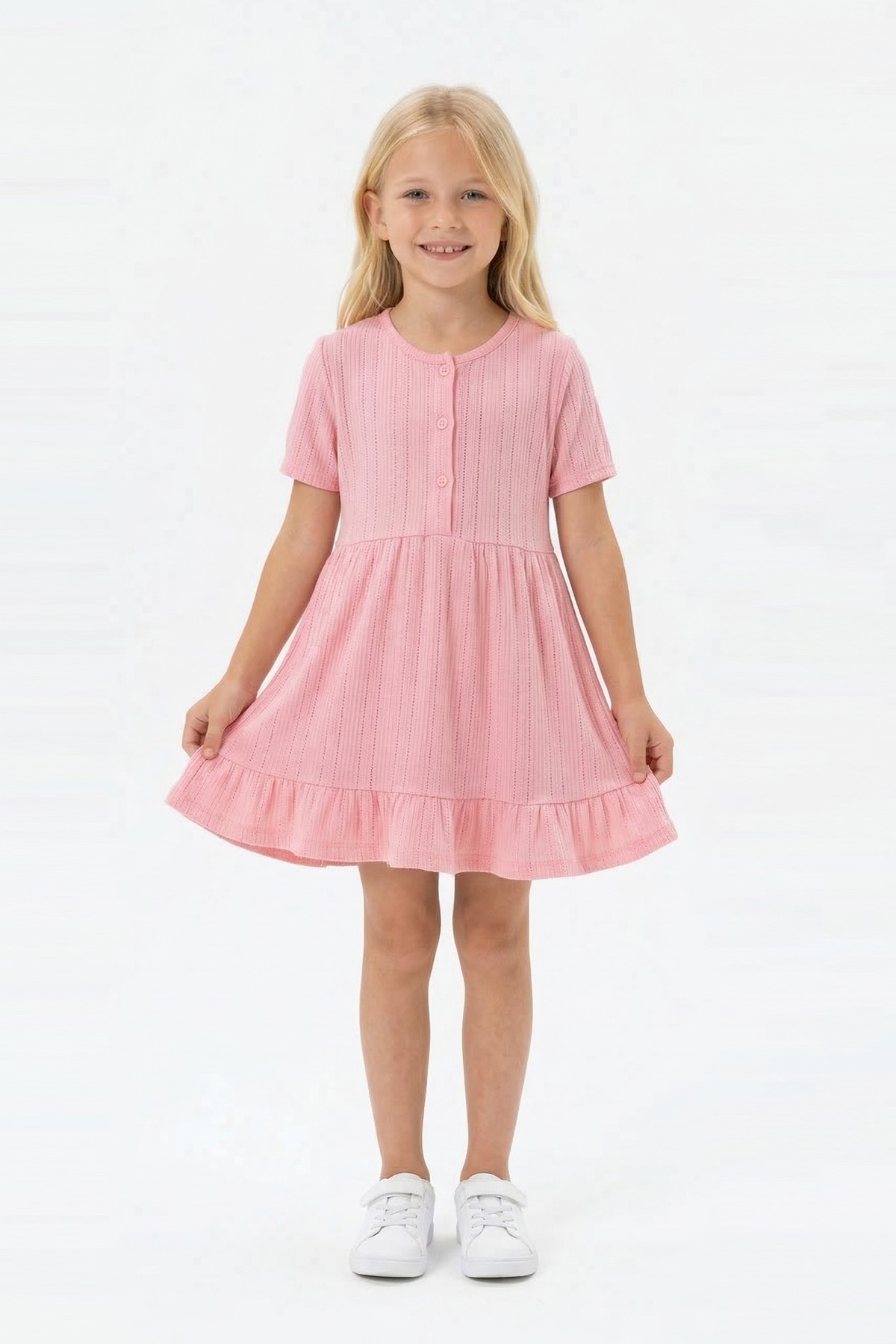 Kız Çocuk Kısa Kollu Düğme Detaylı Ve Etek Ucu Fırfırlı Pamuklu Yazlık Elbise