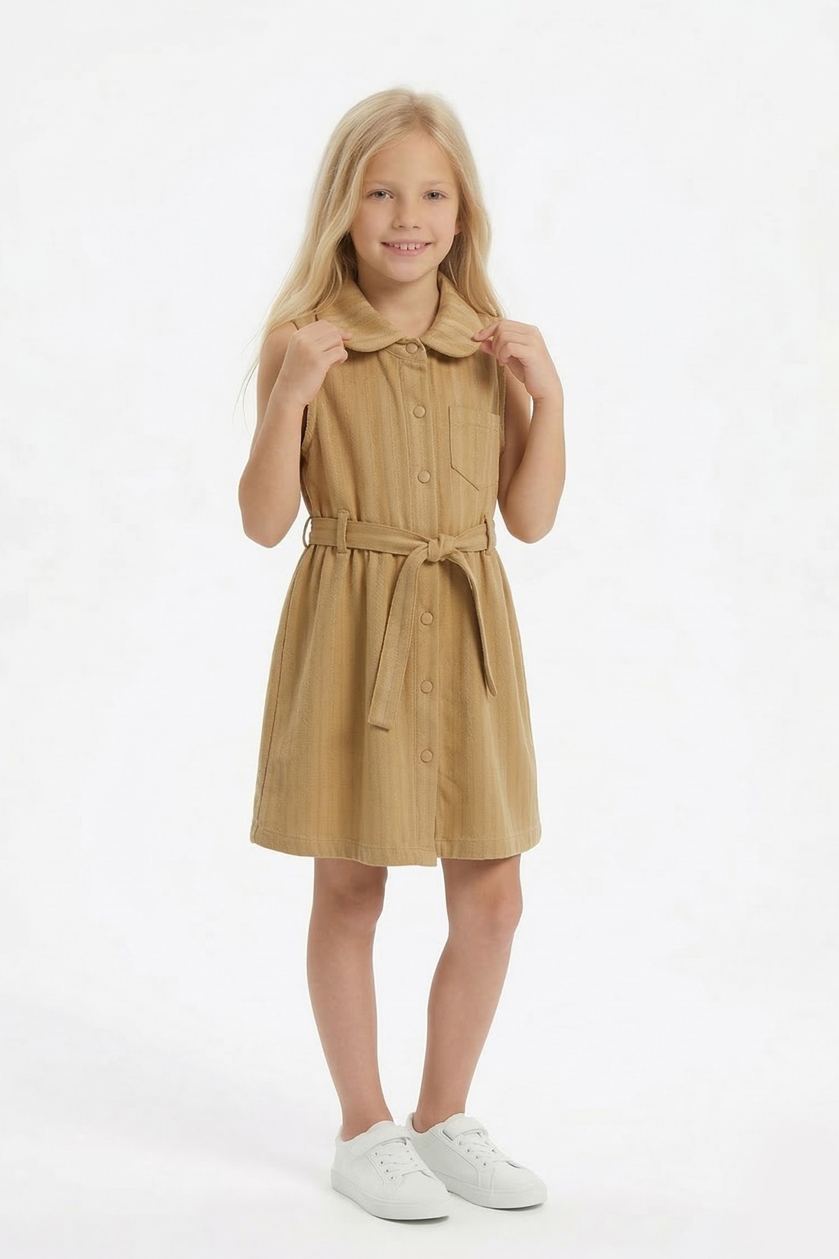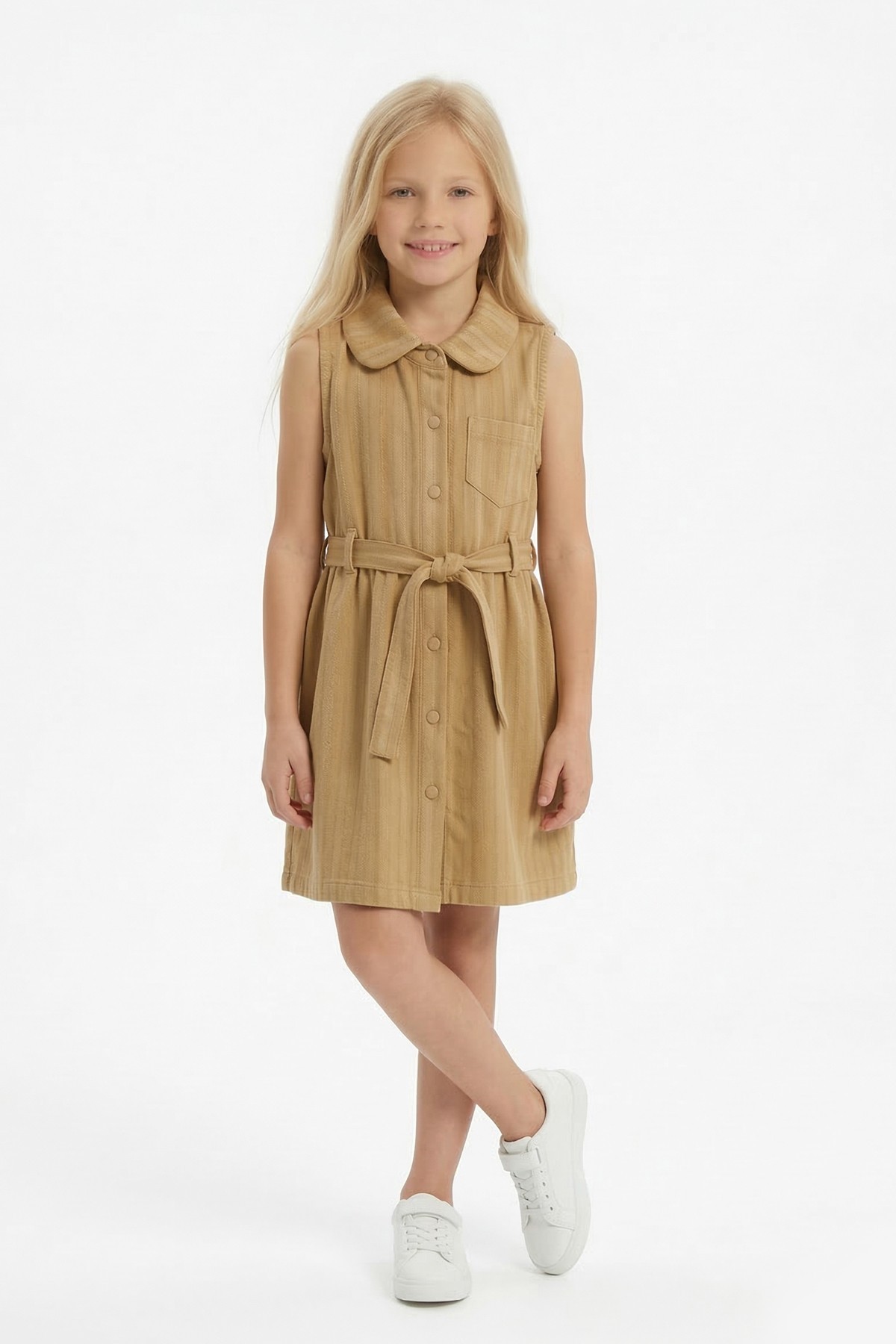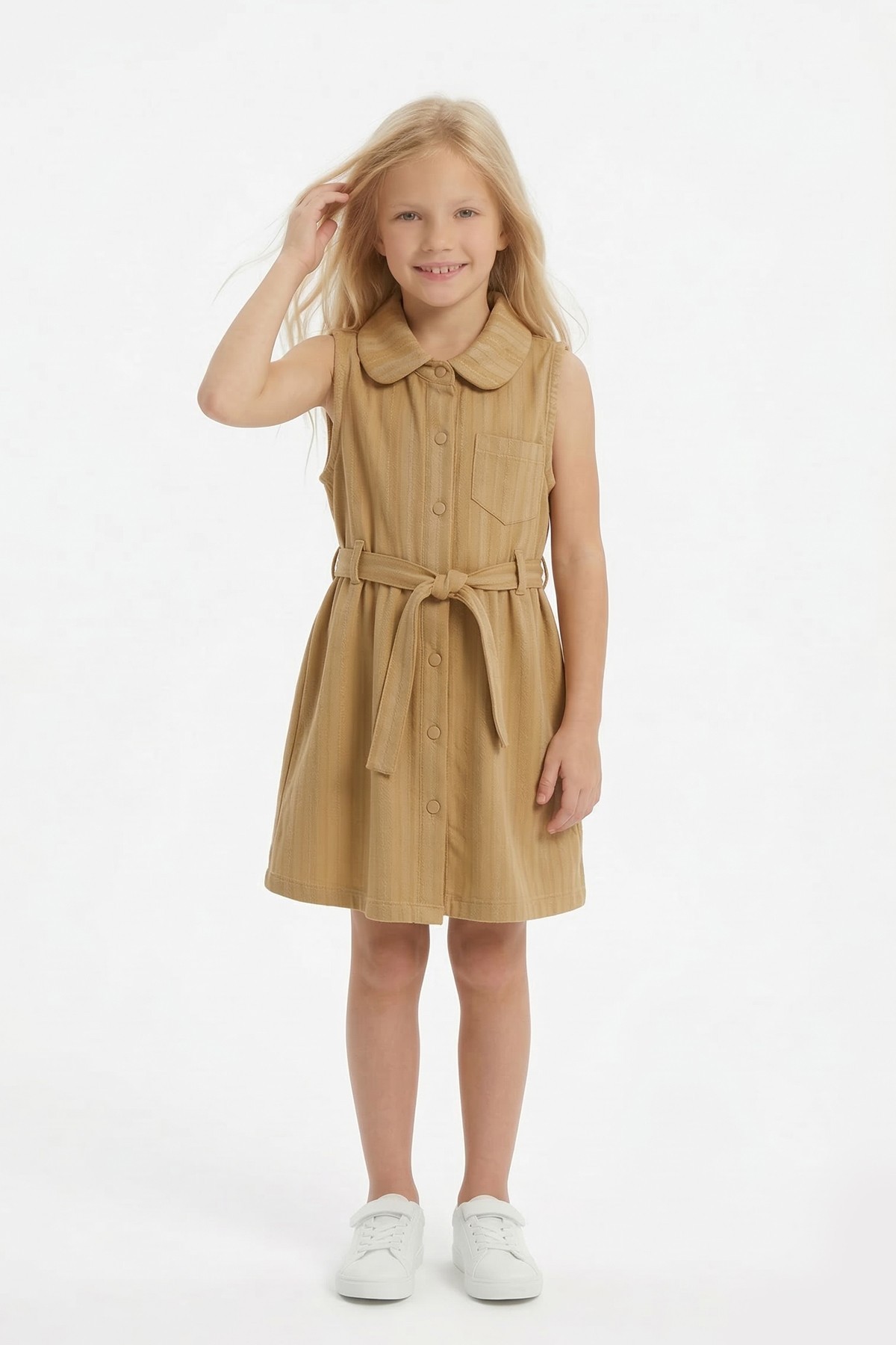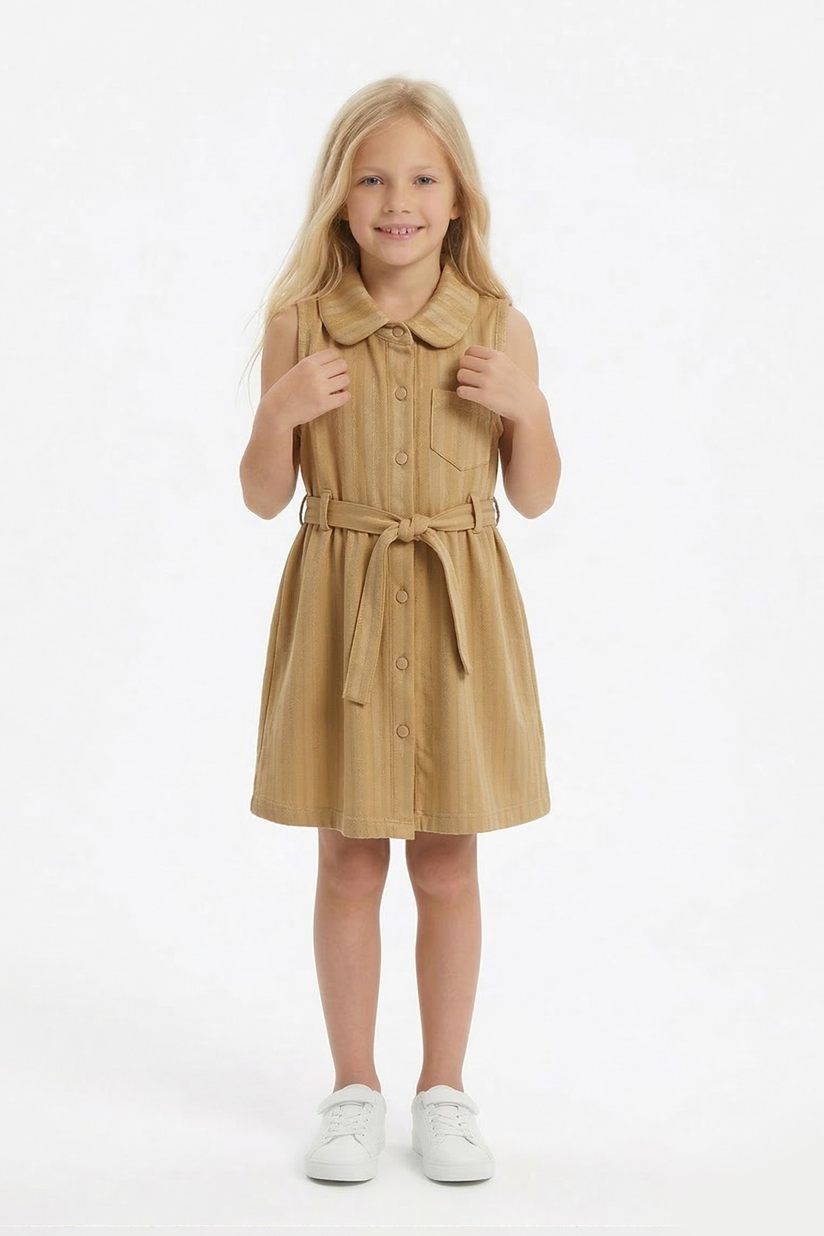 Kız Çocuk Çizgili Kolsuz Bebek Yaka Önden Düğmeli Ve Belden Bağlamalı Pamuklu Yazlık Elbise