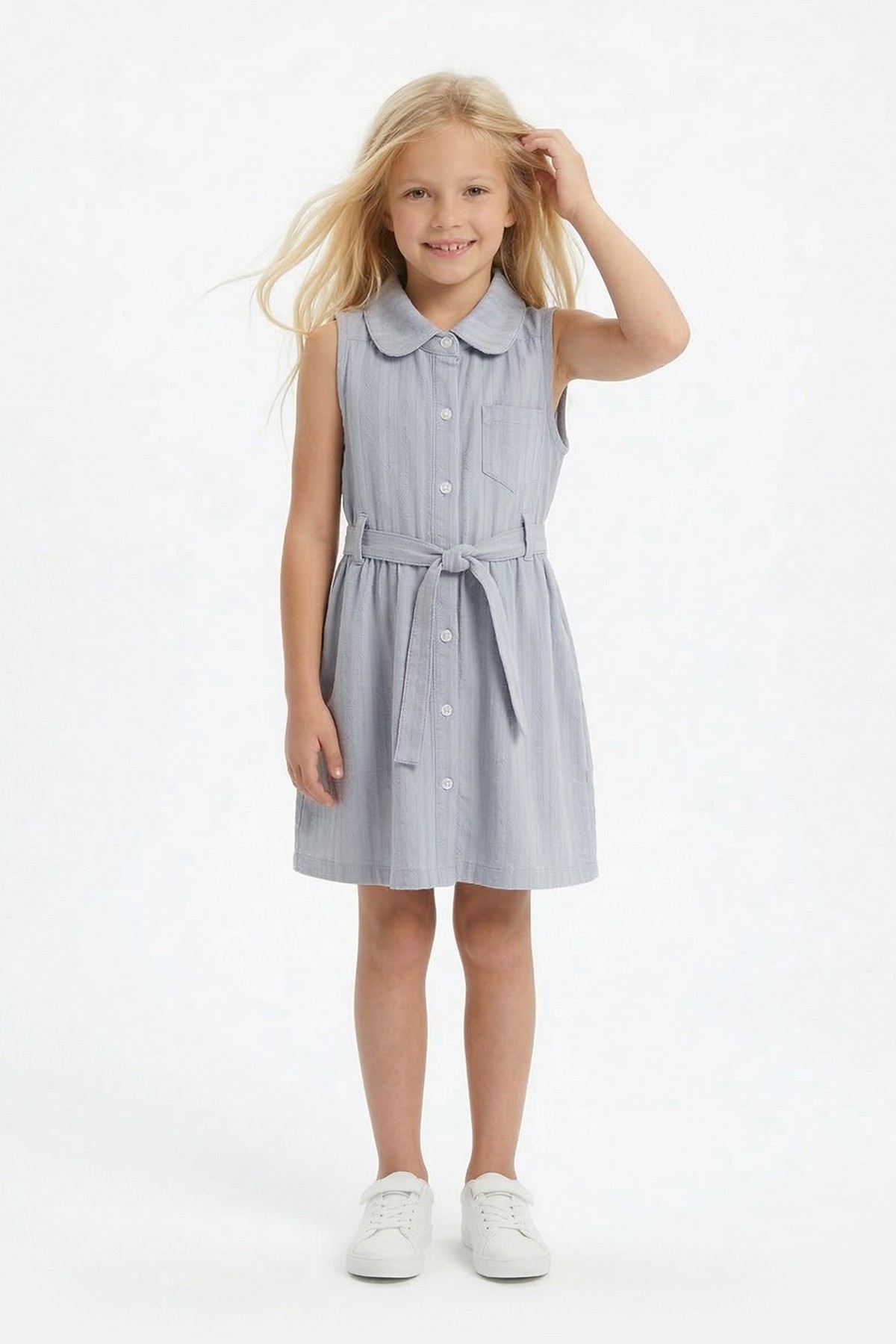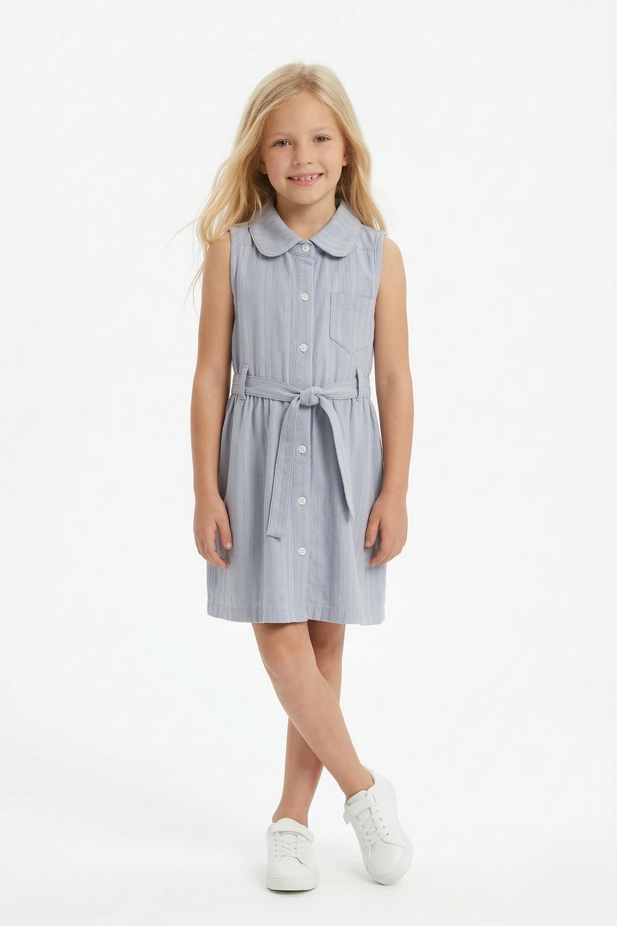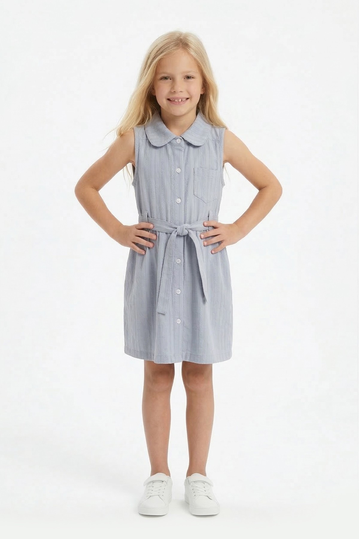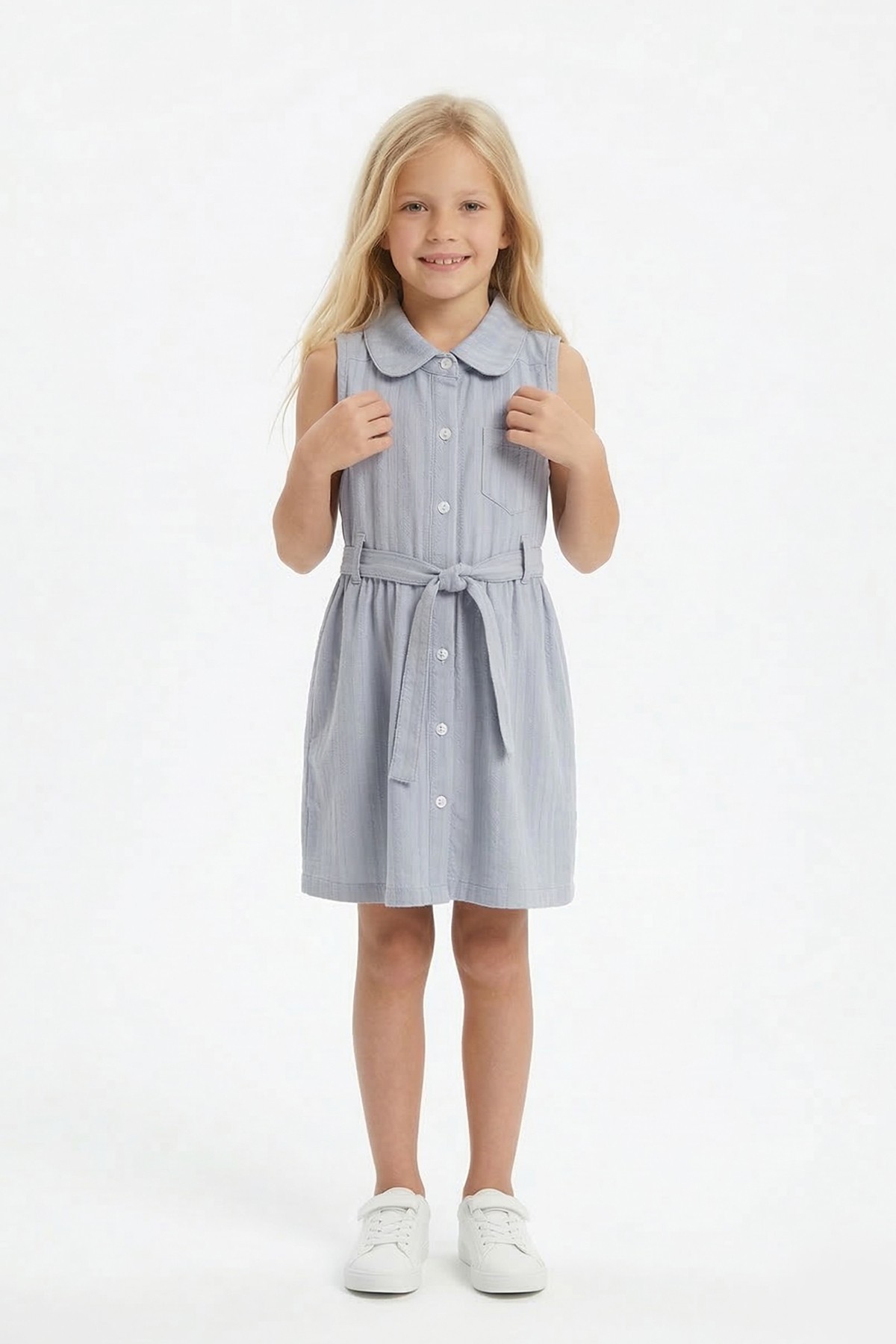 Kız Çocuk Çizgili Kolsuz Bebek Yaka Önden Düğmeli Ve Belden Bağlamalı Pamuklu Yazlık Elbise