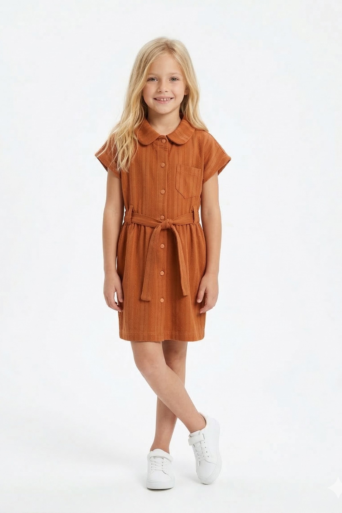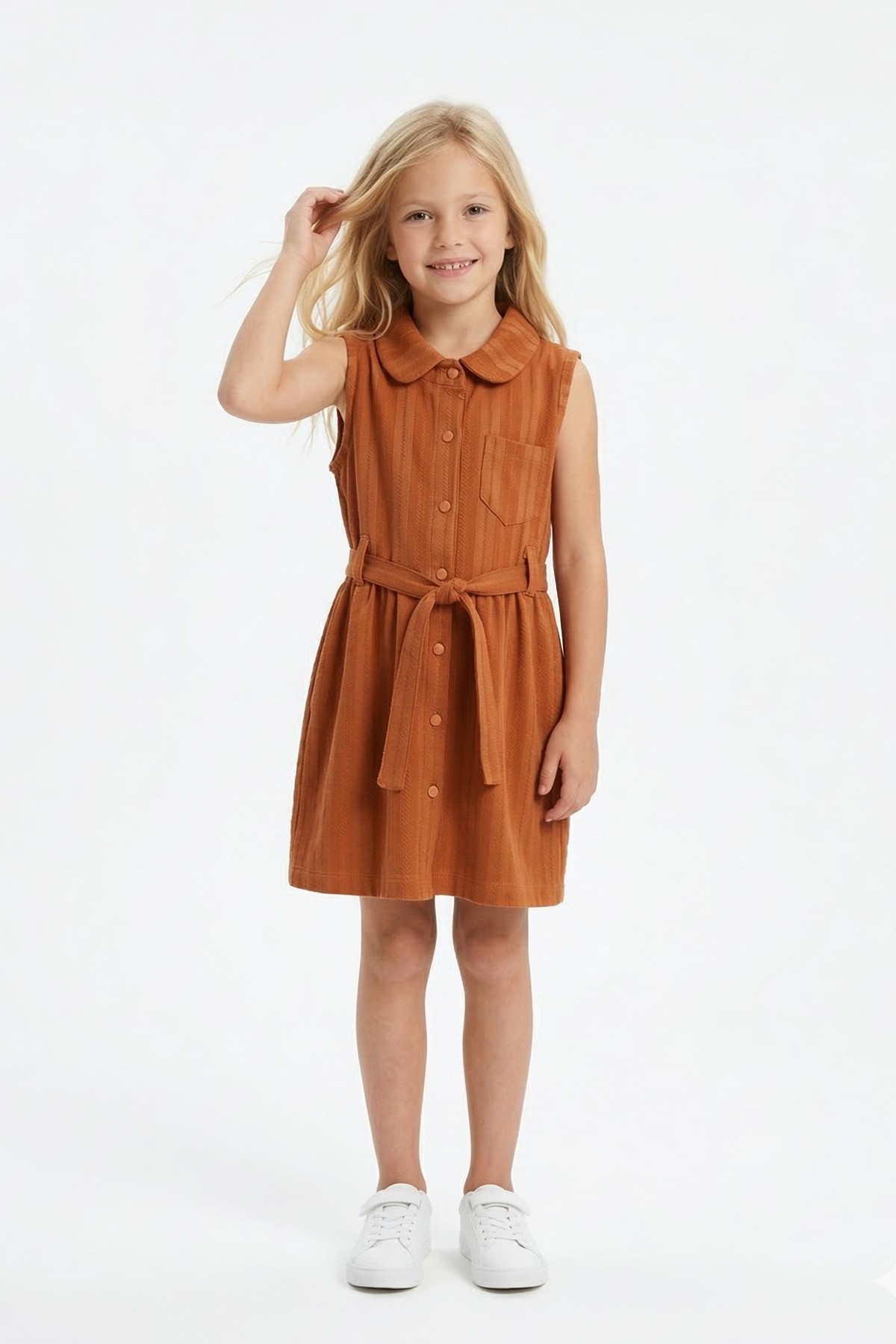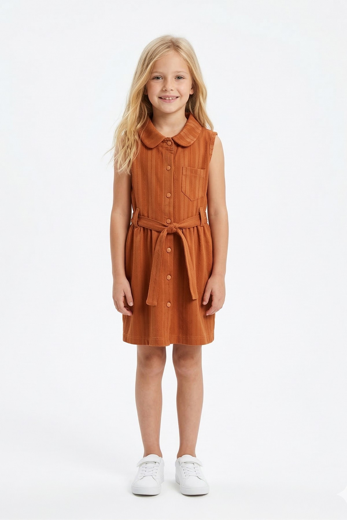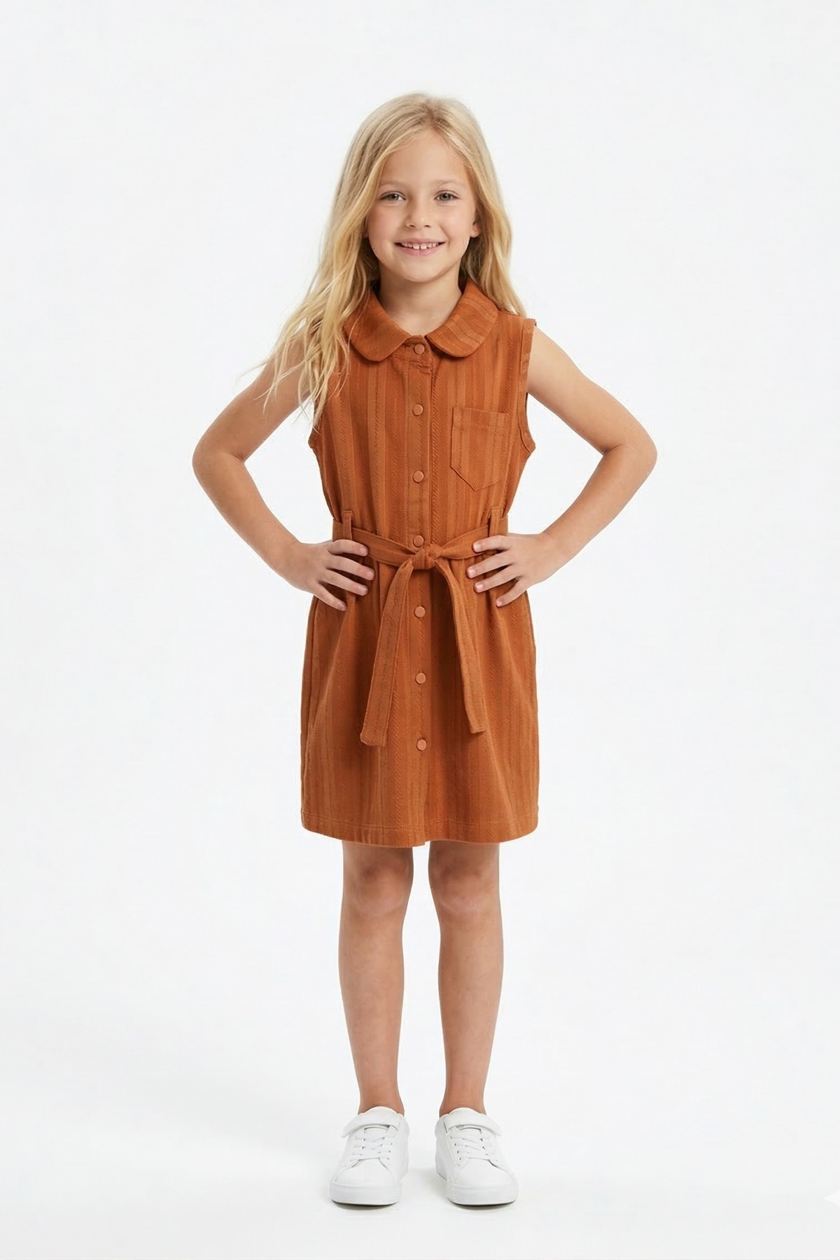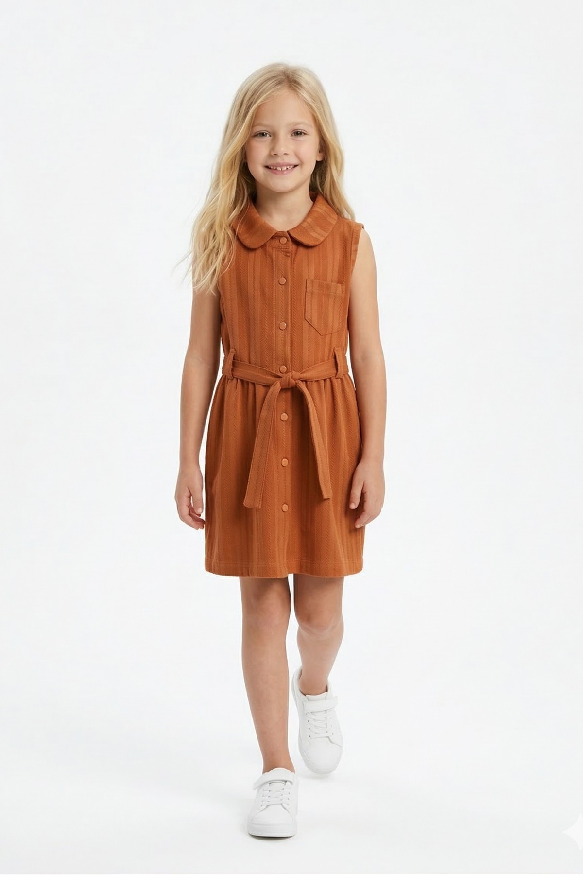 Kız Çocuk Çizgili Kolsuz Bebek Yaka Önden Düğmeli Ve Belden Bağlamalı Pamuklu Yazlık Elbise