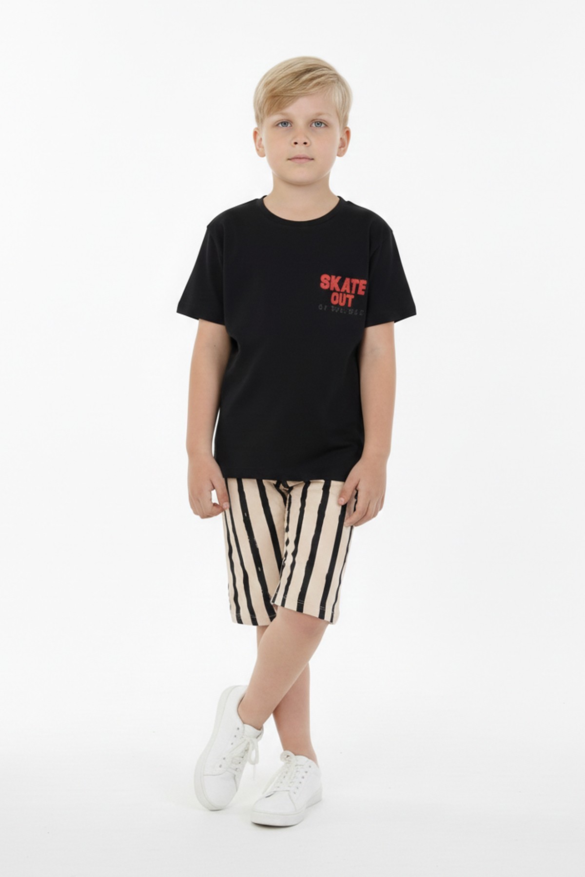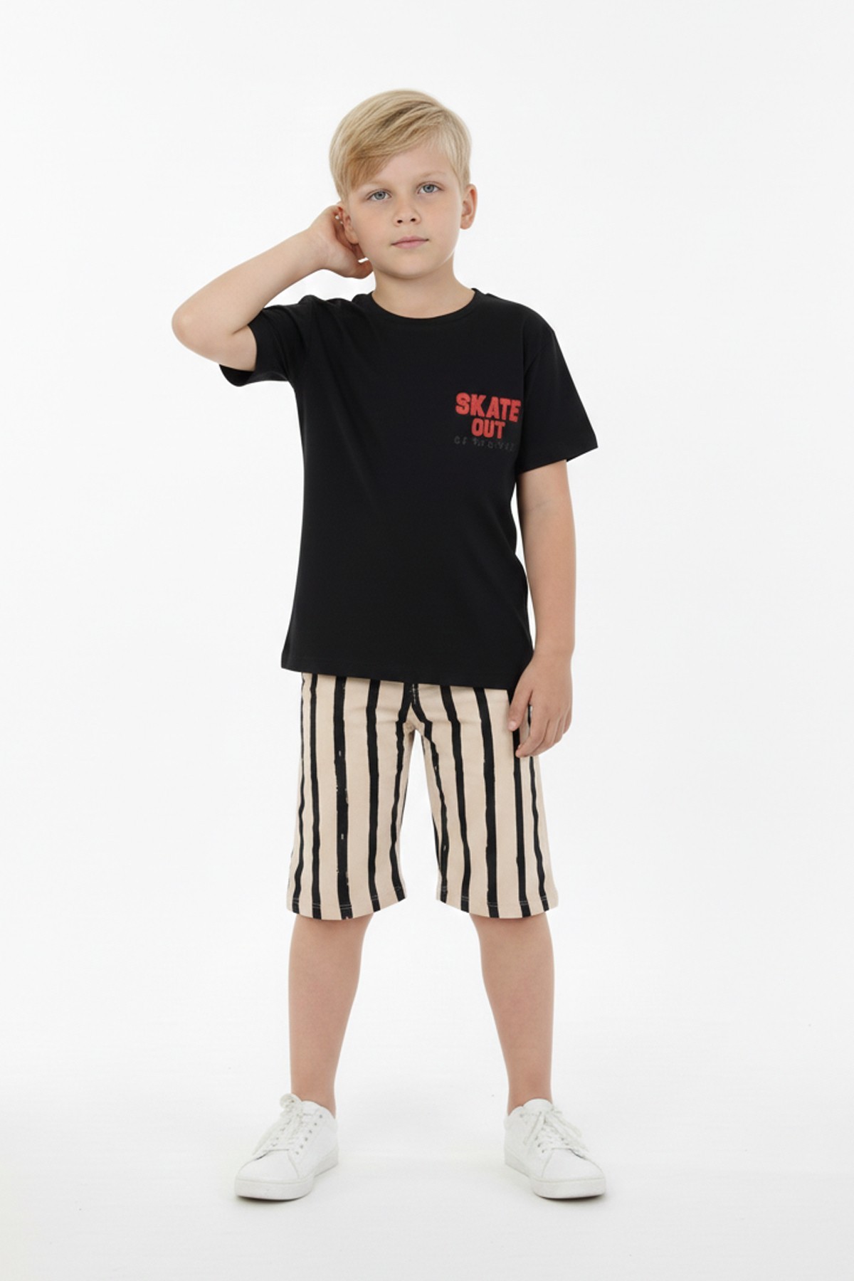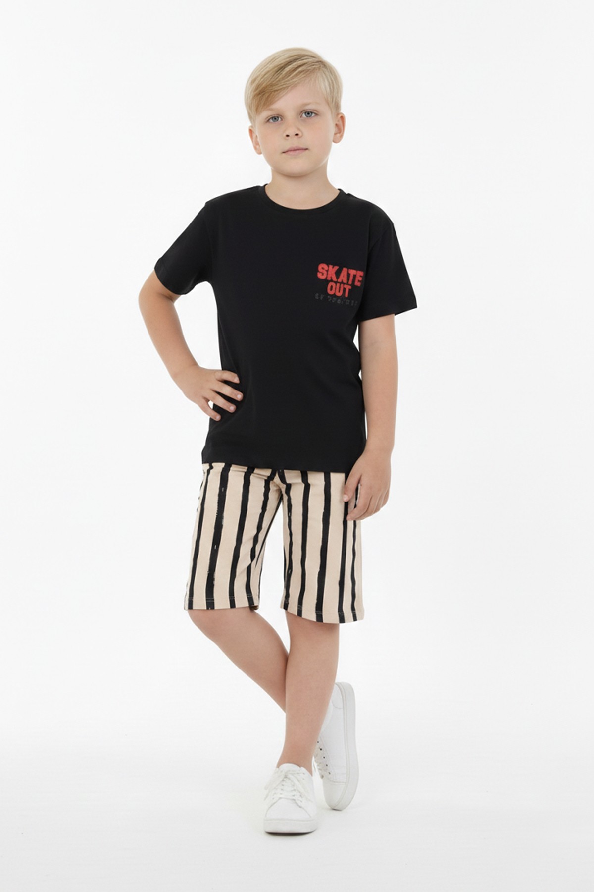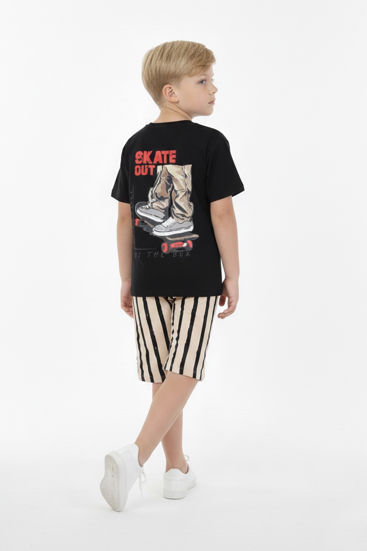 Erkek Çocuk Arkası Baskılı %100 Pamuk Reaktif Boyama Çizgili Şortlu Takım