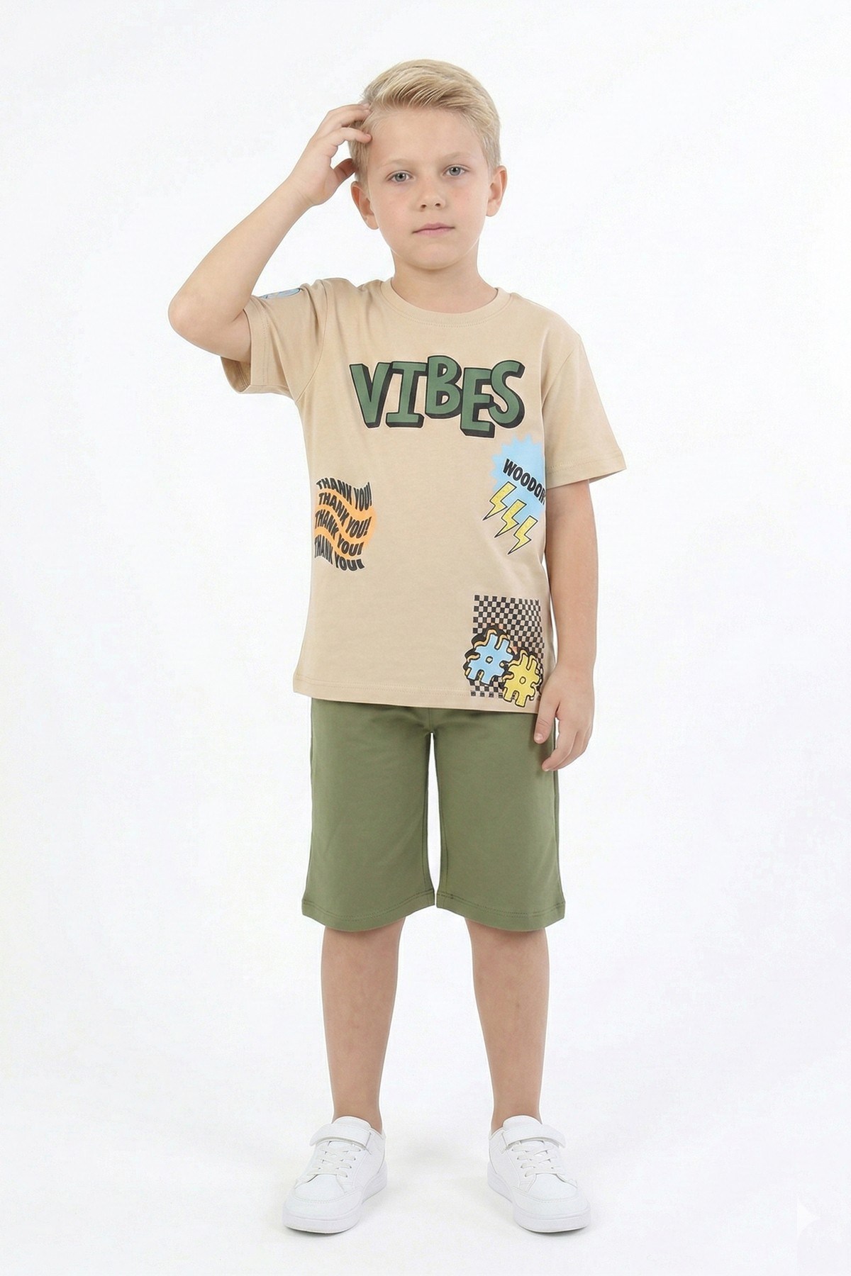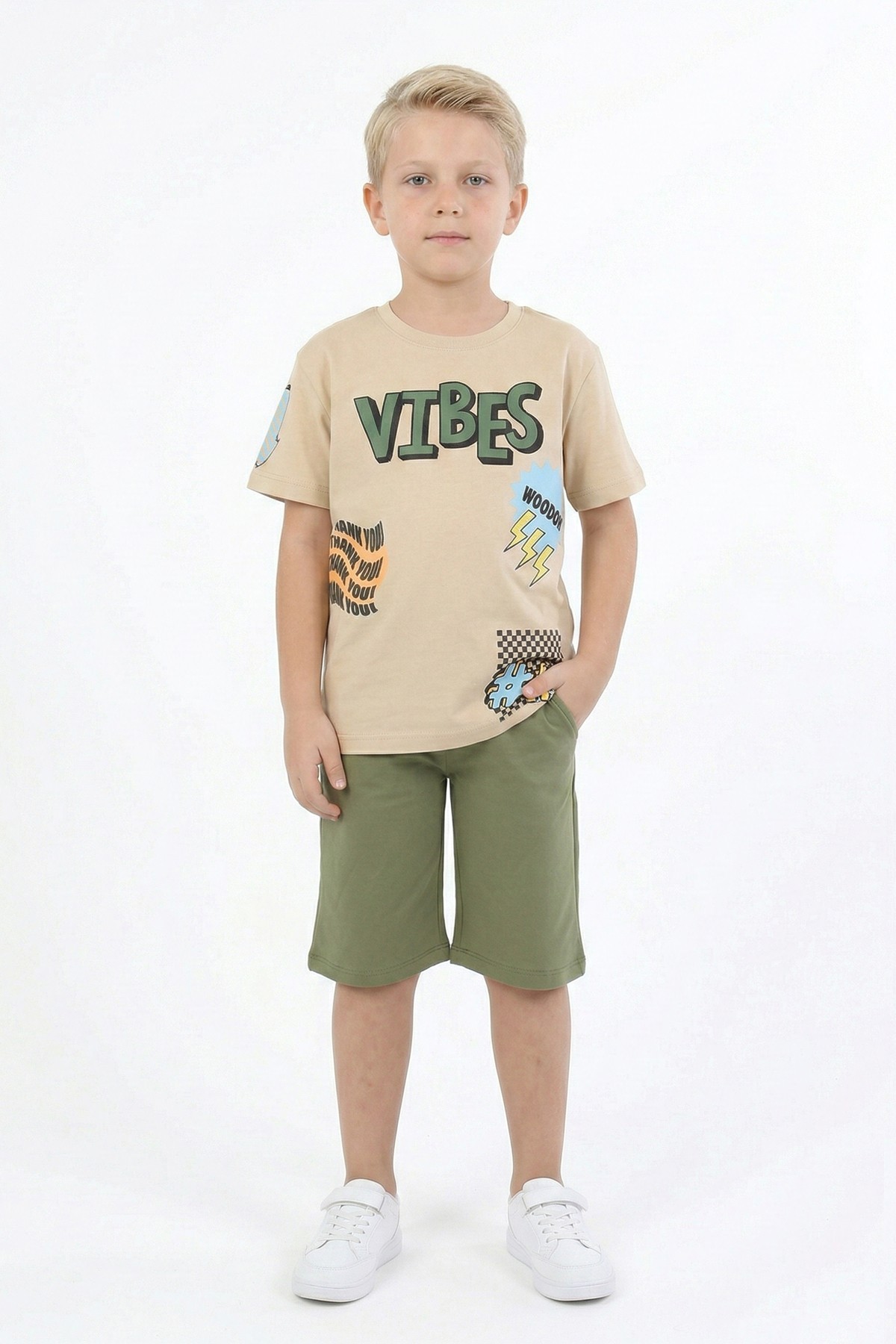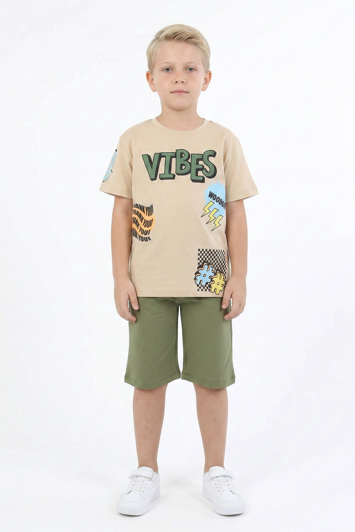 Erkek Çocuk Baskılı %100 Pamuk Süprem Kumaş Reaktif Boyama Şortlu Takım