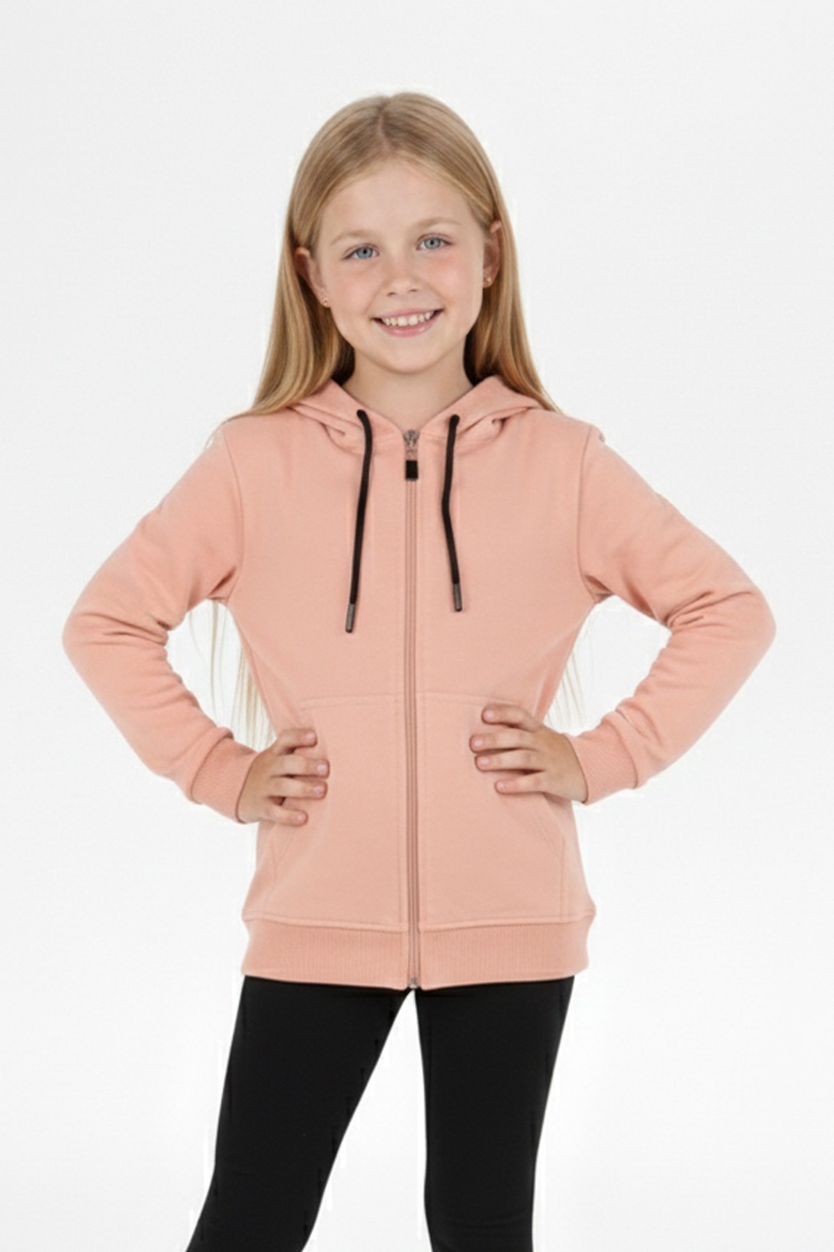 Kız Çocuk Fermuarlı Kapüşonlu Kanguru Cepli Düz Fırçalı İki İplik Sweatshirt