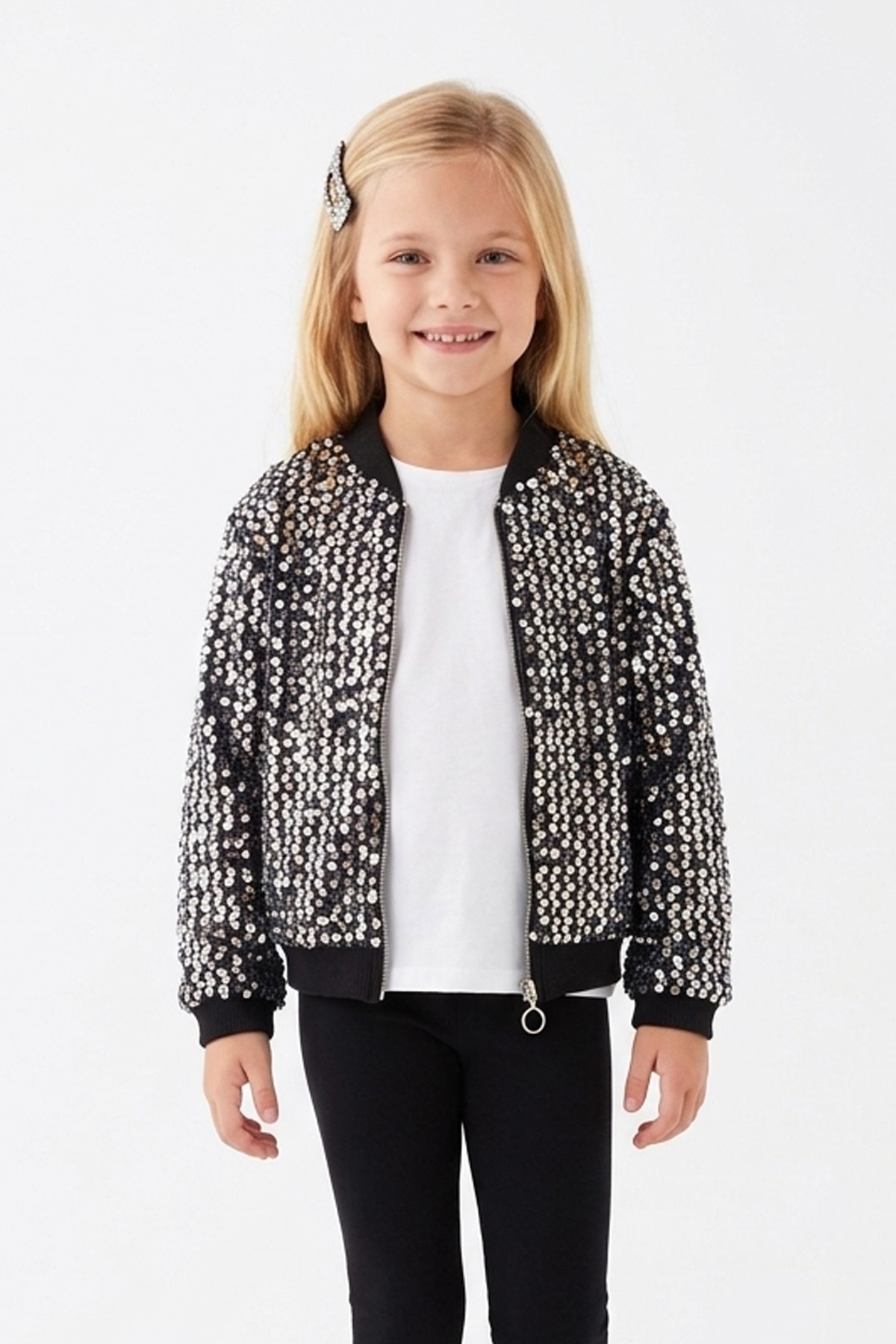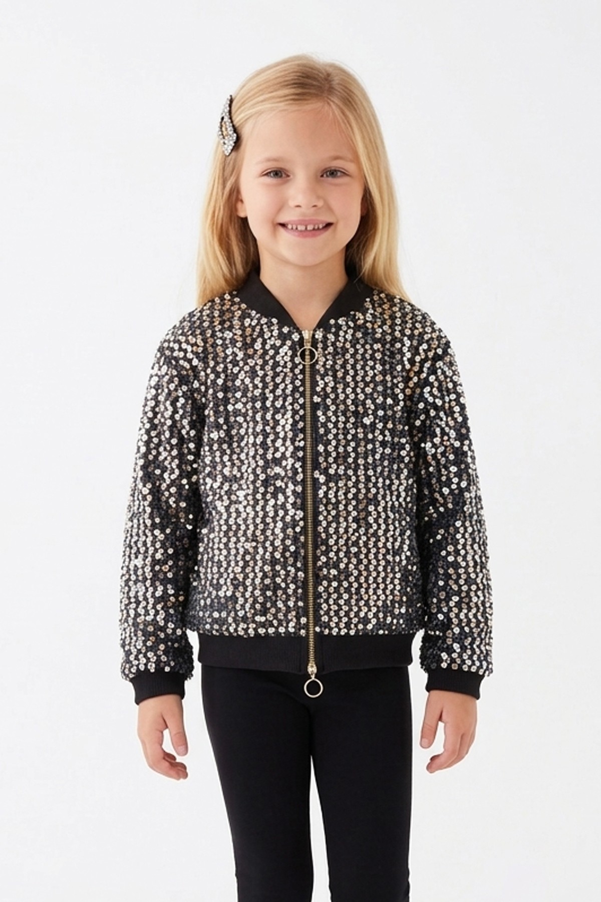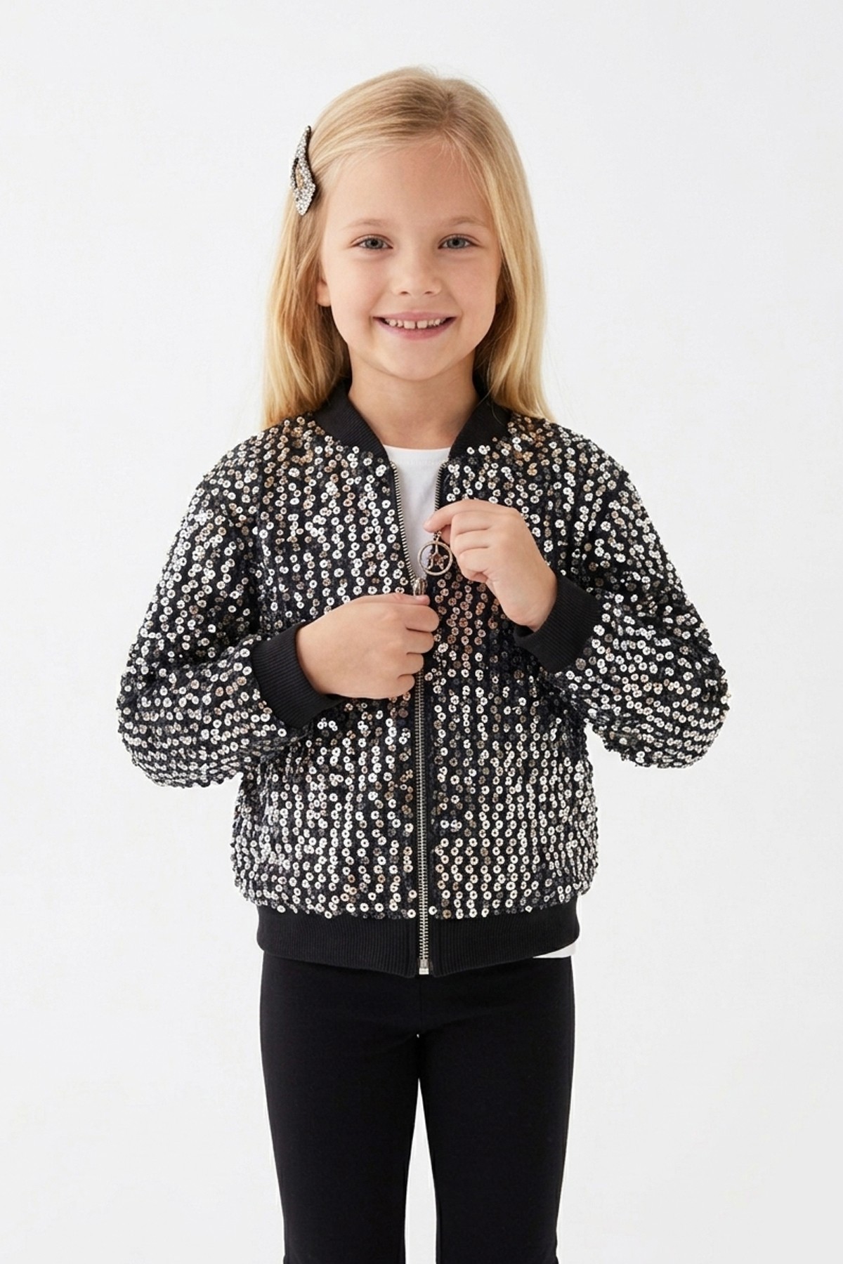 Kız Çocuk Payetli Fermuarlı Bomber Şık Ceket