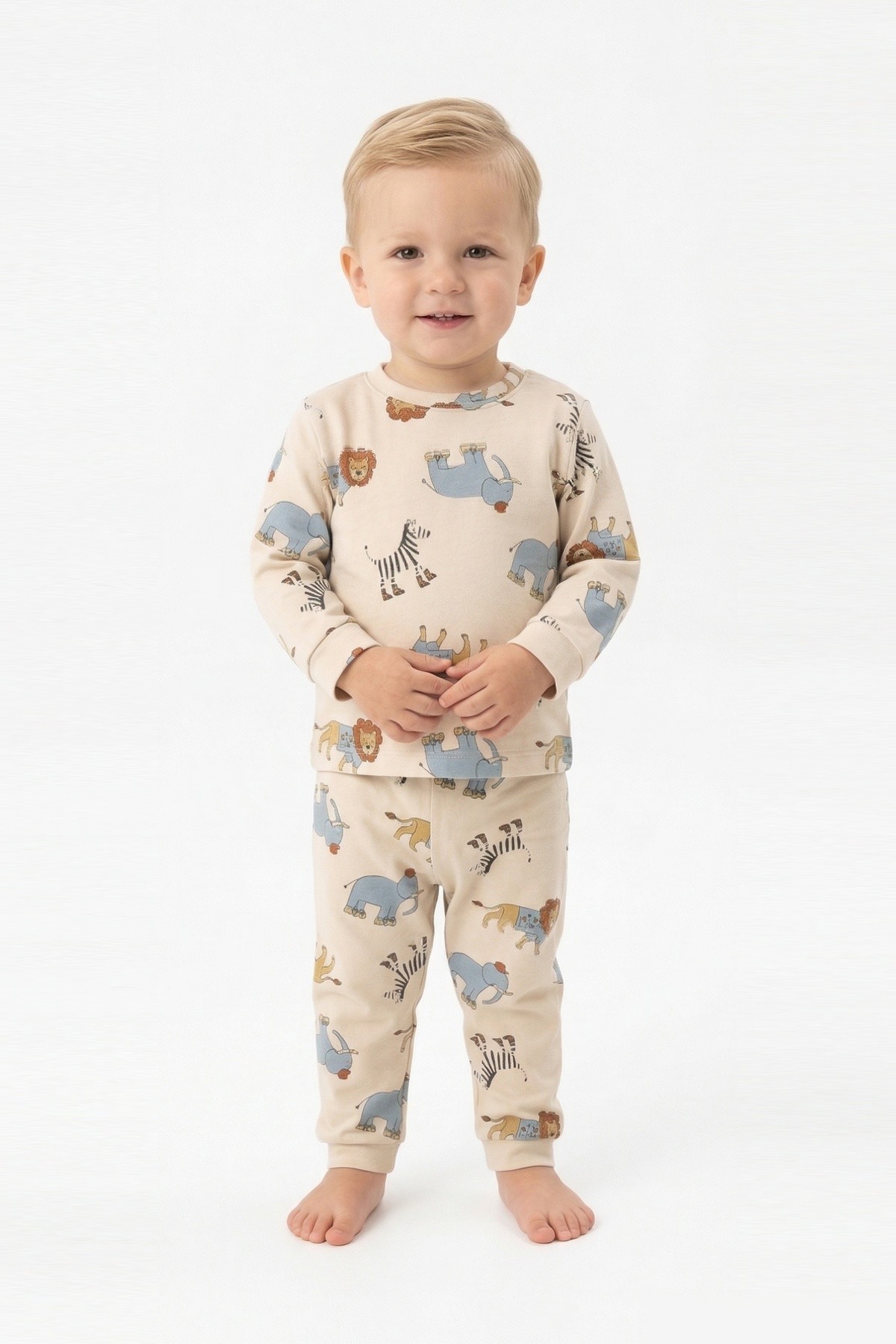 Erkek Bebek Safari Hayvanları Baskılı %100 Pamuk Reaktif Boyama İnterlok Kumaş Uzun Kollu Pijama Takımı