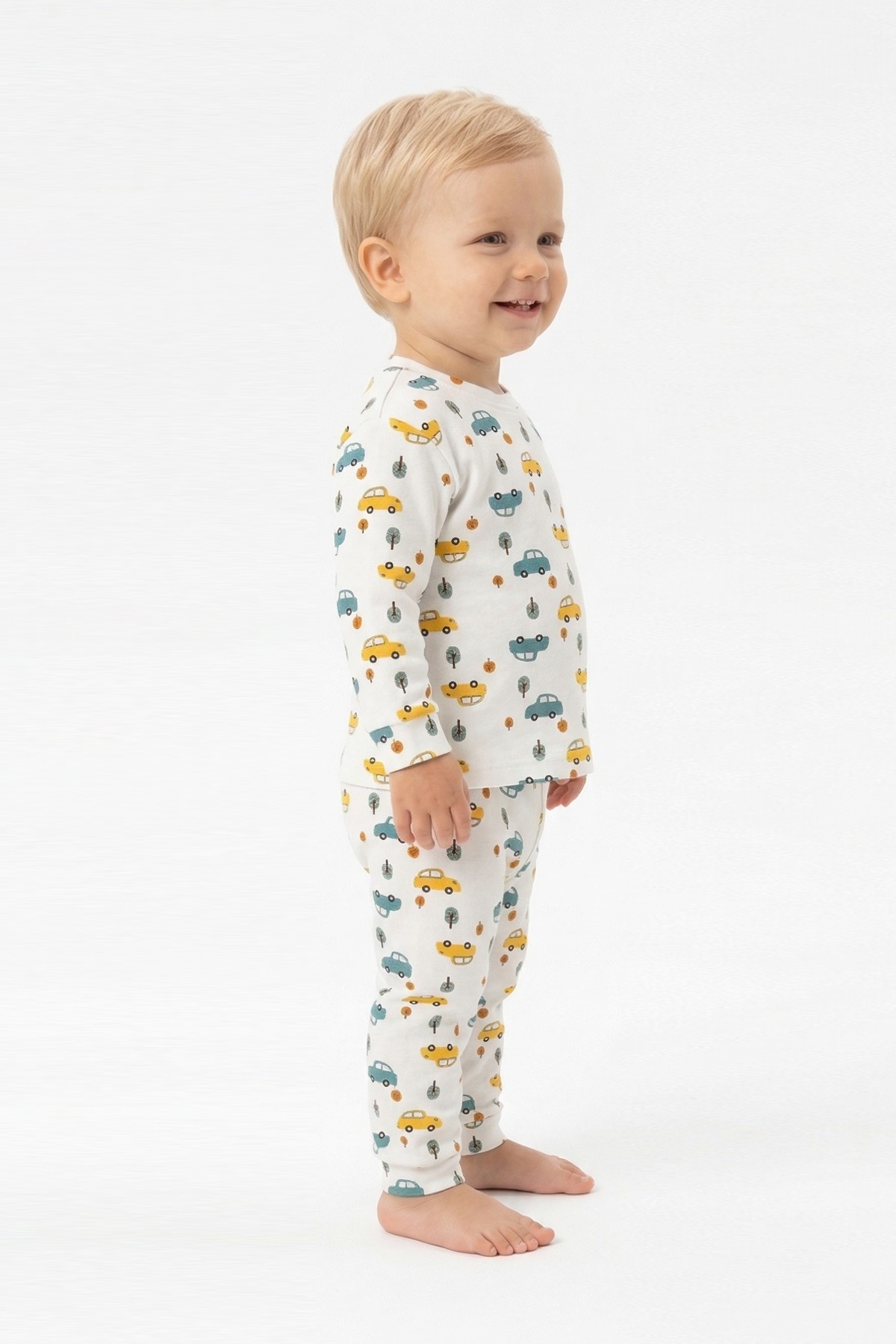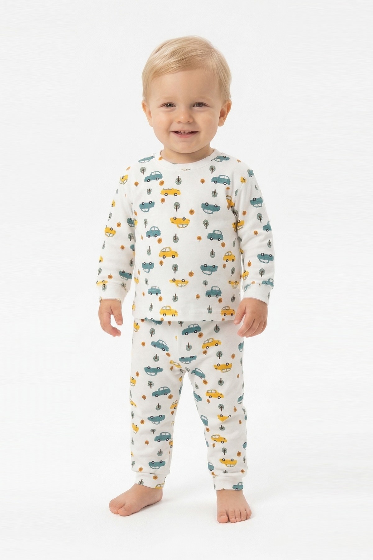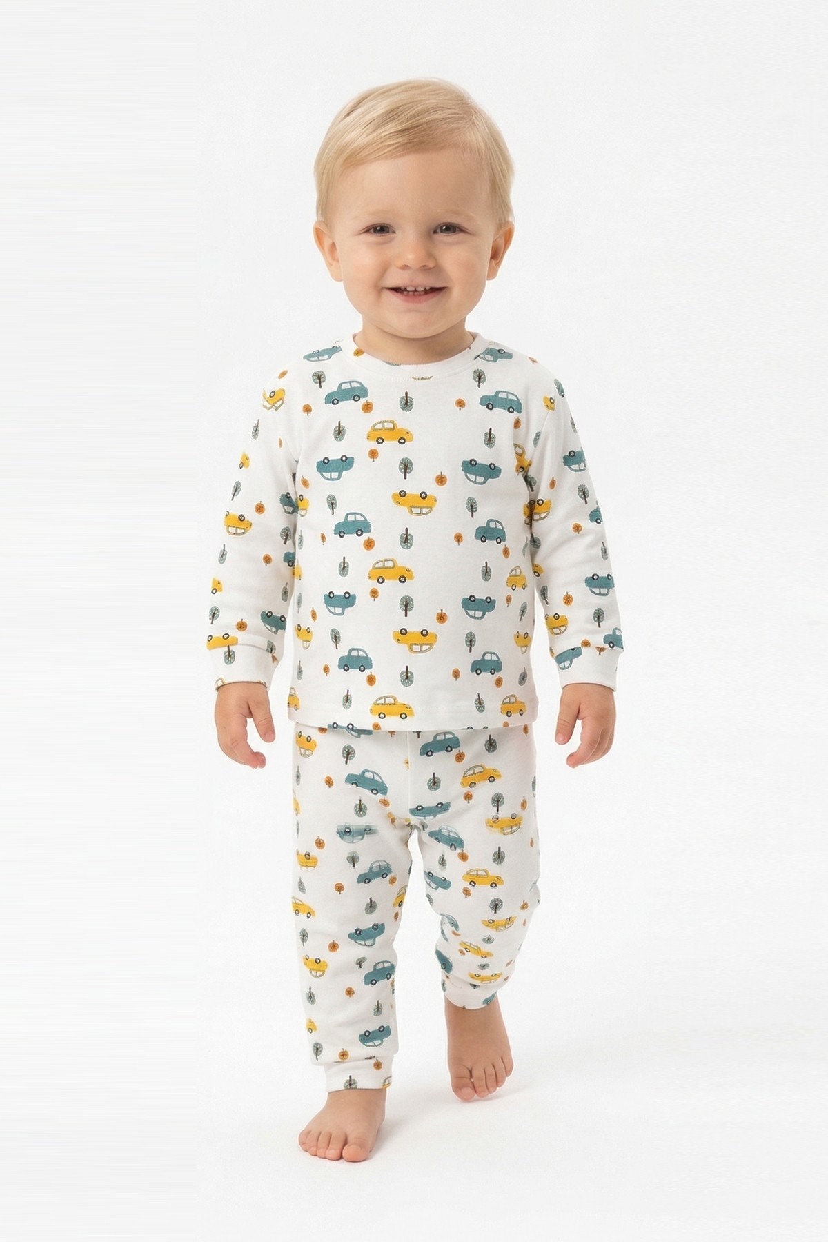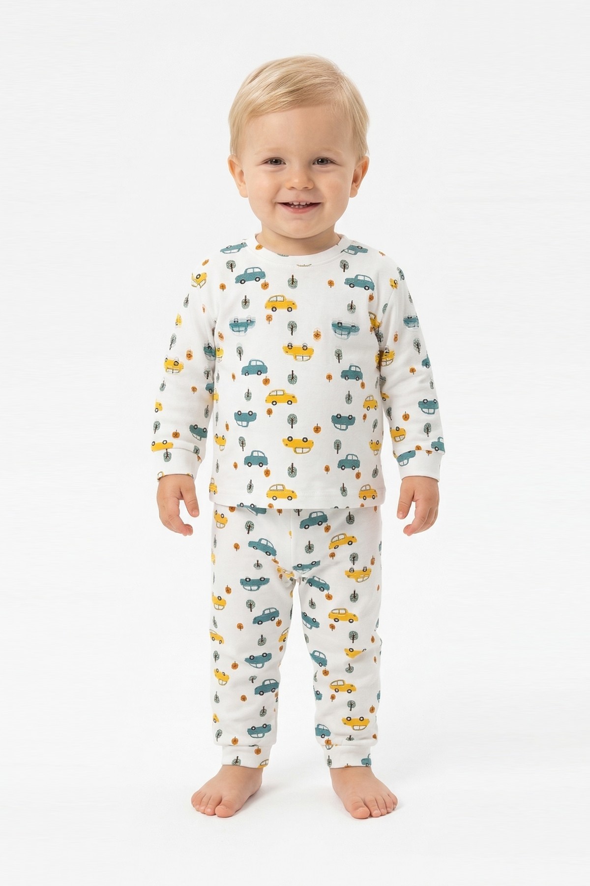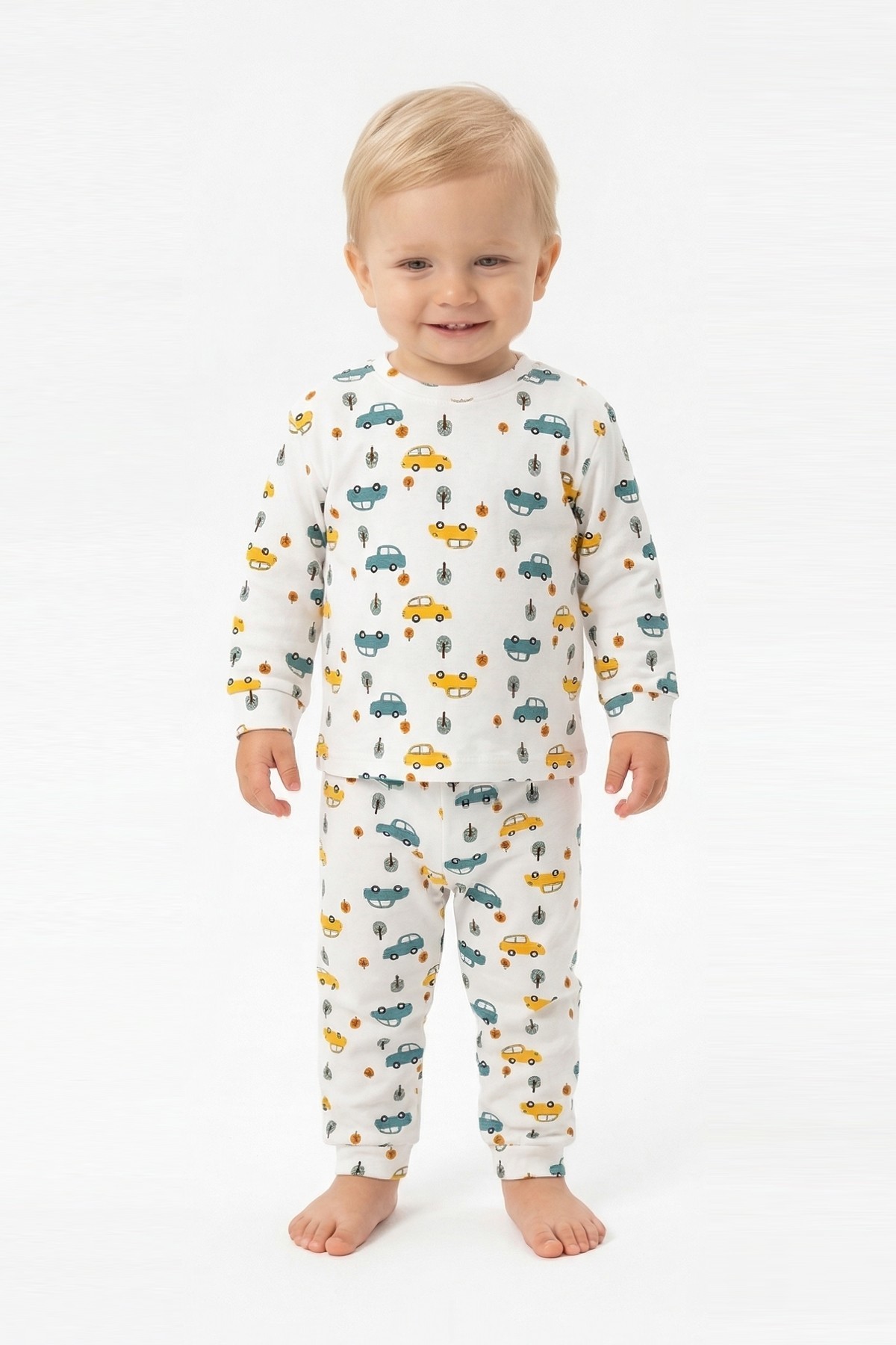 Erkek Bebek Araba ve Ağaç Desenli %100 Pamuk Reaktif Boyama İnterlok Kumaş Uzun Kollu Pijama Takımı