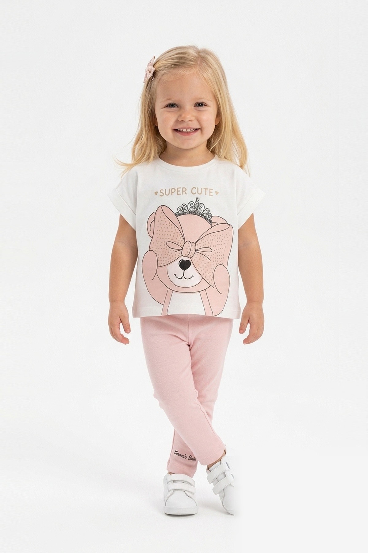 Kız Bebek Super Cute Yazılı %100 Pamuk Süprem Kumaş Ayıcık Baskılı Tişört ve Taytlı Takım