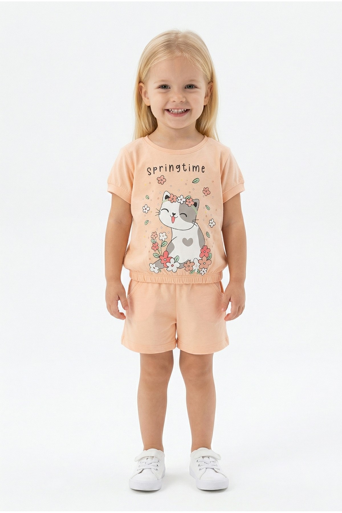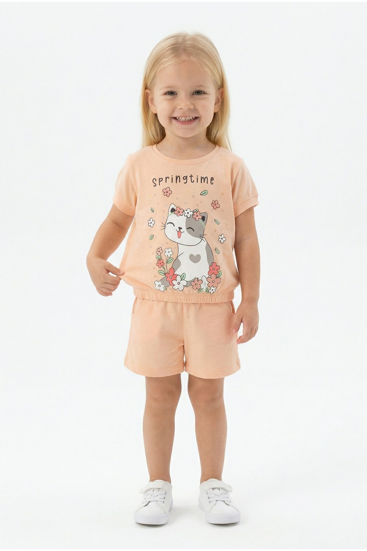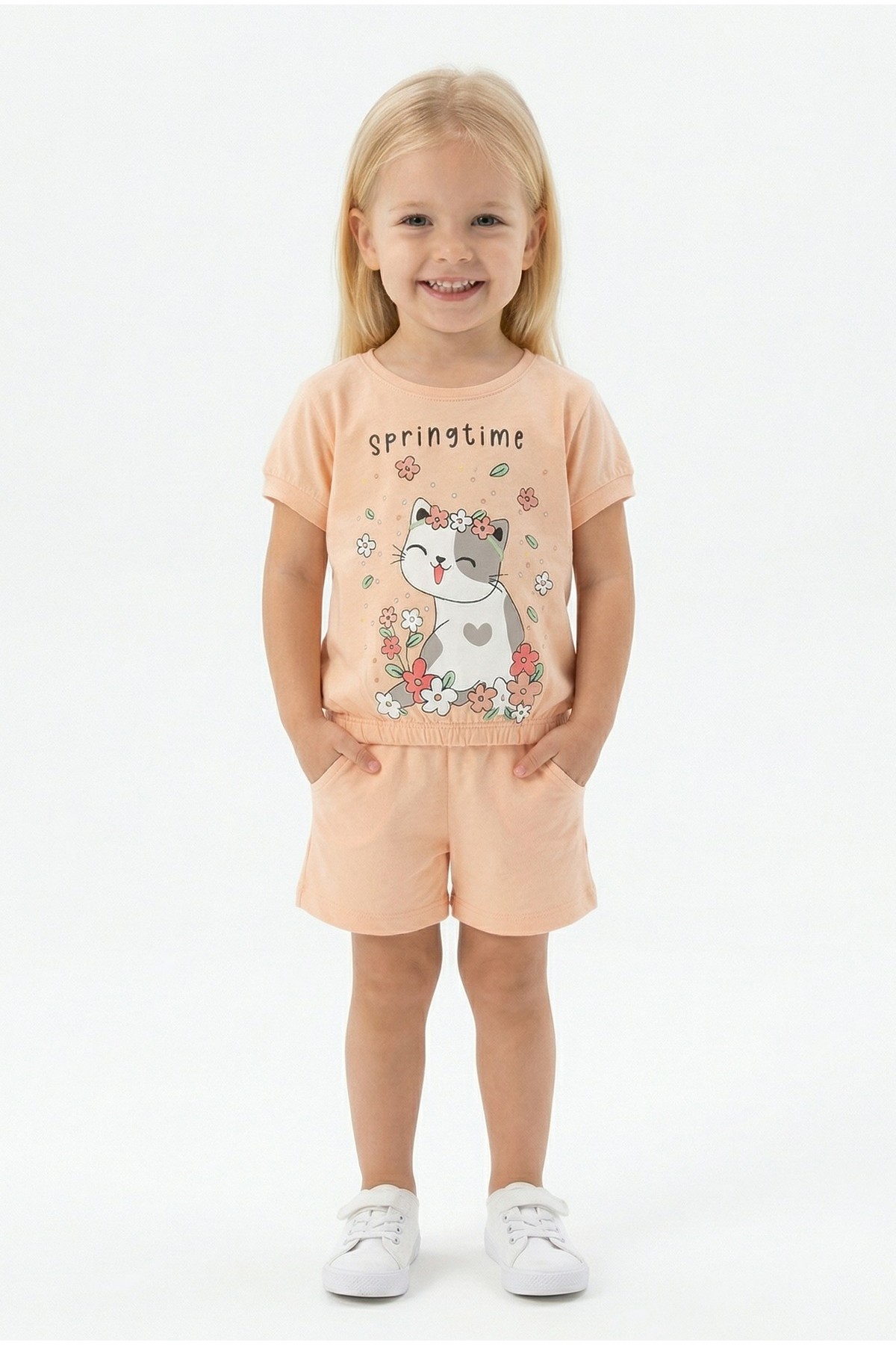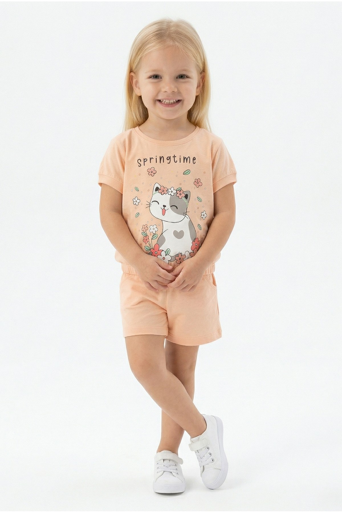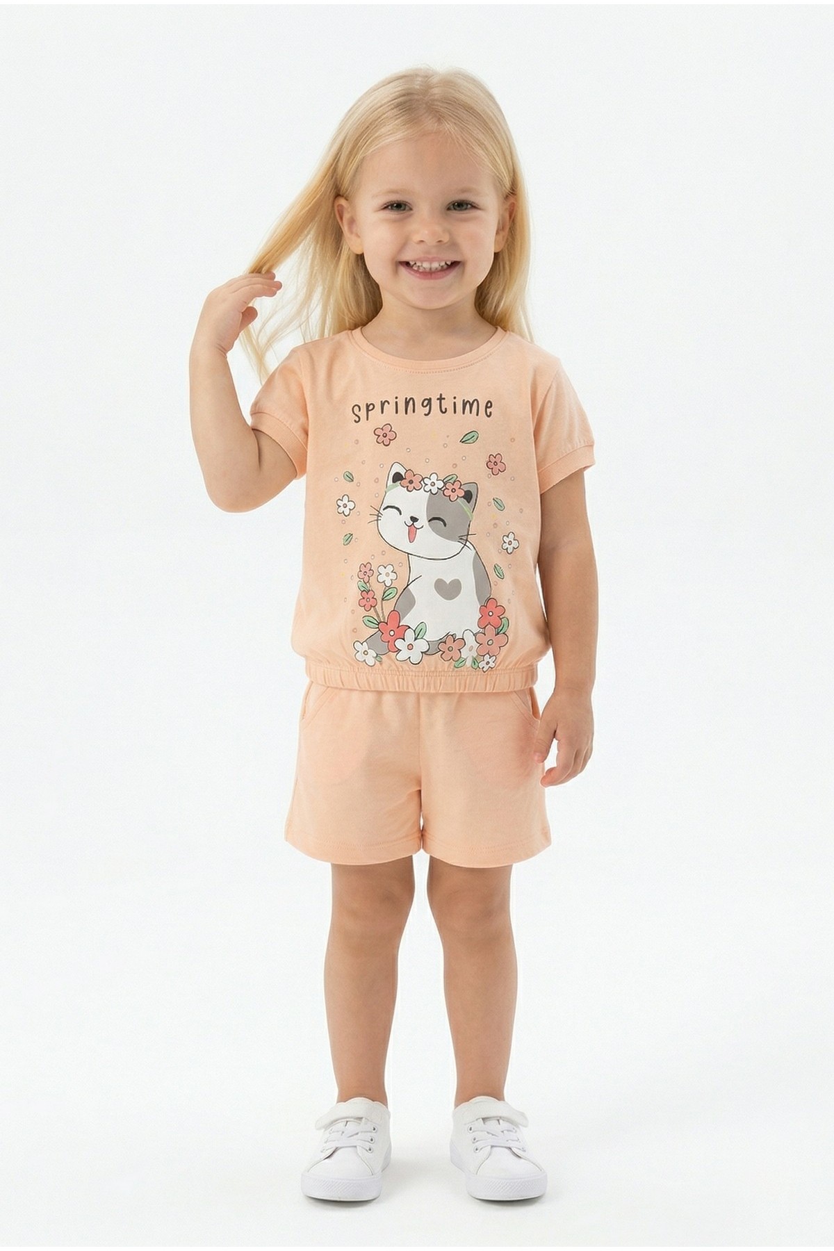 Bebek Sevimli Kedi Ve Çiçek Baskılı Kısa Kollu Tişört Ve Şortlu Yazlık Takım