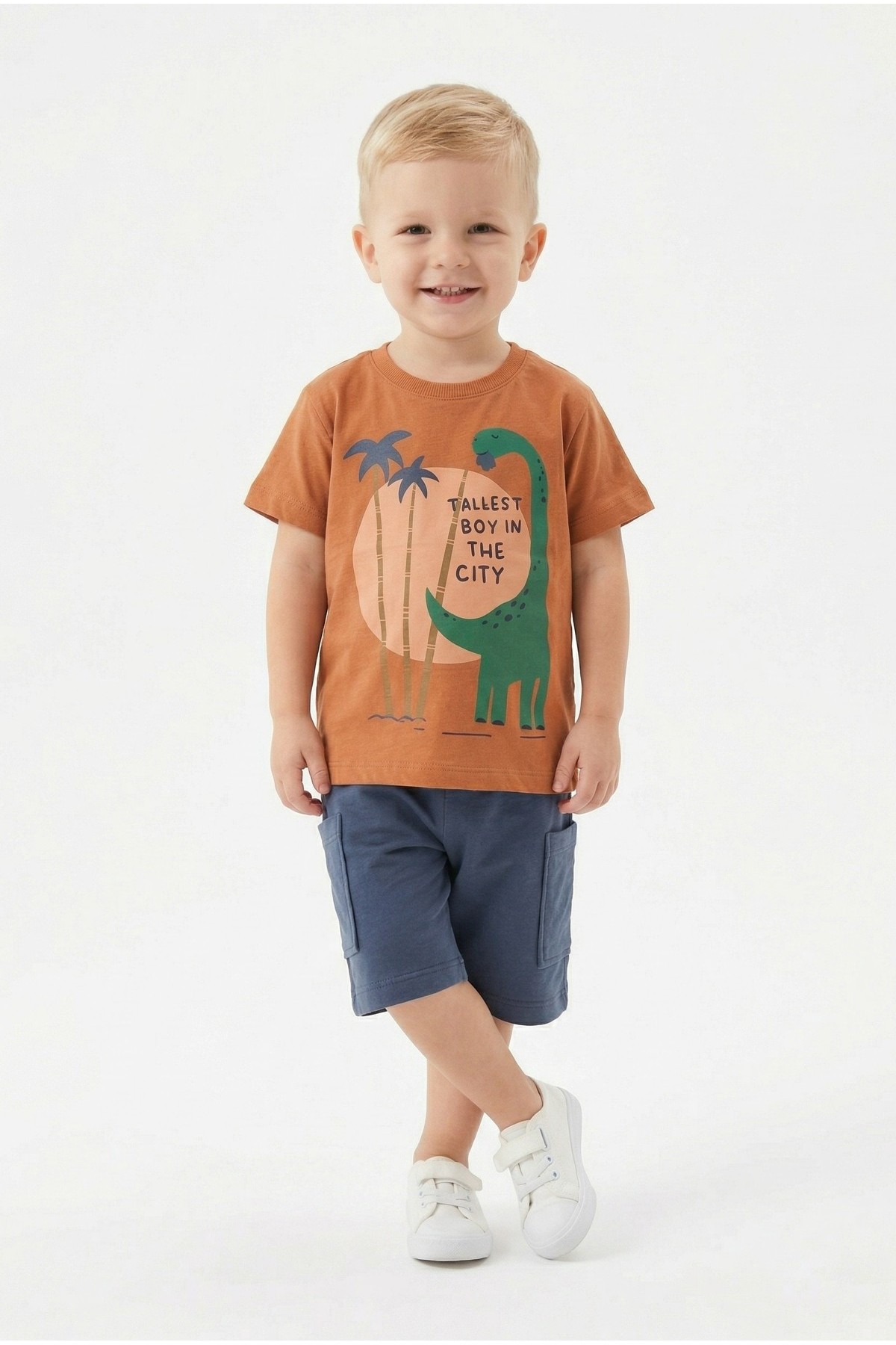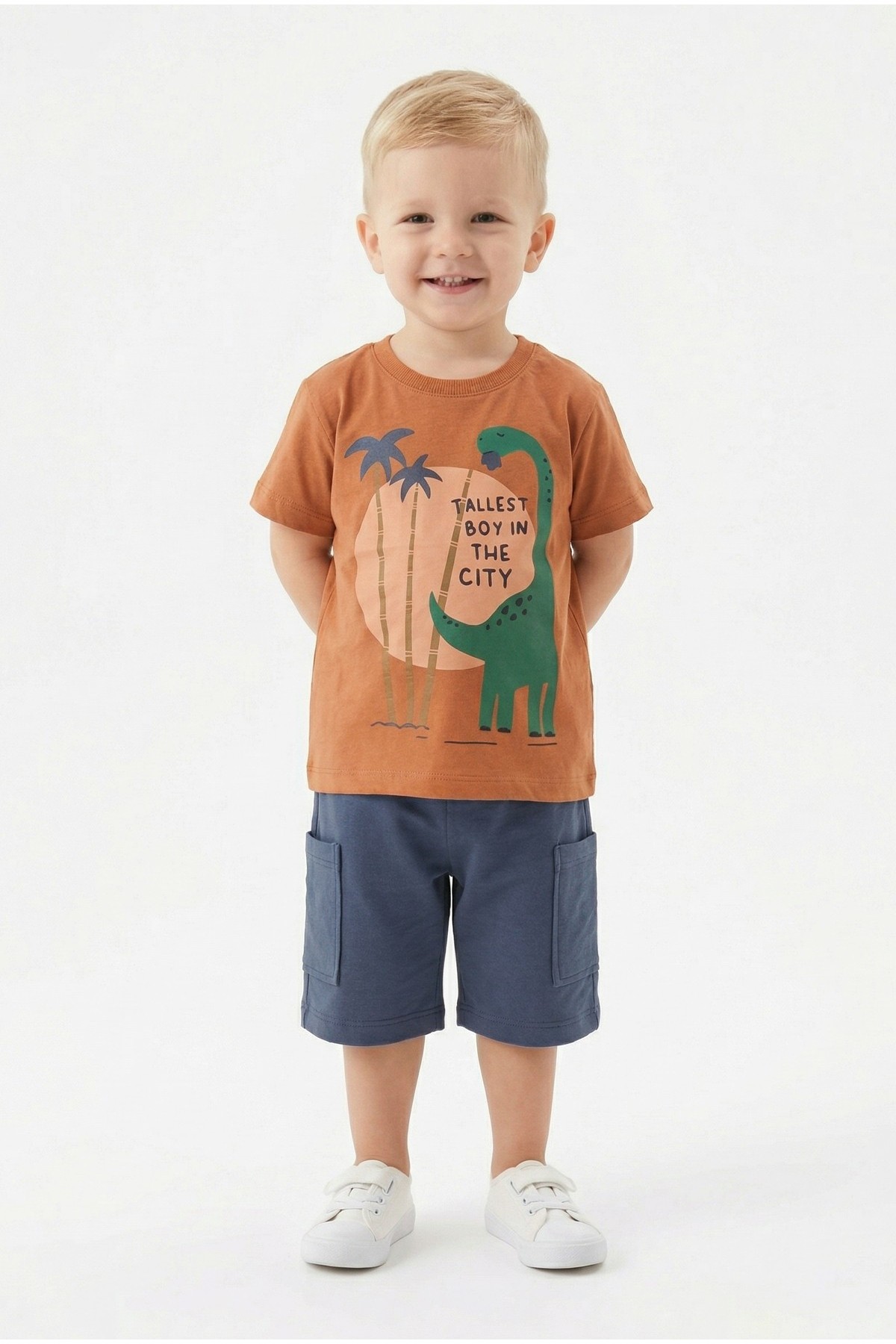 Bebek Dinozor Baskılı %100 Cotton Süprem Kumaş Kısa Kollu Tişört Ve Şortlu Takım