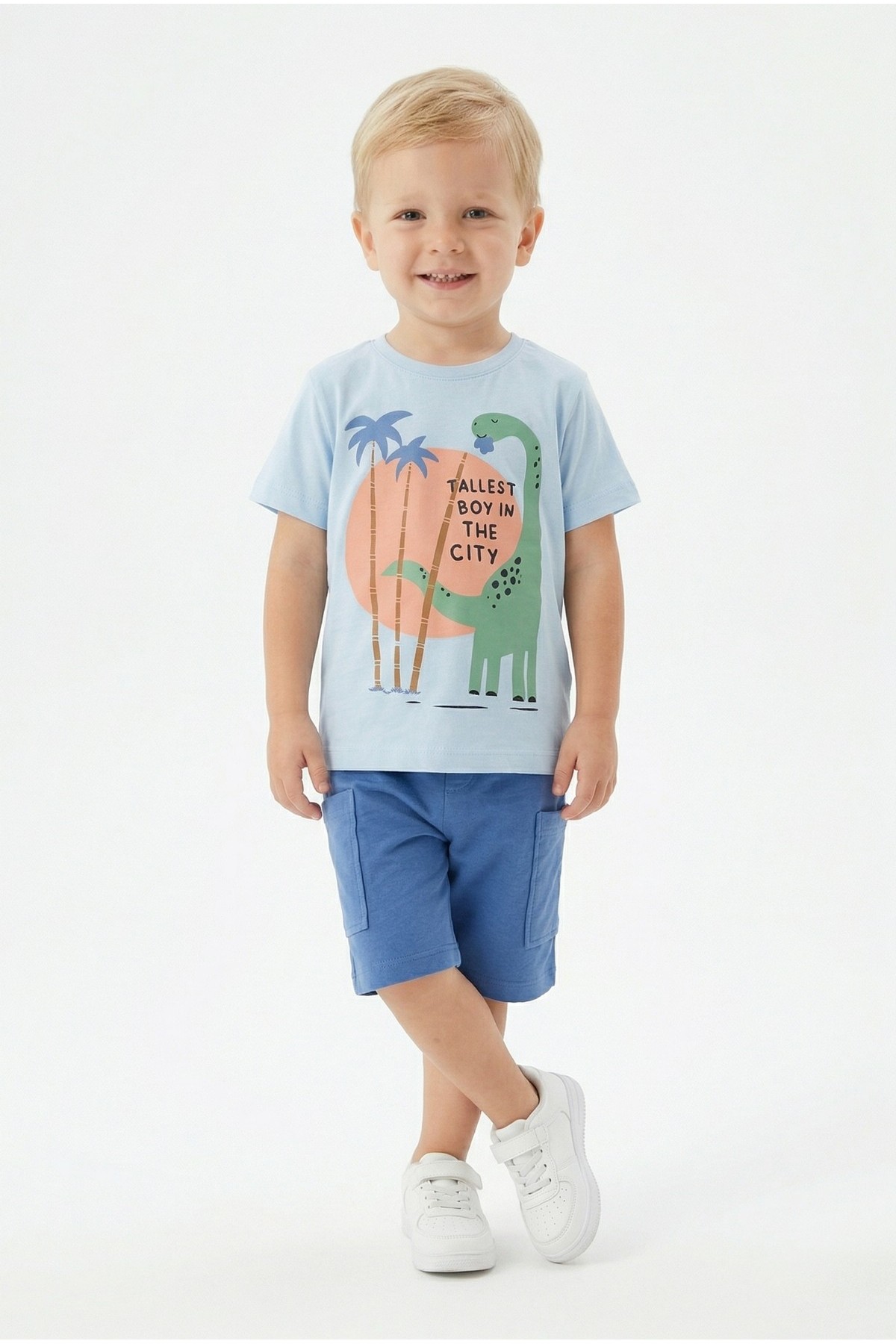 Bebek Dinozor Baskılı %100 Cotton Süprem Kumaş Kısa Kollu Tişört Ve Şortlu Takım