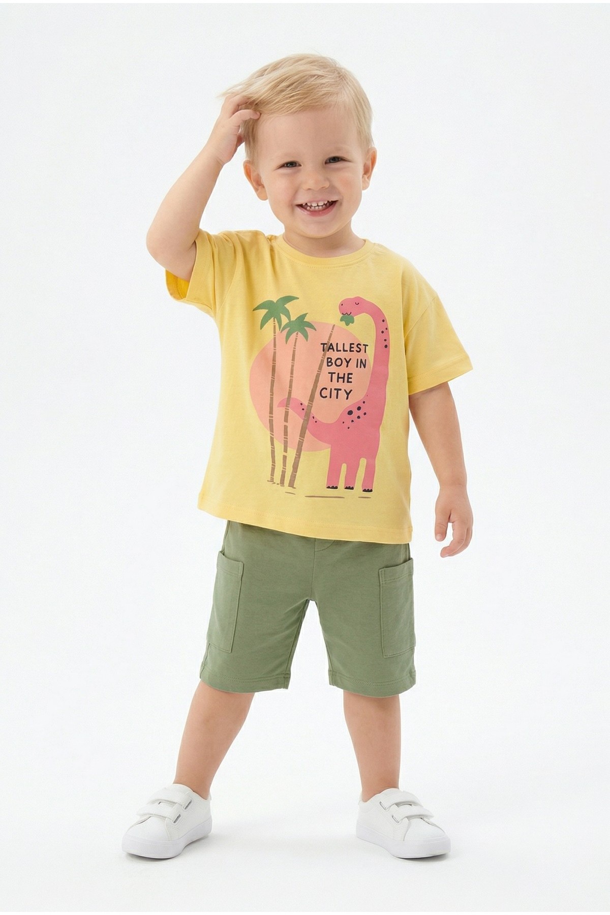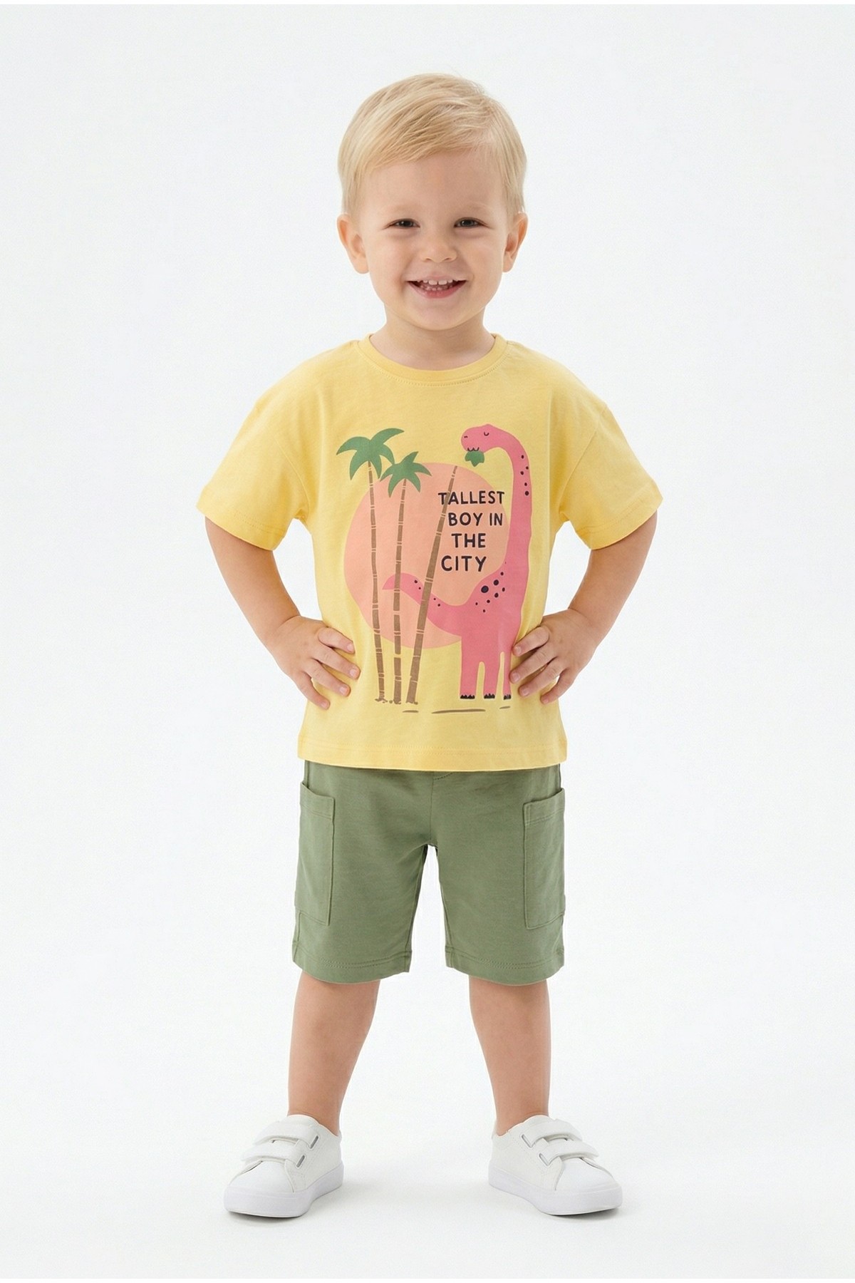 Bebek Dinozor Baskılı %100 Cotton Süprem Kumaş Kısa Kollu Tişört Ve Şortlu Takım