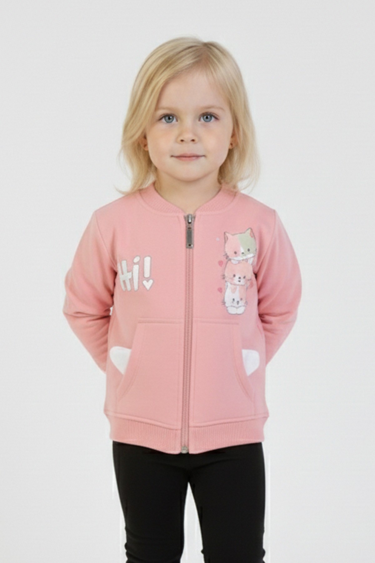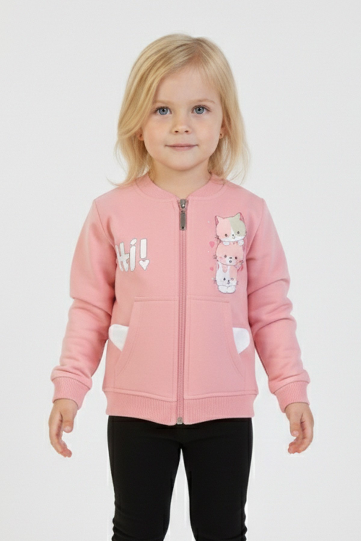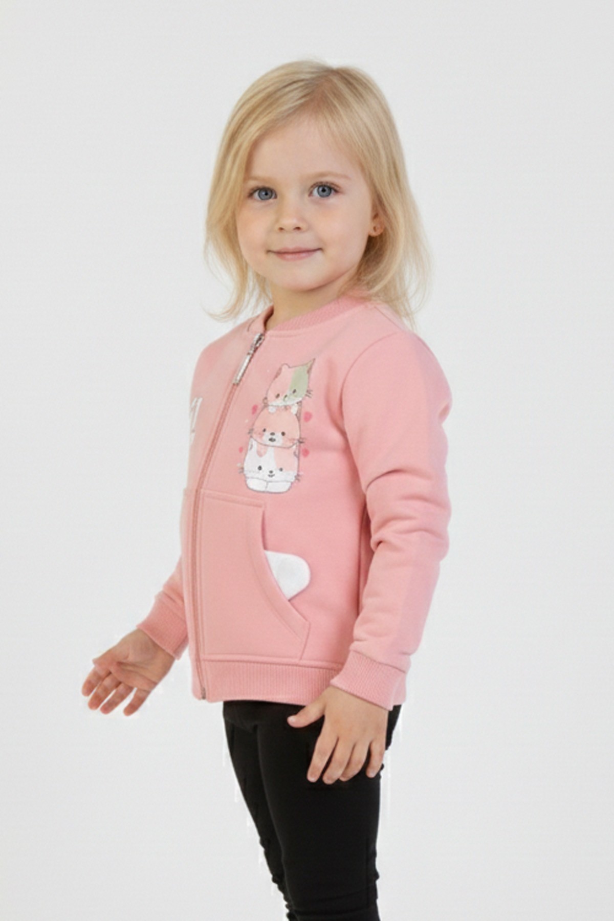 İki İplik Fırçalı Kumaş Kulaklı Cepli Kedi Baskılı Günlük Kullanım Bebe Hırka