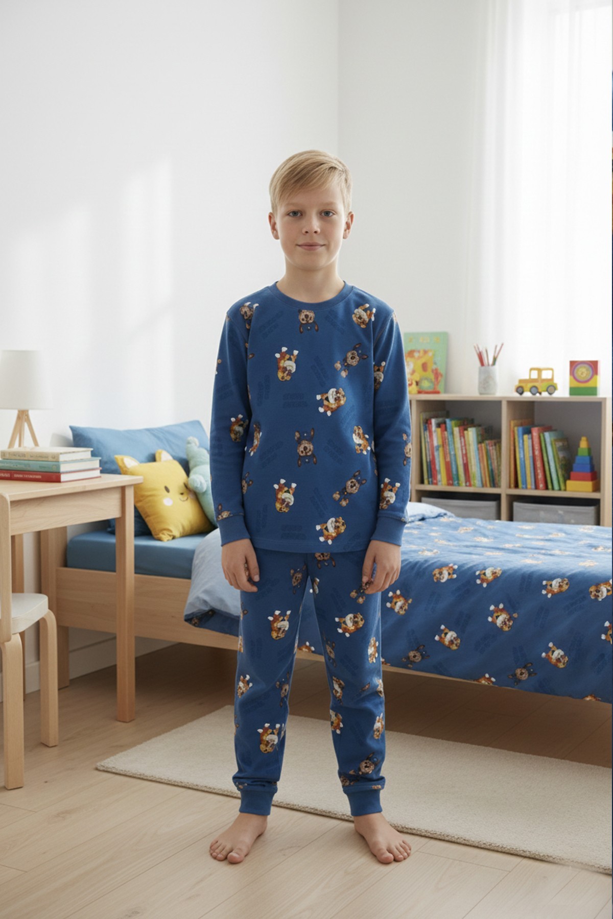 Garson Erkek Çocuk Köpek Baskılı %100 Pamuk Reaktif Boyalı İnterlok Kumaş Uzun Kollu Pijama Takımı