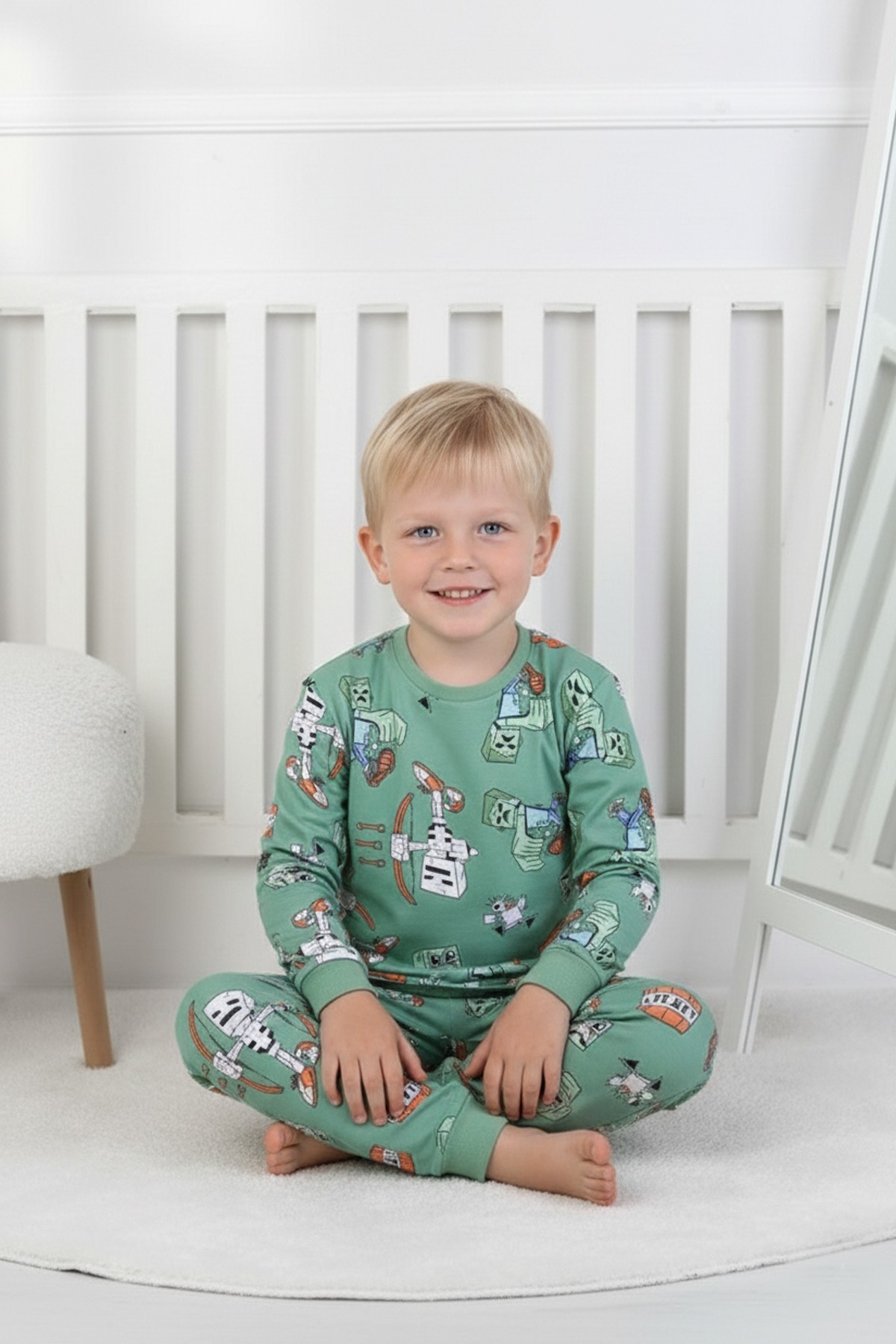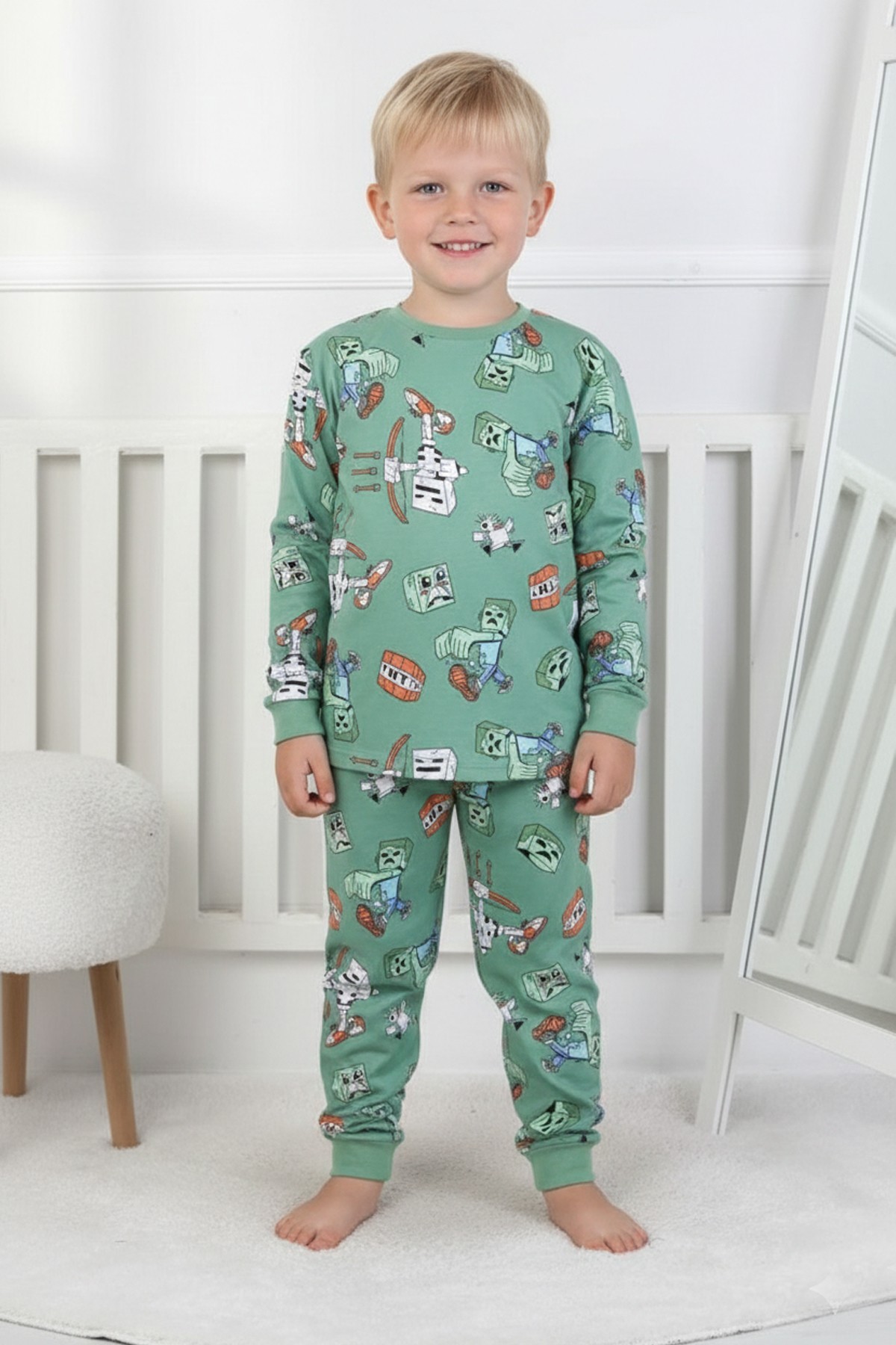 Erkek Çocuk Desenli %100 Pamuk Reaktif Boyalı İnterlok Kumaş Uzun Kollu Pijama Takımı