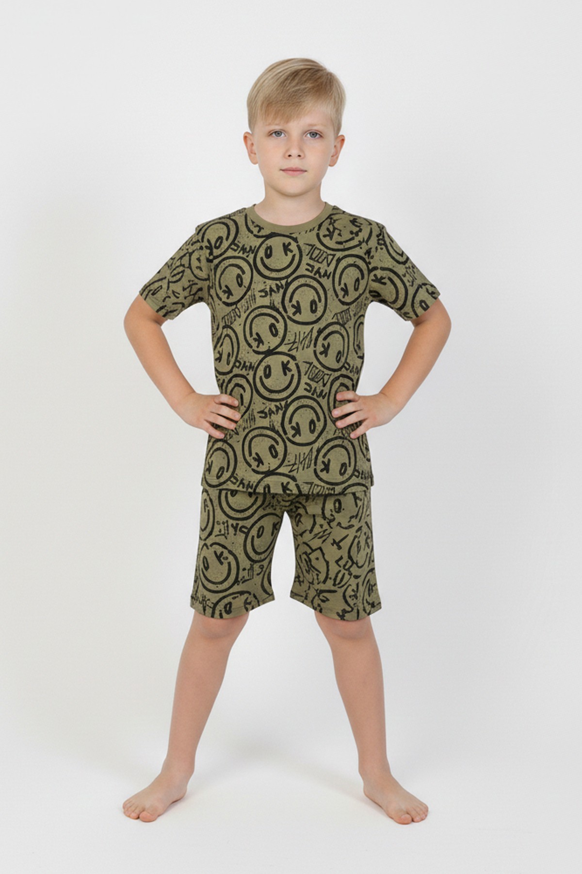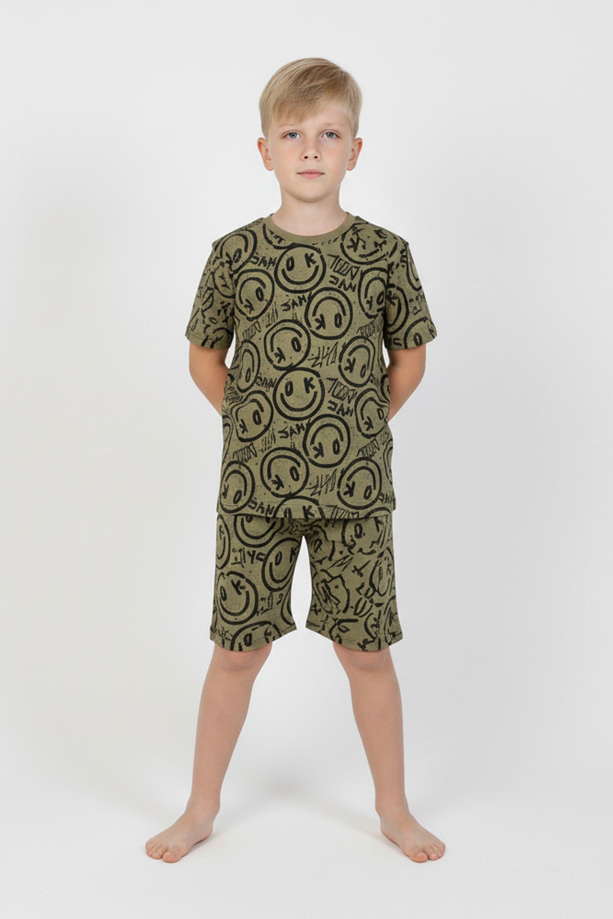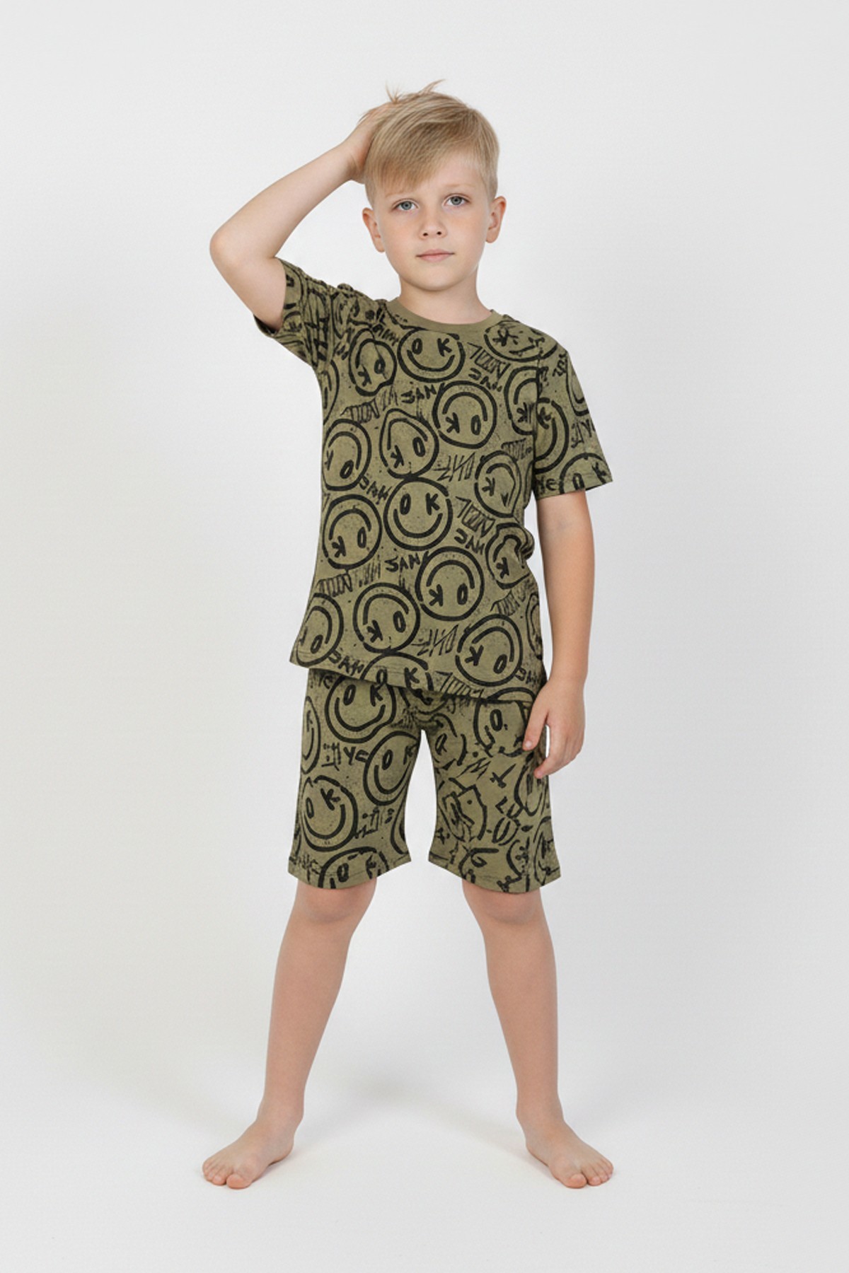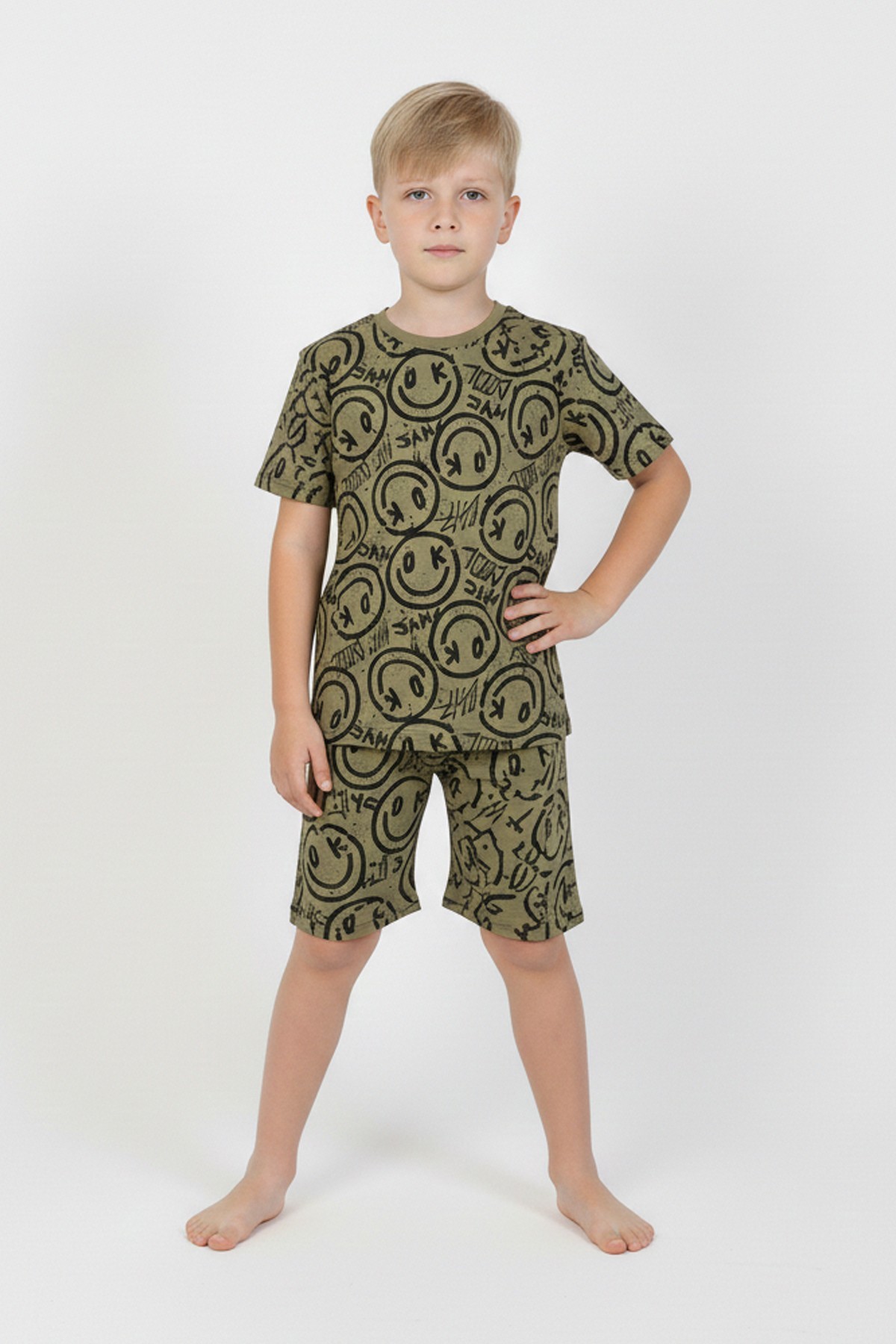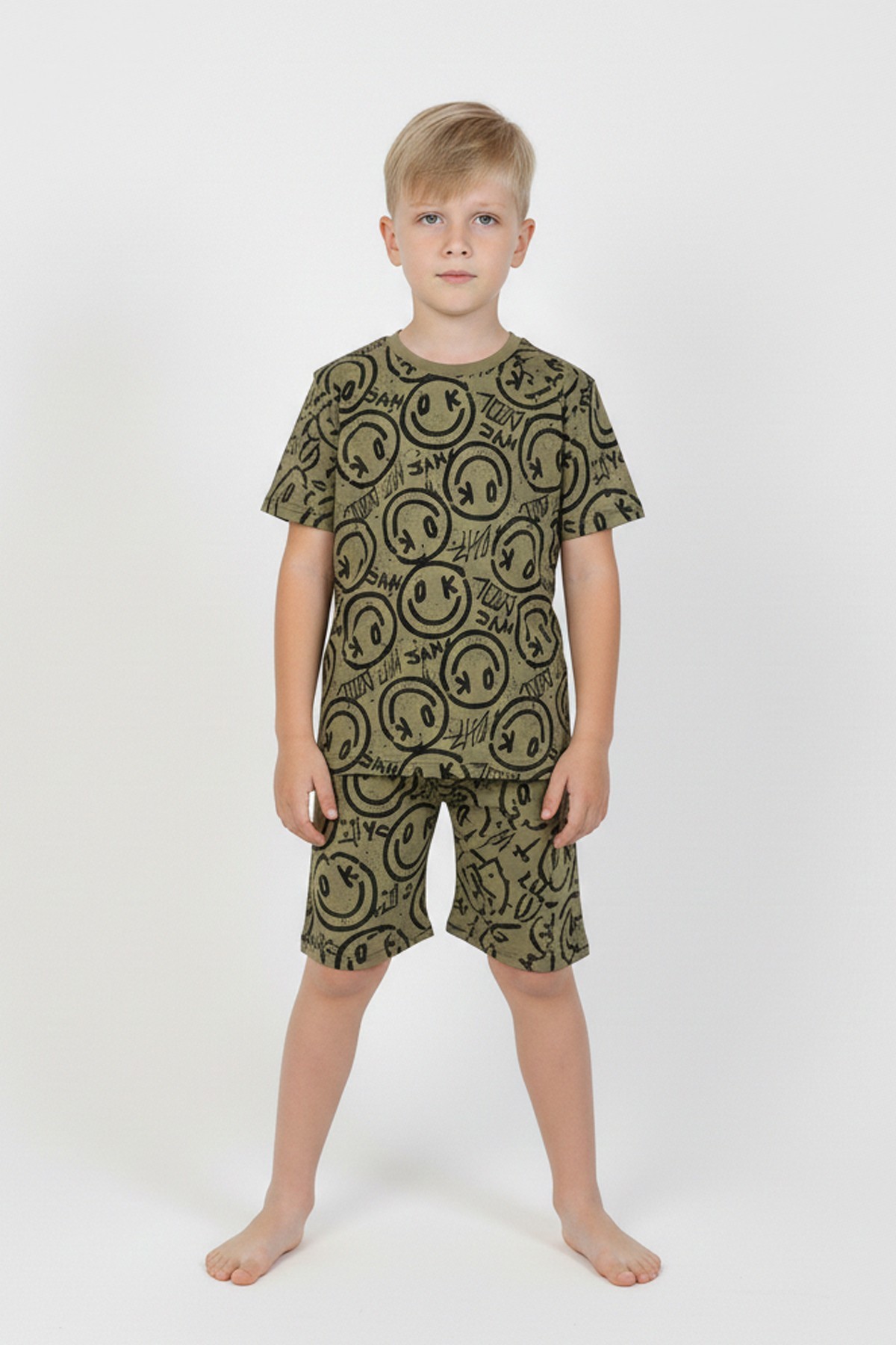 Erkek Çocuk Çoklu Gülen Yüz Baskılı %100 Pamuk Reaktif Boyama Süprem Şortlu Pijama Takımı