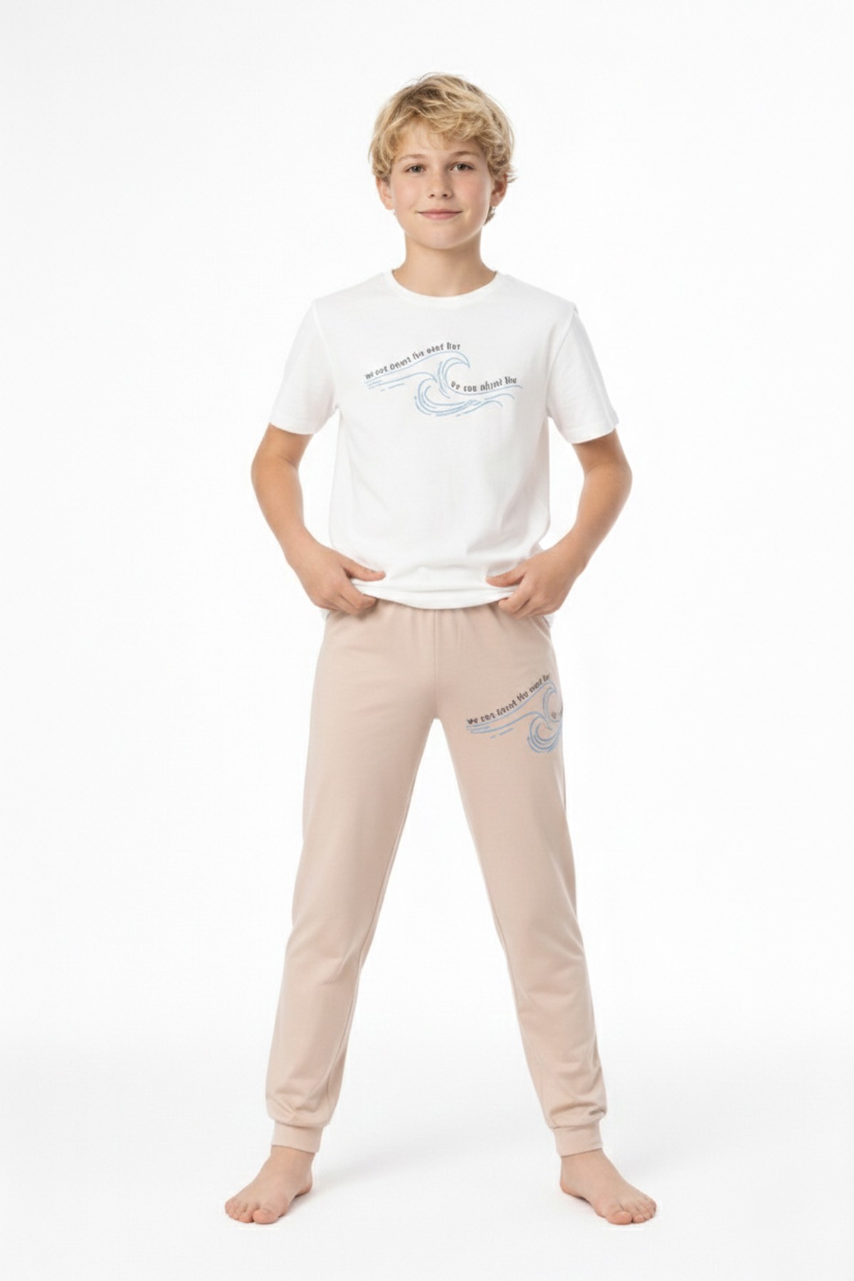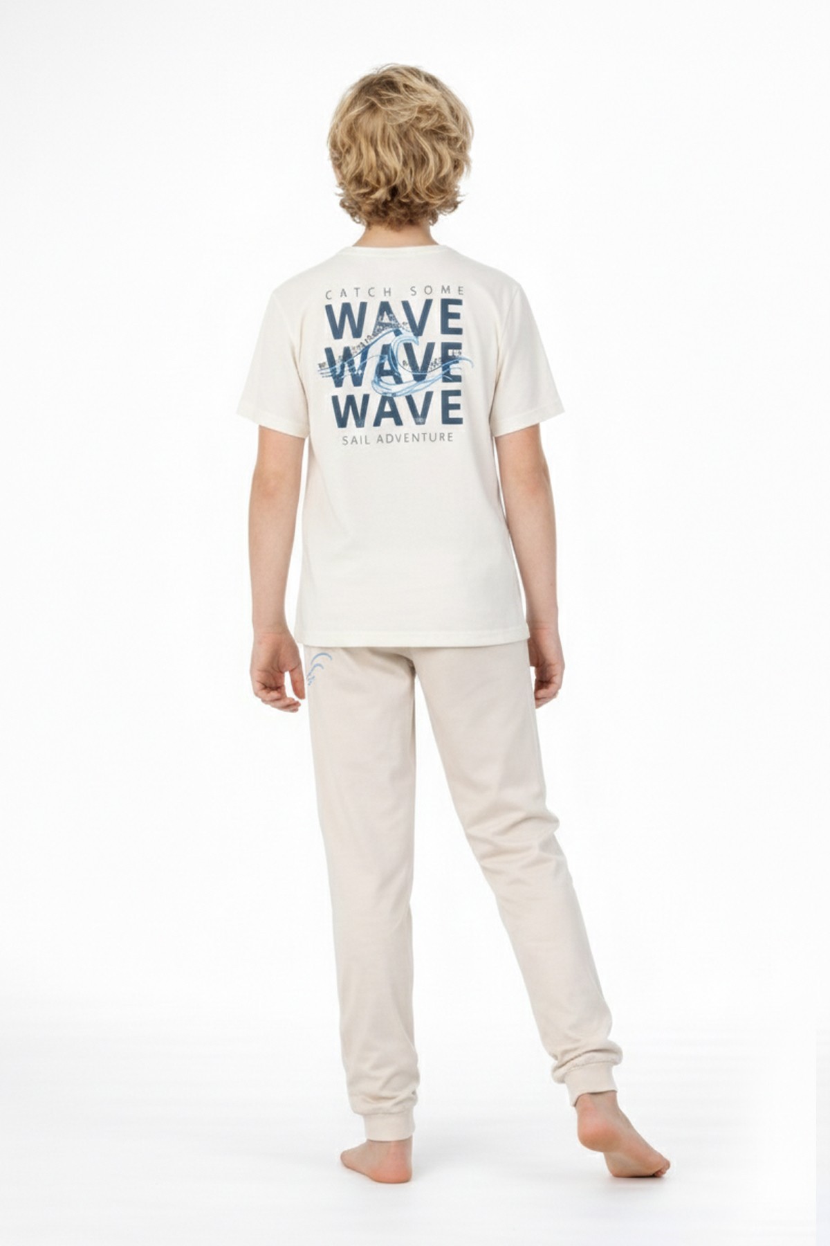 Garson Erkek Çocuk Dalga Desen Arka Baskılı %100 Pamuk Reaktif Boyama Süprem Pijama Takımı
