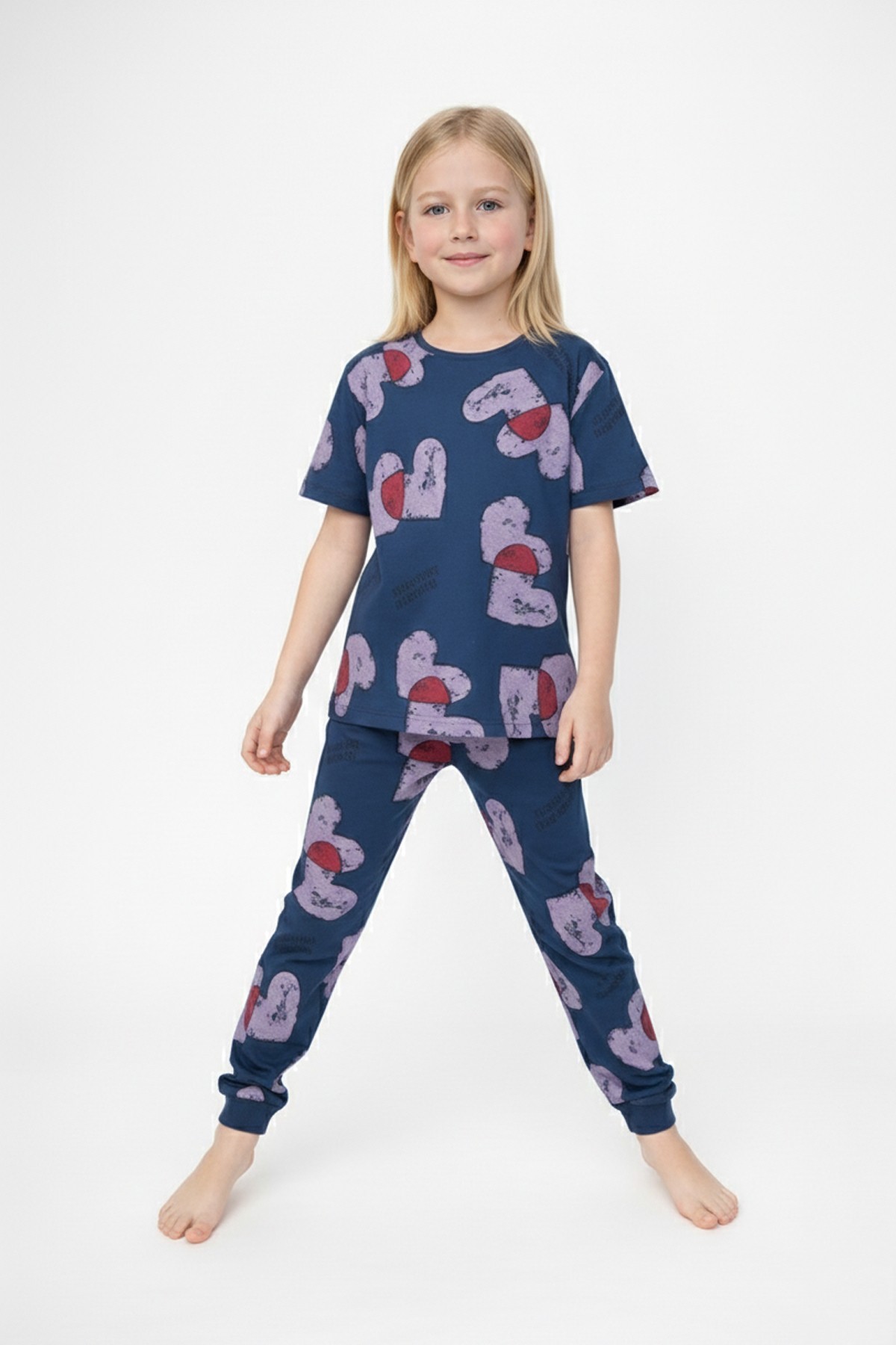 Kız Çocuk Kalp Desenli %100 Pamuk Reaktif Boyalı Süprem Kumaş Kısa Kollu Pijama Takımı