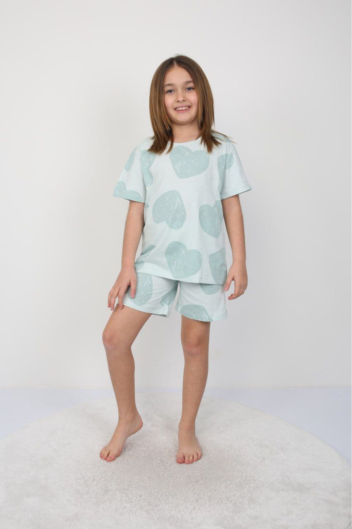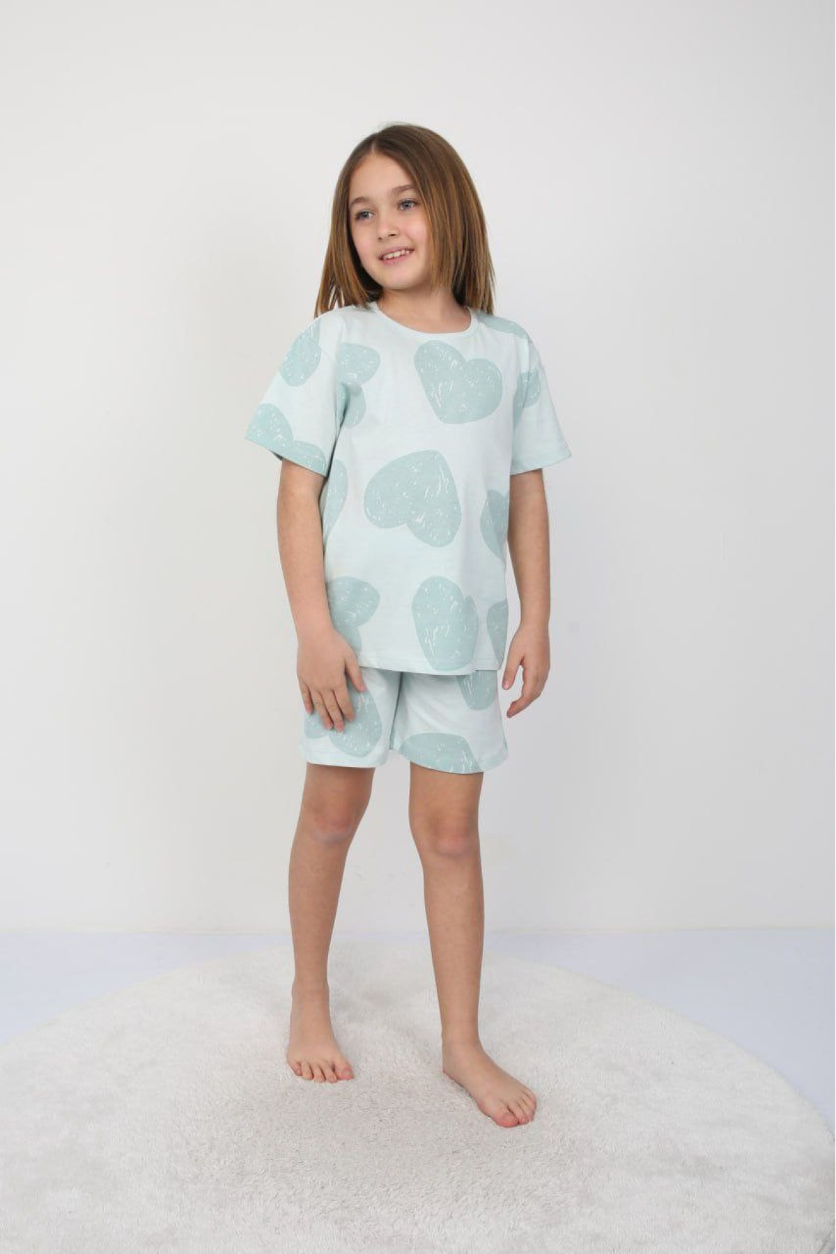 Kız Çocuk Yeşili Büyük Kalp Desenli %100 Pamuk Süprem Kumaş Kısa Kollu Pijama Takımı