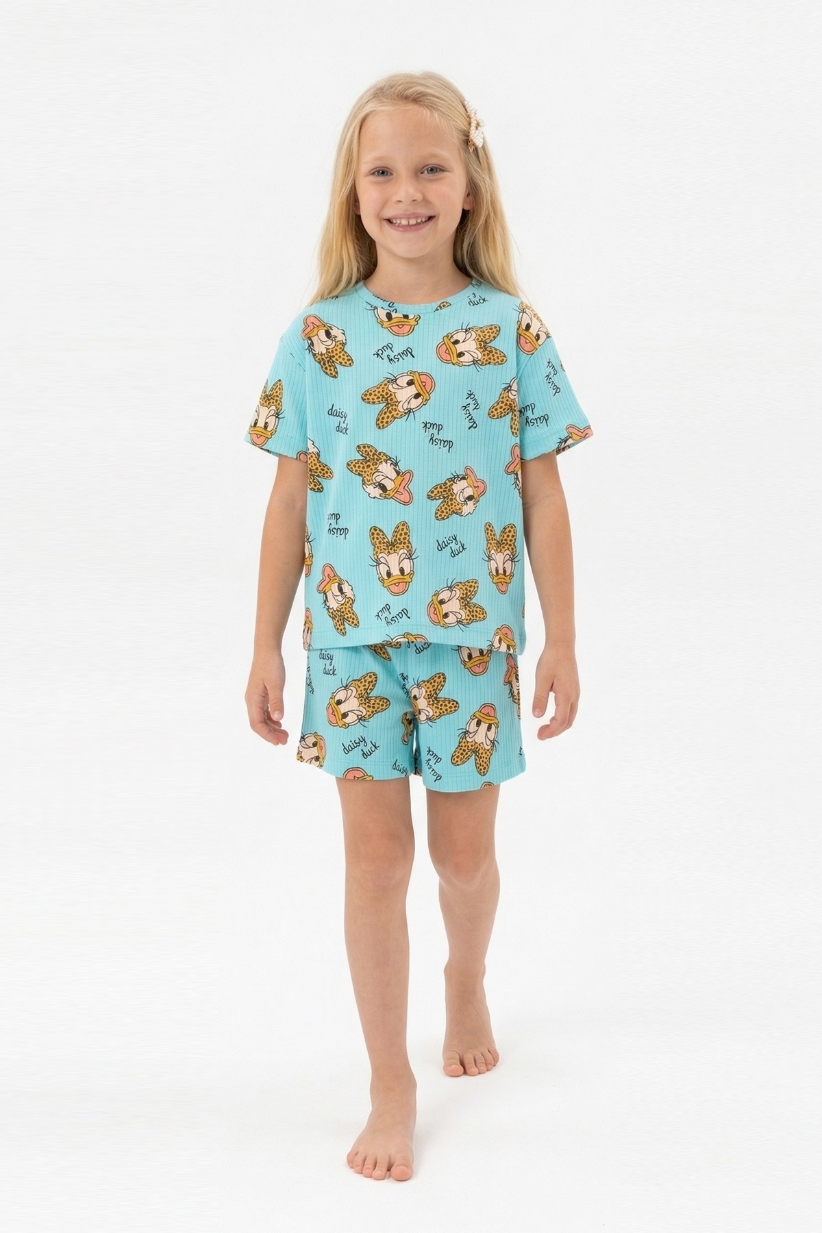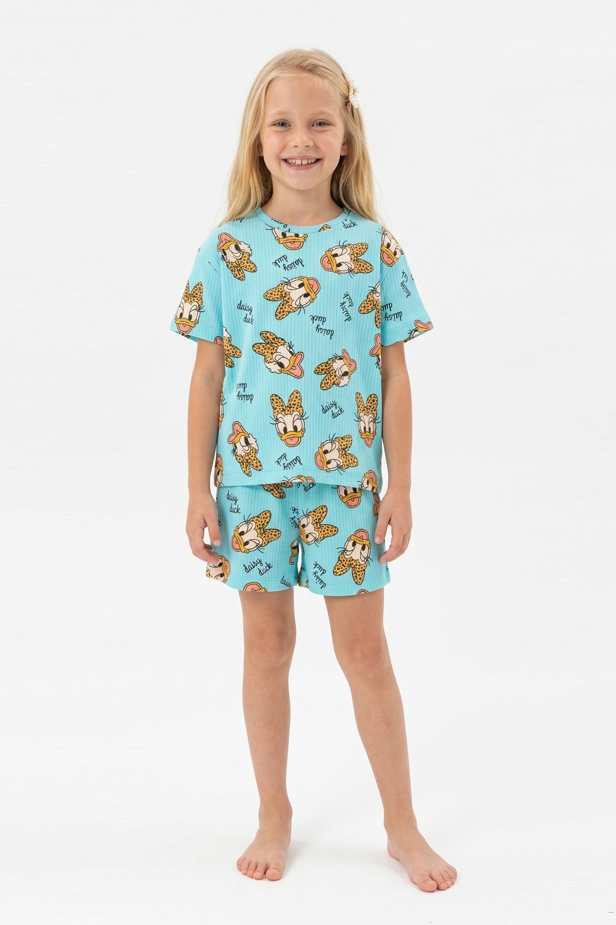 Kız Çocuk Leopar Fiyonk Detaylı %100 Pamuk İnterlok Kumaş Kısa Kollu Şortlu Pijama Takımı