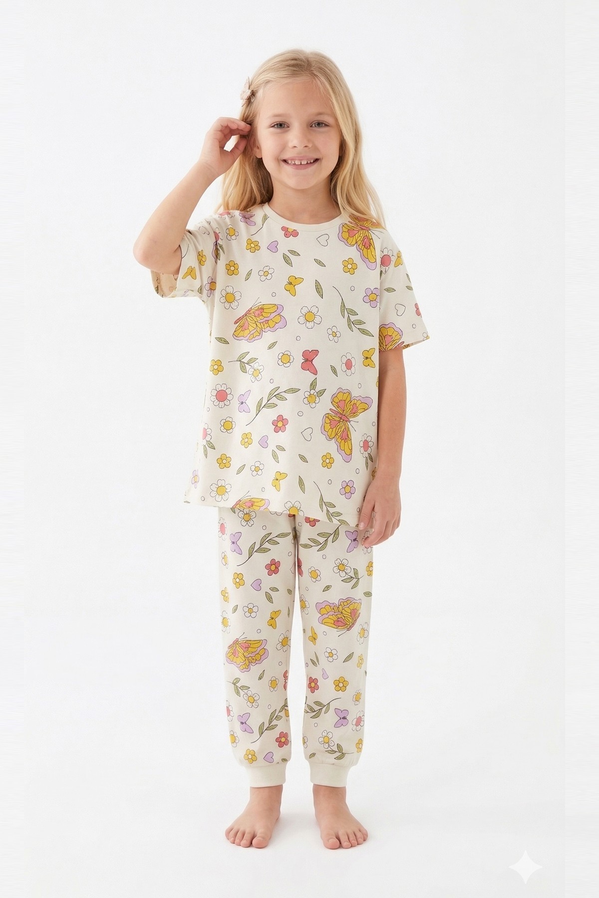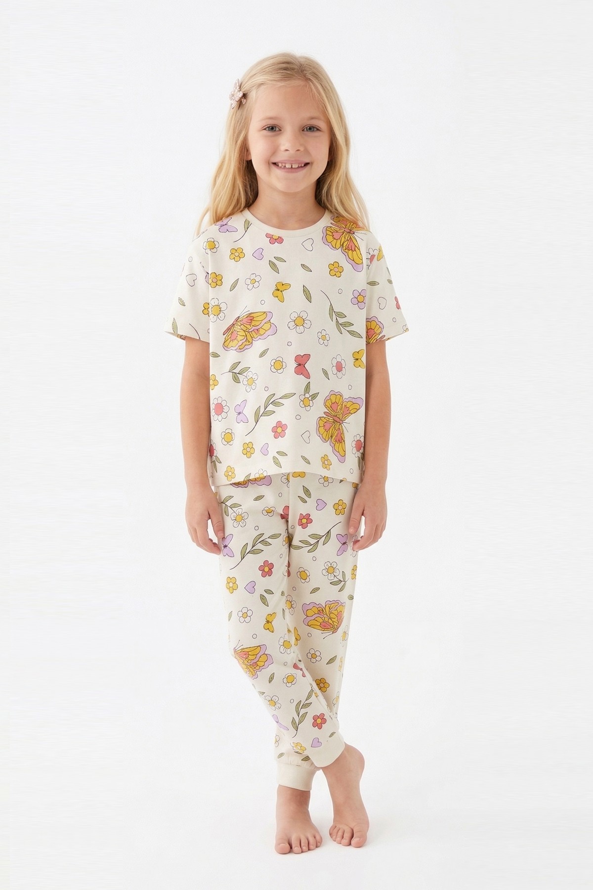 Kız Çocuk Kelebek ve Çiçek Desenli %100 Pamuk Süprem Kumaş Kısa Kollu Pijama Takımı