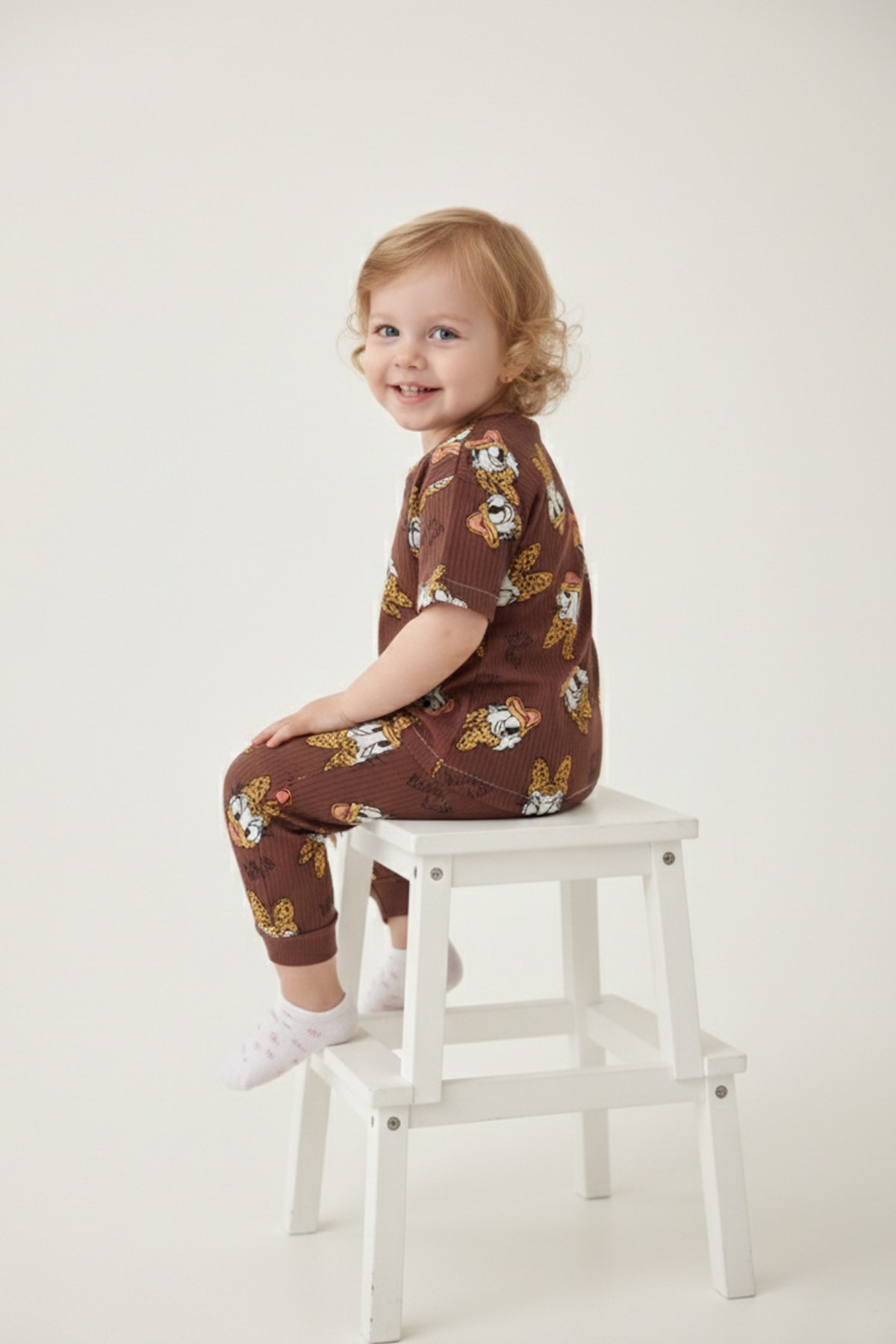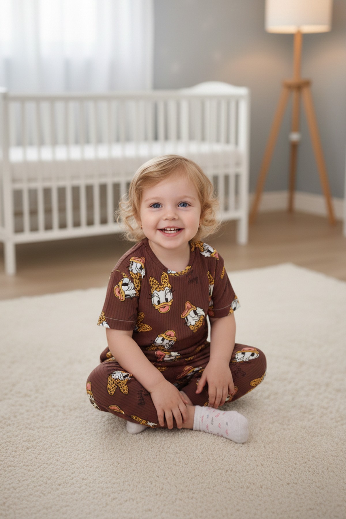 Bebek Ördek Figürlü ve Leopar Fiyonk Desenli %100 Pamuk İnterlok Kumaş Kısa Kollu Pijama Takımı