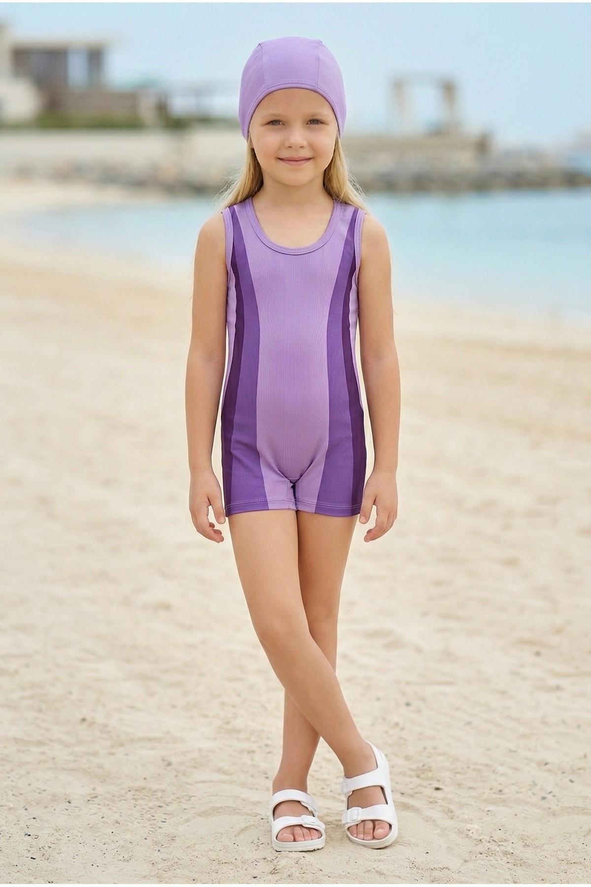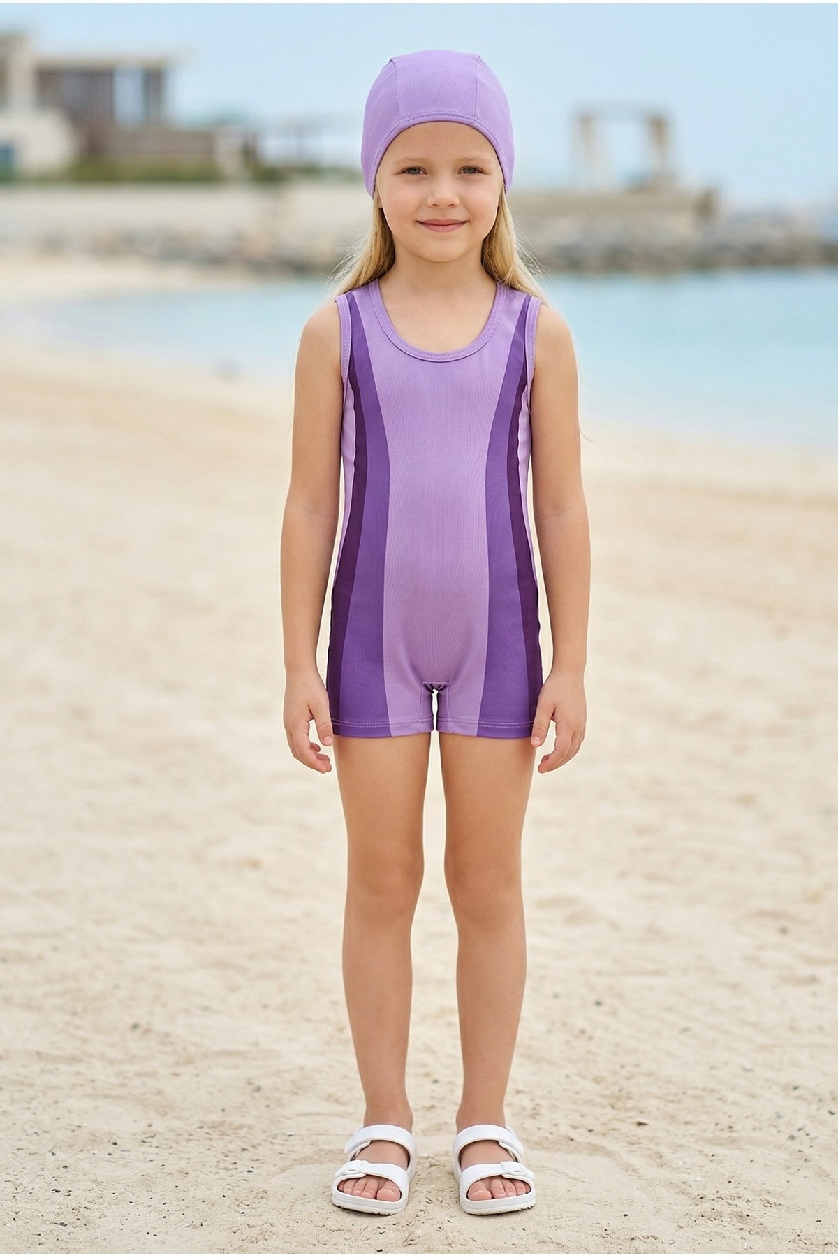 Kız Çocuk Polyester + Elastan Renk Geçişli Bone Hediyeli Yarım Şortlu Profesyonel Yüzücü Mayosu