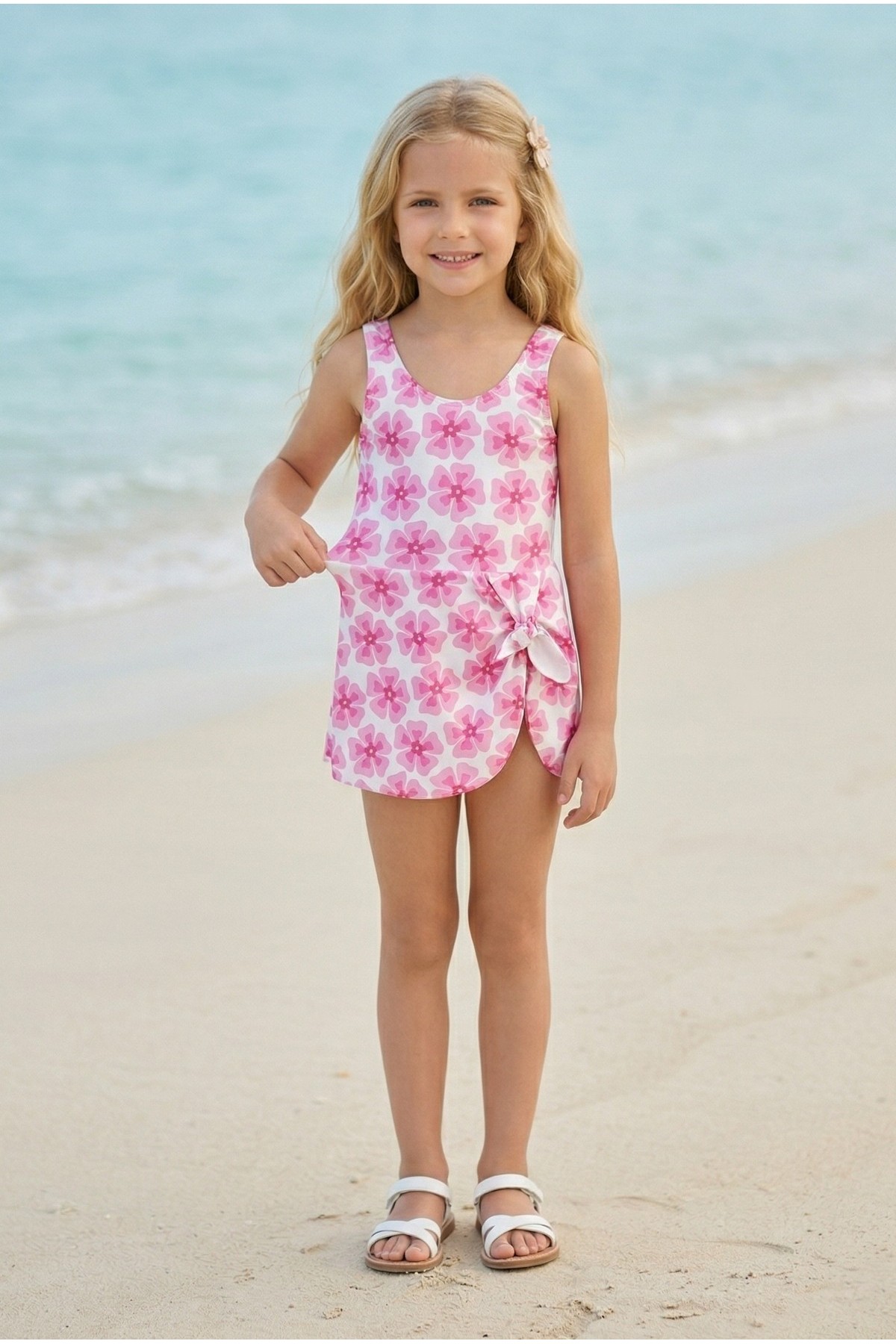 Kız Çocuk Polyester + Elastan Çiçek Desenli Pareo Görünümlü Askılı Etekli Şık Tasarım Yüzücü Mayosu