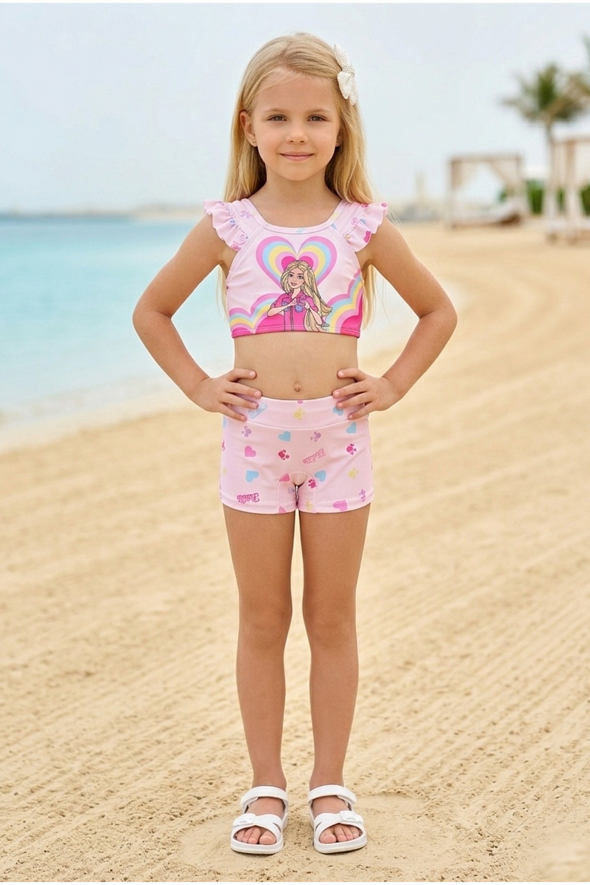 Kız Çocuk Polyester + Elastan Baskılı Fırfırlı Crop Üst ve Boxer Şortlu Mayo