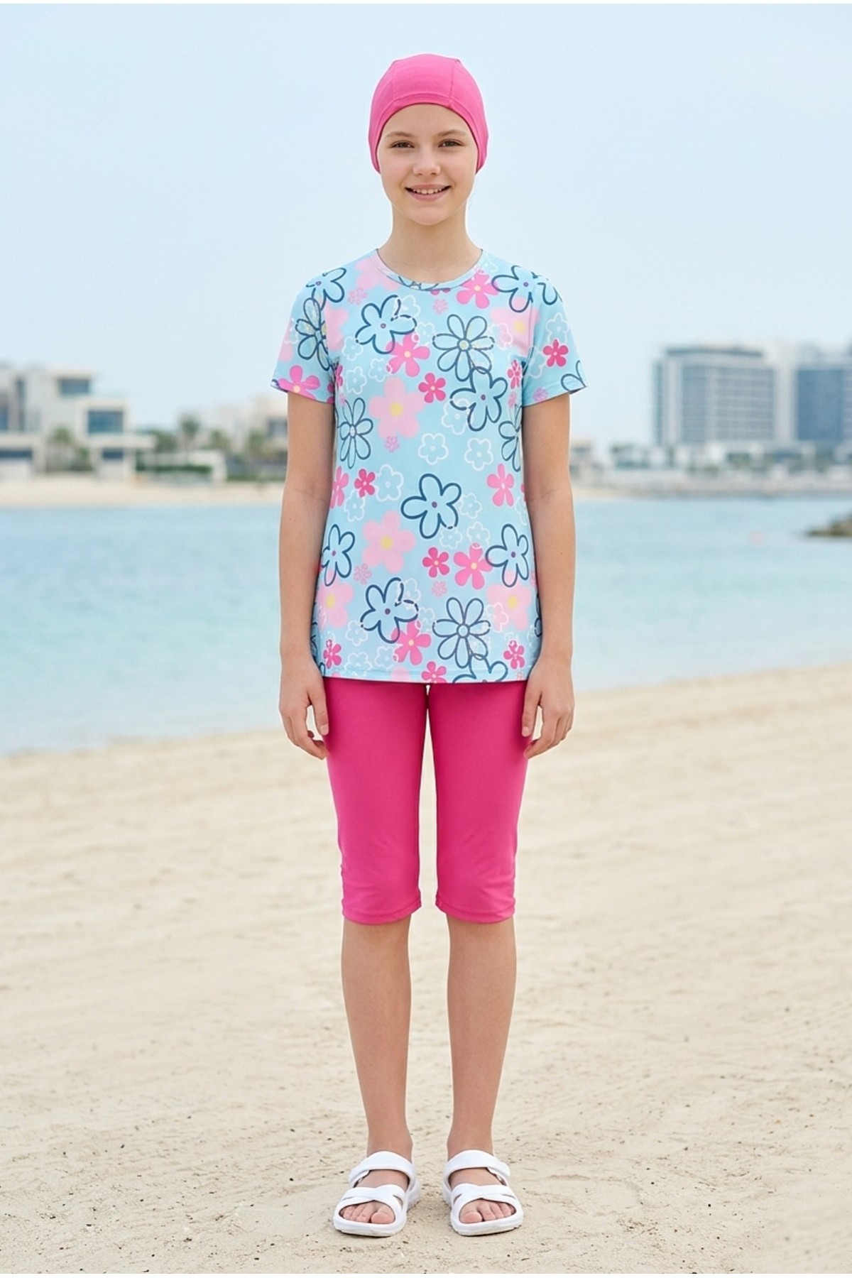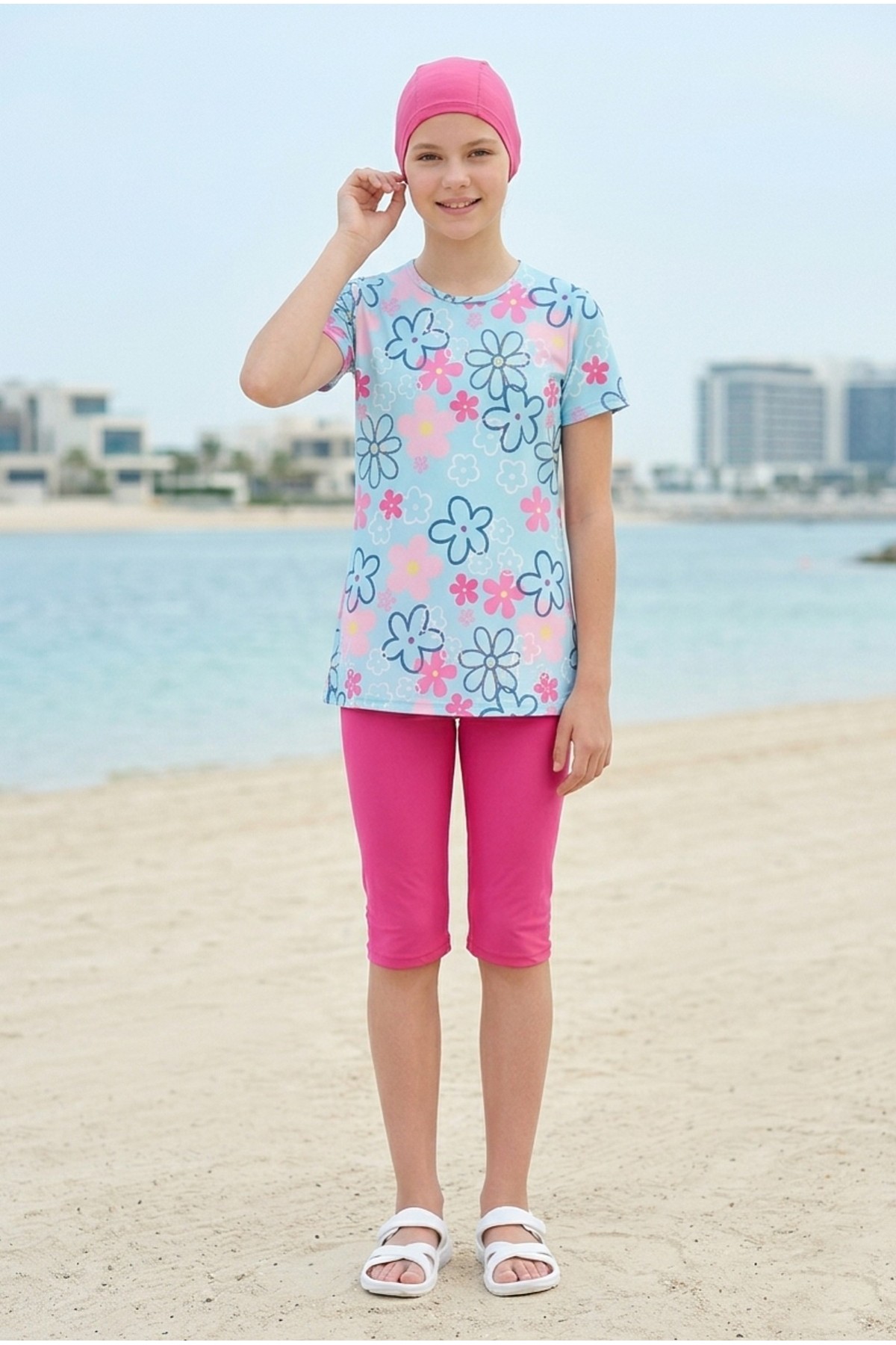 Garson Kız Çocuk Polyester + Elastan Çiçek Desenli Kısa Kol Taytlı Boneli Haşema Mayo