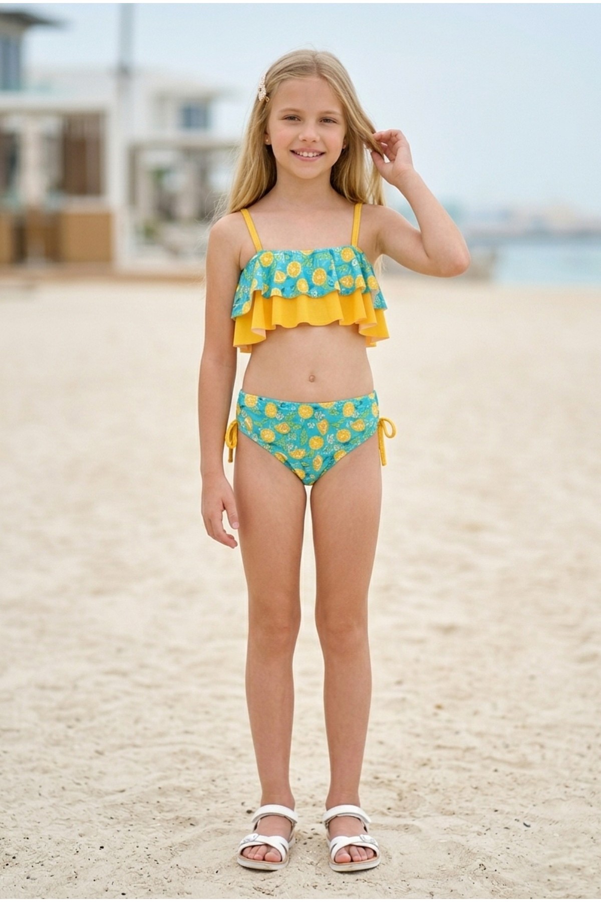 Kız Çocuk Polyester + Elastan Limon Desenli Fırfır Detaylı Ayarlanabilir Askılı Şık Tasarım İkili Mayo