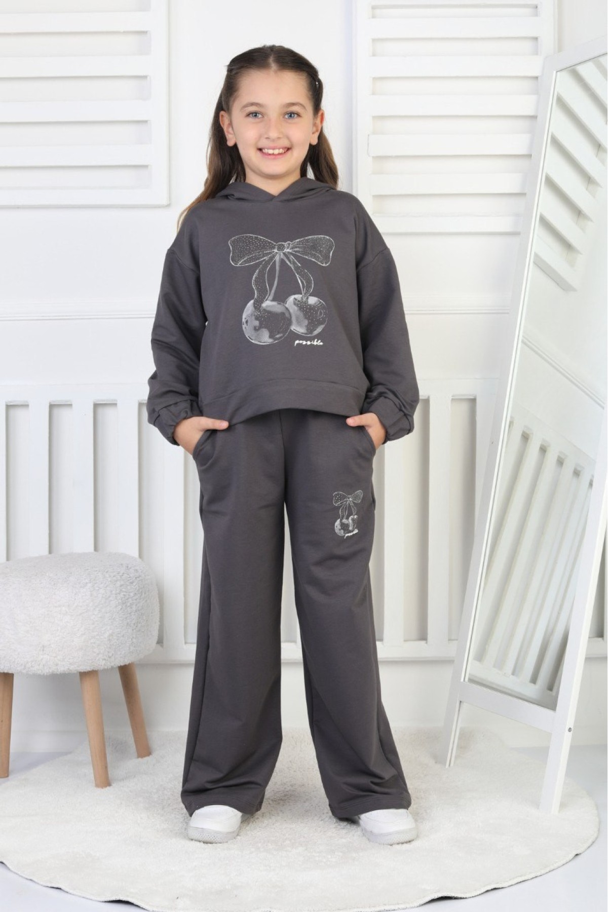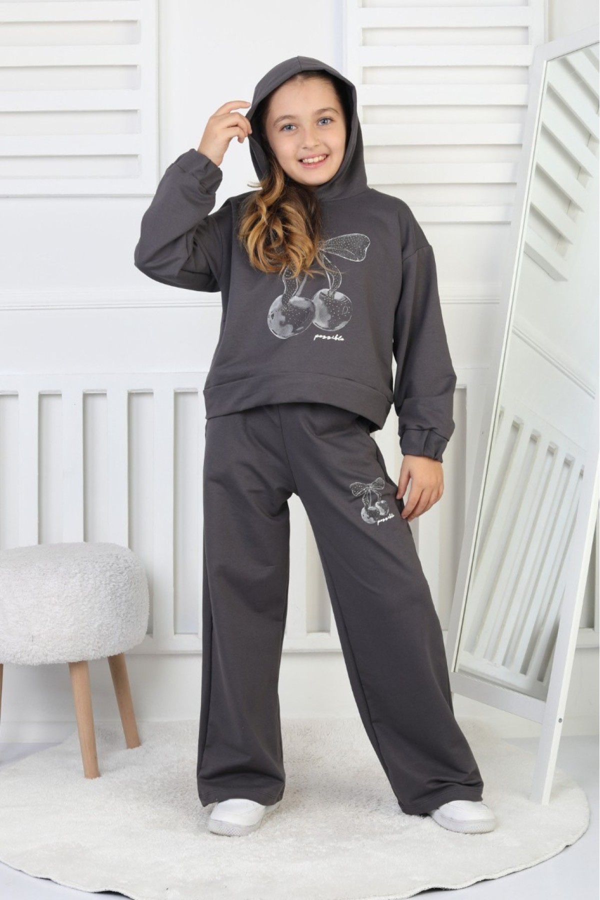İki İplik Kapüşonlu Baskılı Kız Çocuk Takım