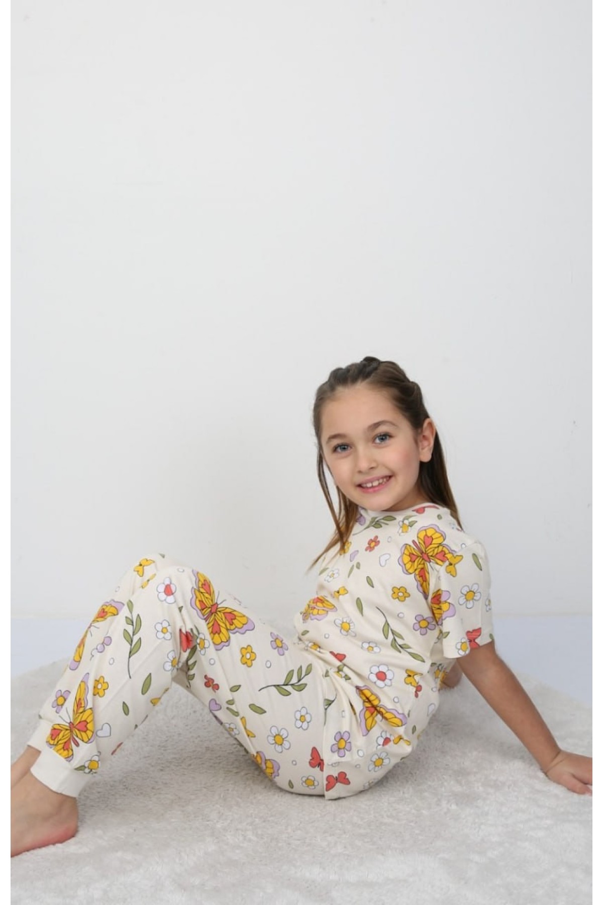 Kız Çocuk Kelebek ve Çiçek Desenli %100 Pamuk Süprem Kumaş Kısa Kollu Pijama Takımı
