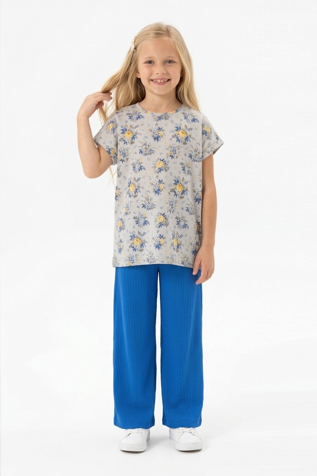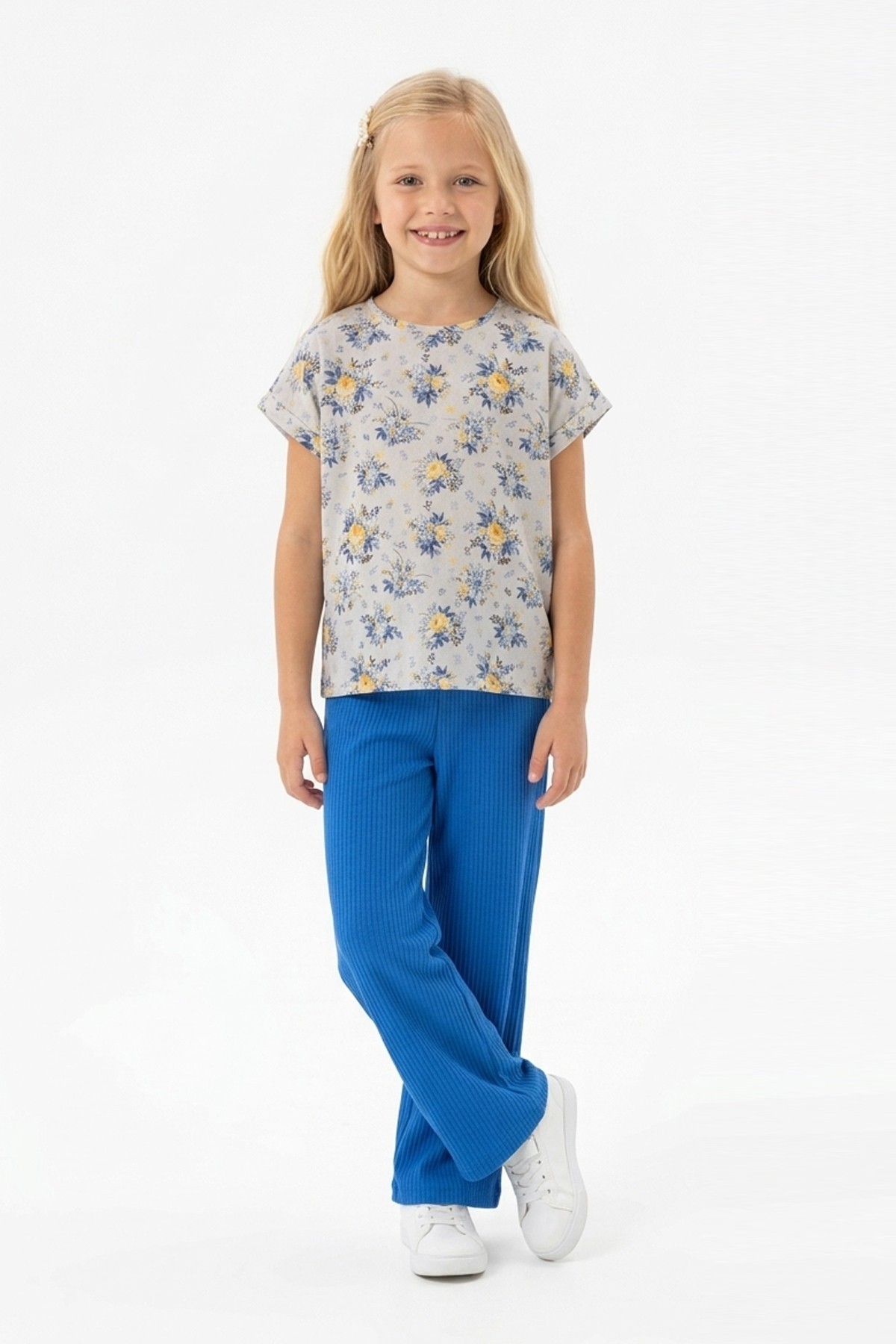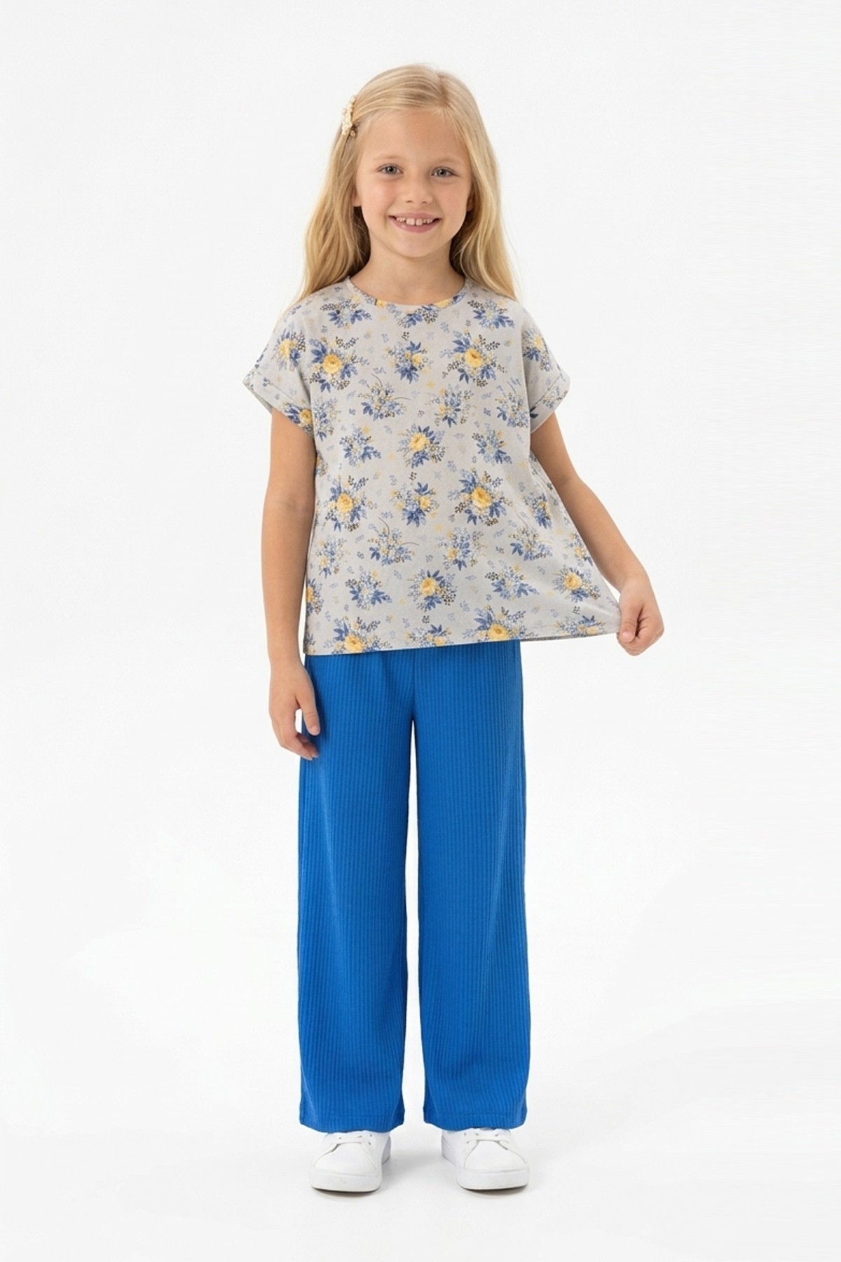 Kız Çocuk Puantiyeli Çiçek Desenli Kısa Kollu Bluz Fitilli Pantolon İkili Takım