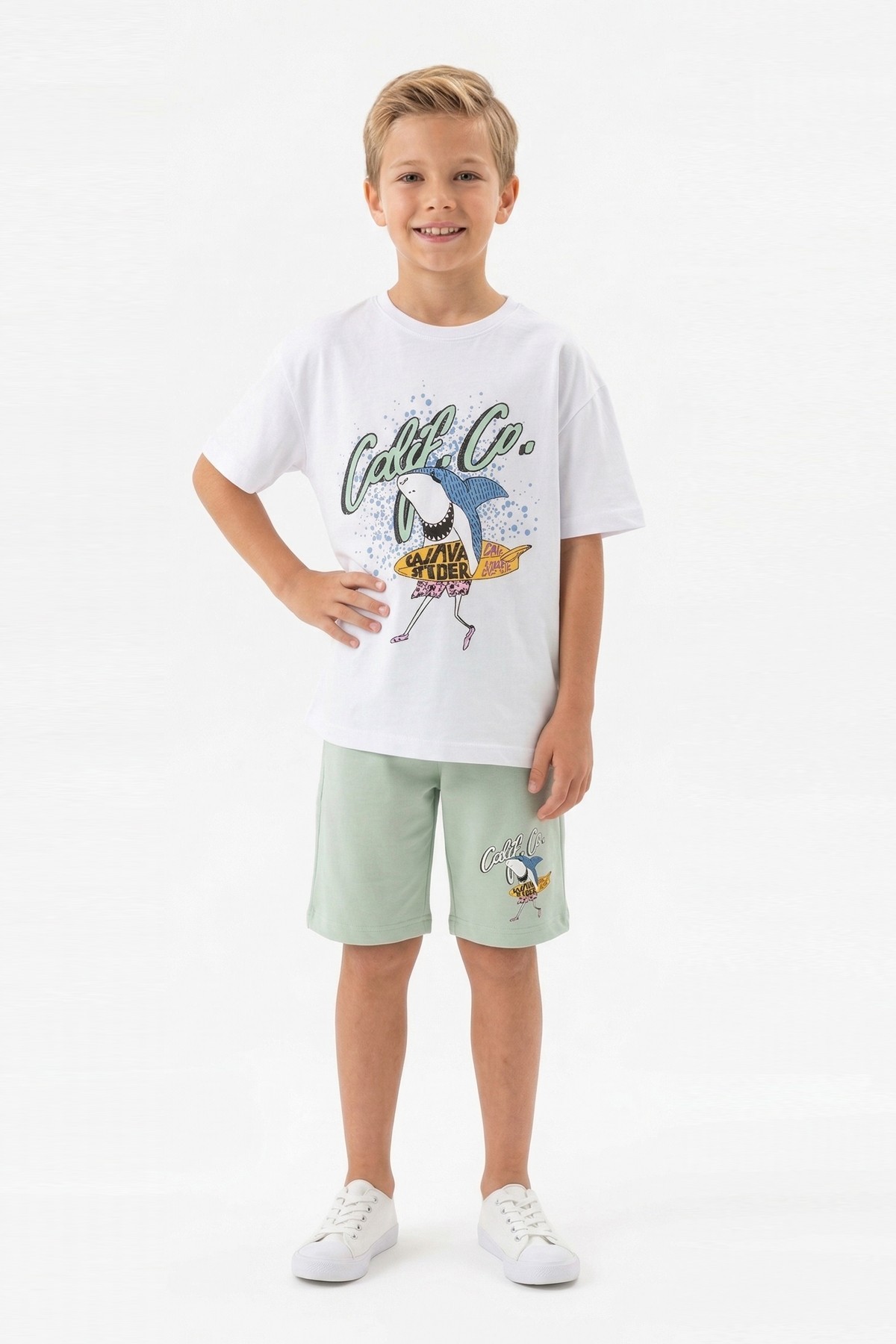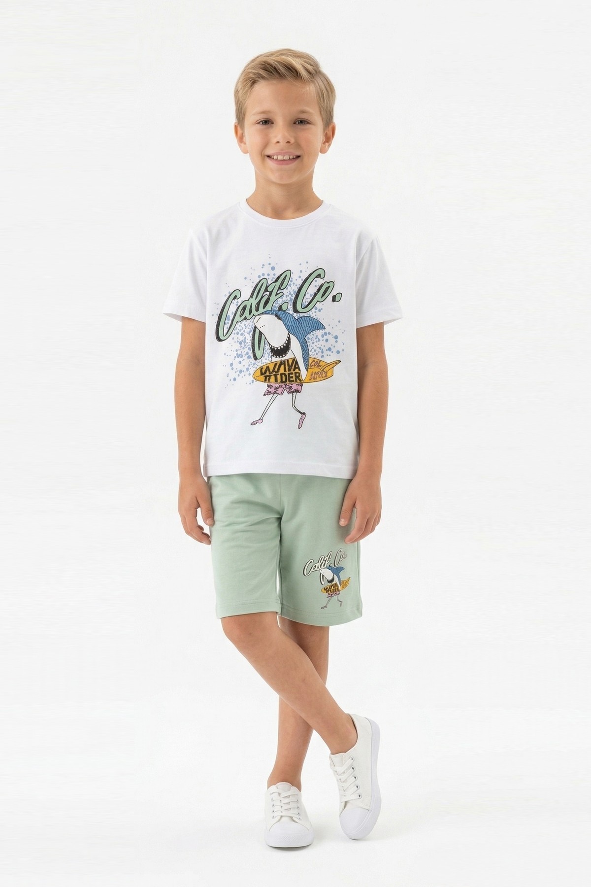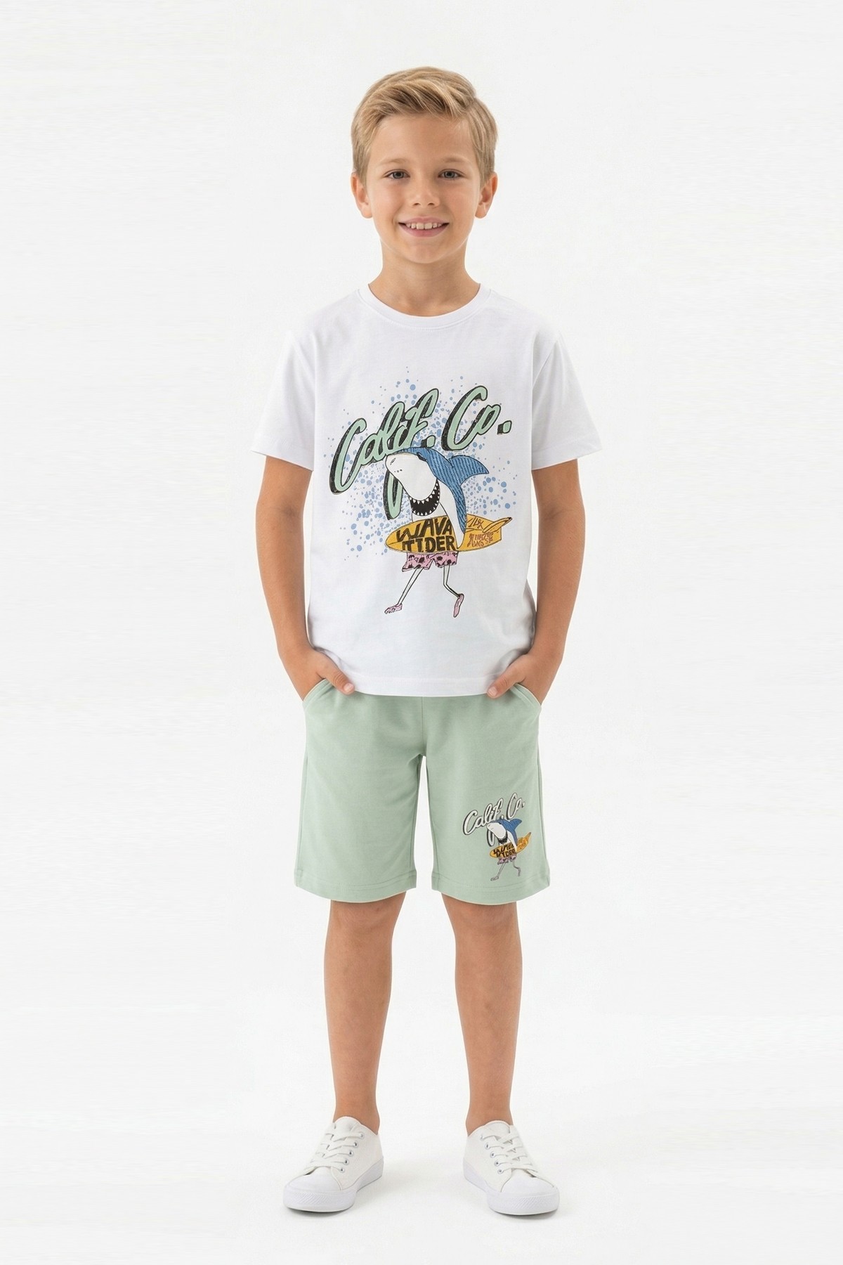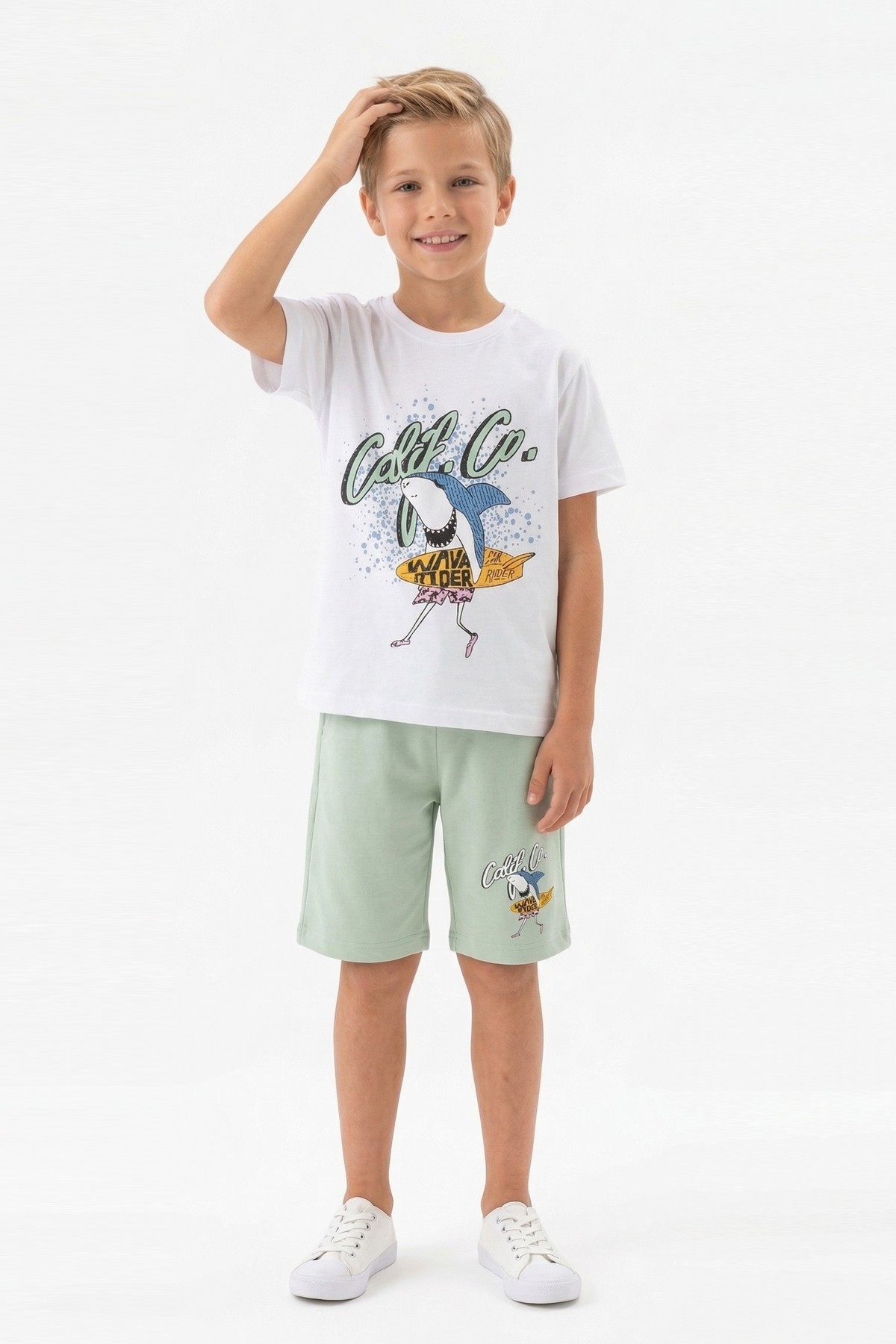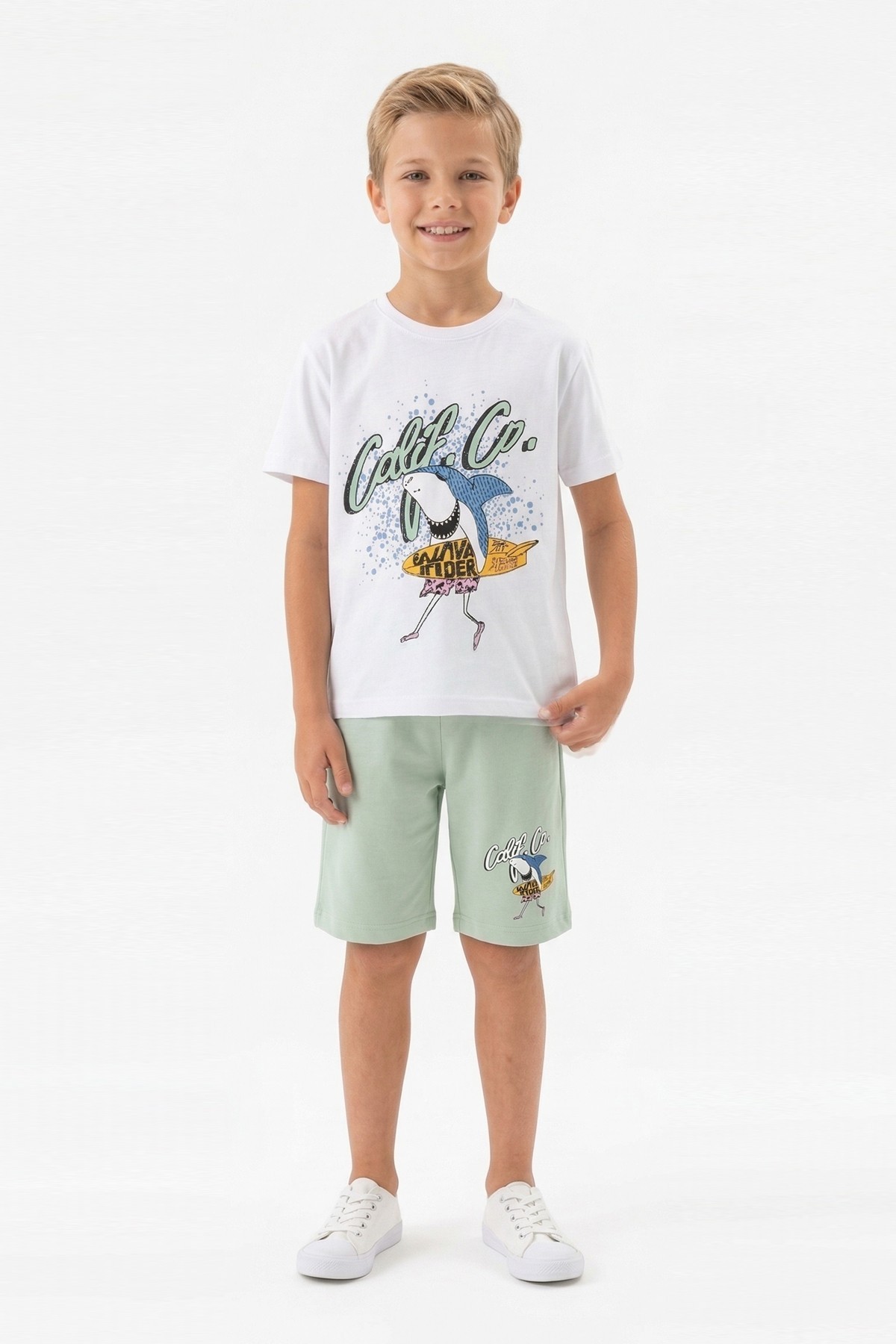 Erkek Çocuk Köpek Balığı Ve Surf Temalı Baskılı Kısa Kollu Tişört Şort Takım