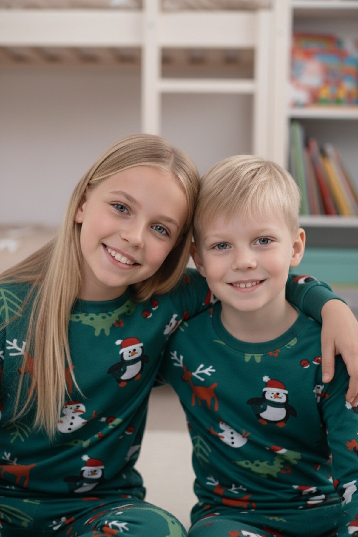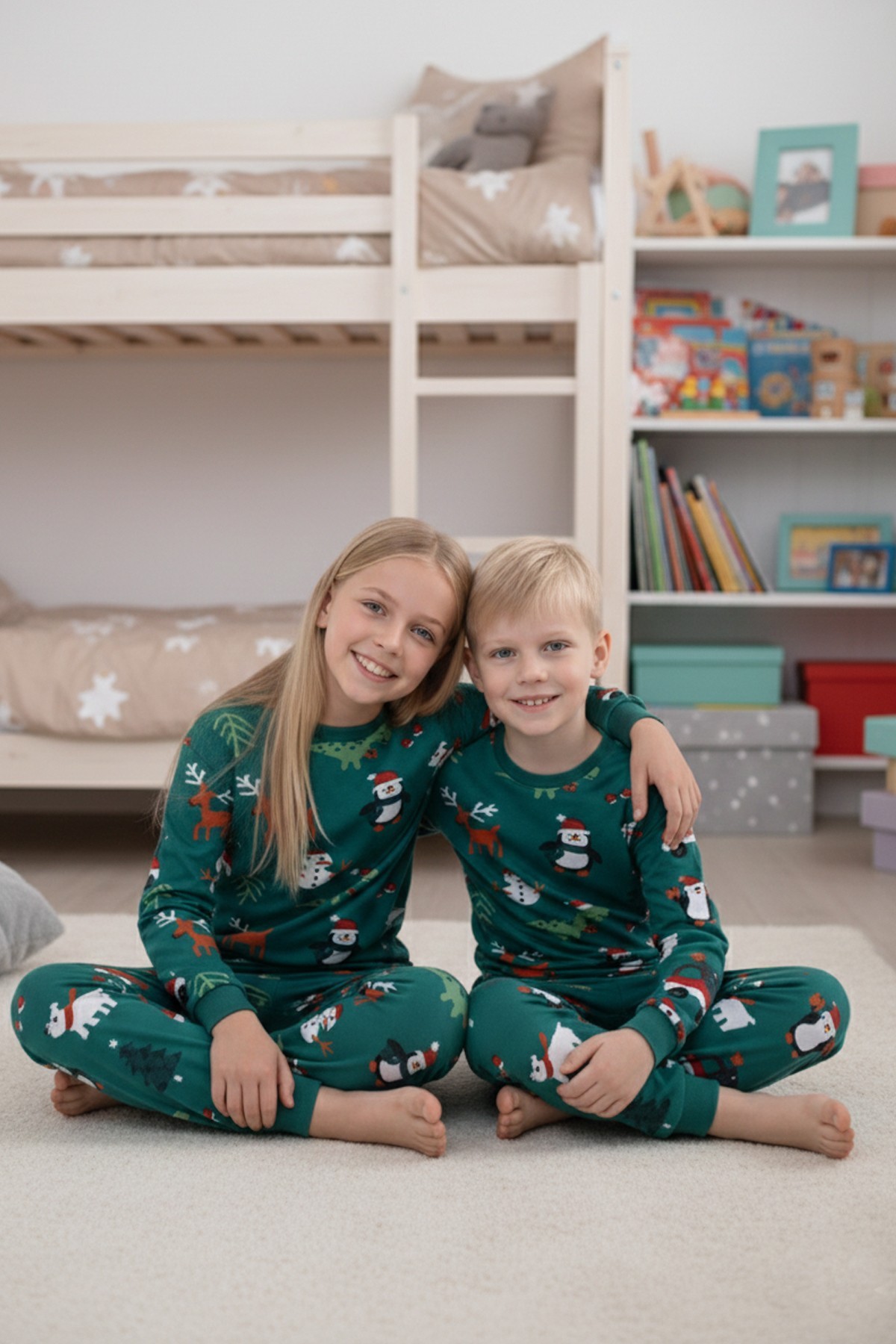 Garson Uniseks Çocuk Temalı Penguen Ve Geyik Desenli %100 Pamuk Reaktif Boyalı Süprem Kumaş Uzun Kollu Pijama Takımı