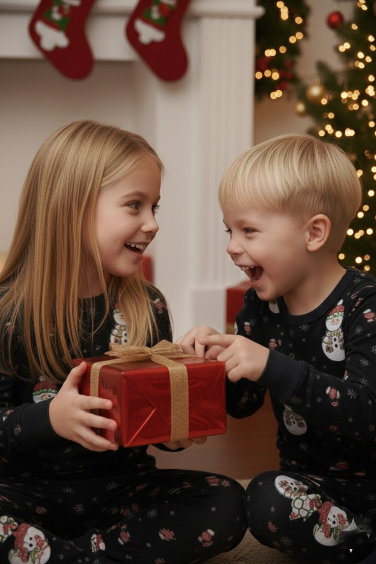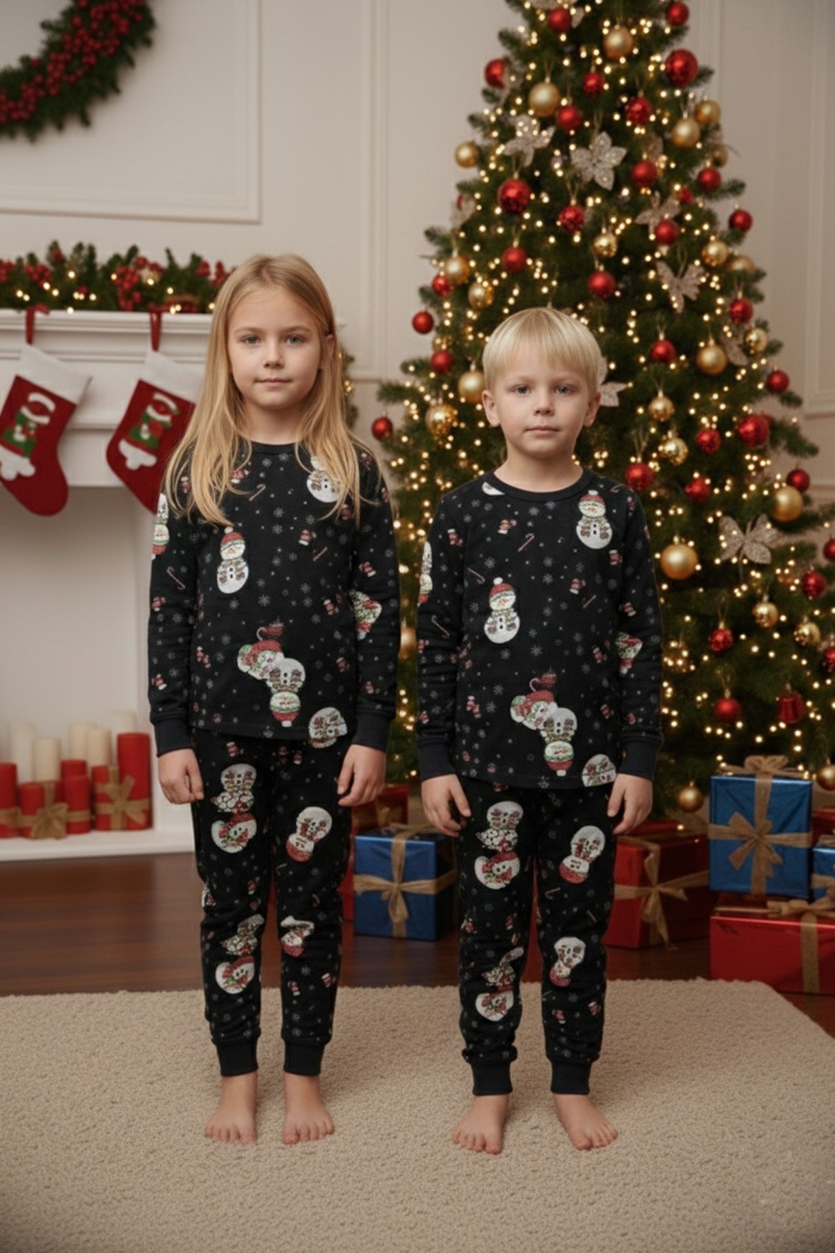 Uniseks Çocuk Kardan Adam Desenli Yılbaşı Temalı %100 Pamuk Reaktif Boyalı Süprem Kumaş Uzun Kollu Pijama Takımı