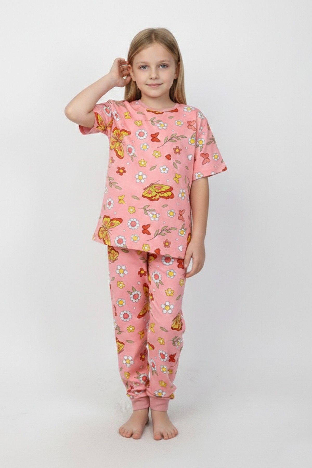 Kız Çocuk Kelebek ve Çiçek Desenli %100 Pamuk Süprem Kumaş Kısa Kollu Pijama Takımı