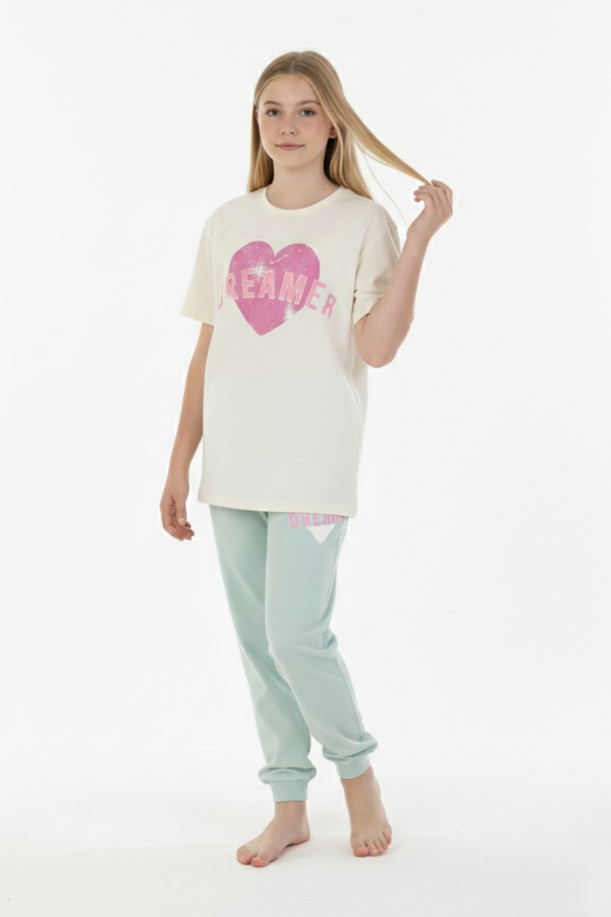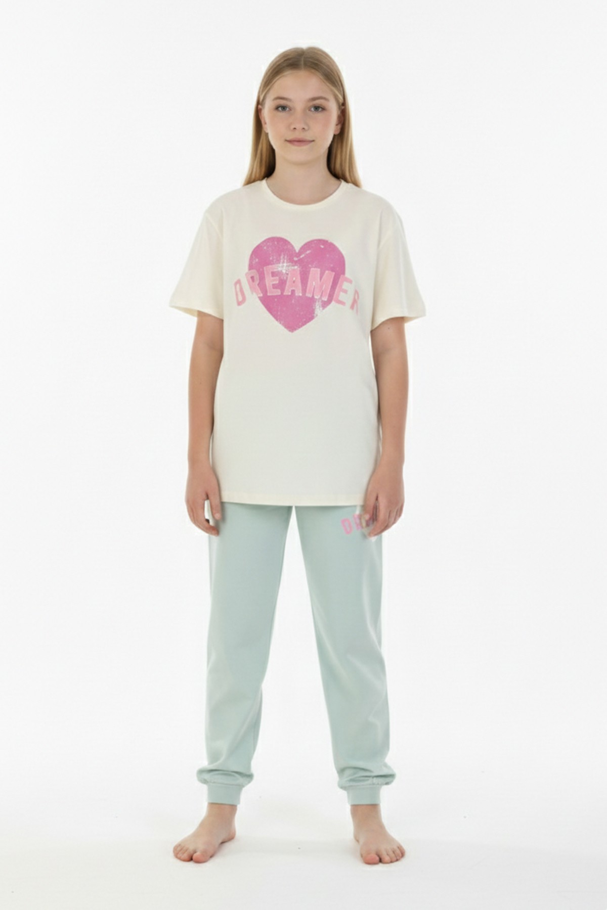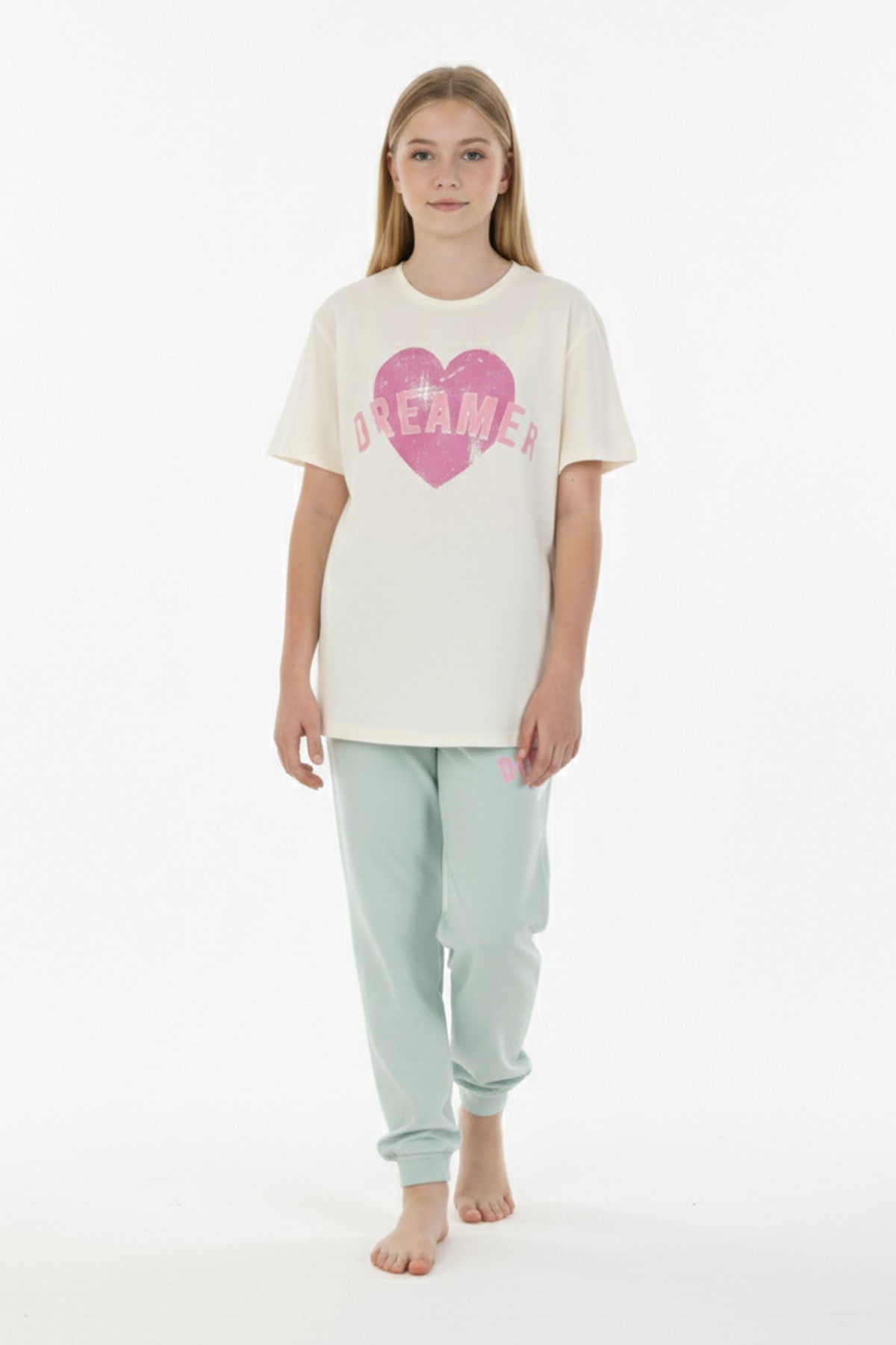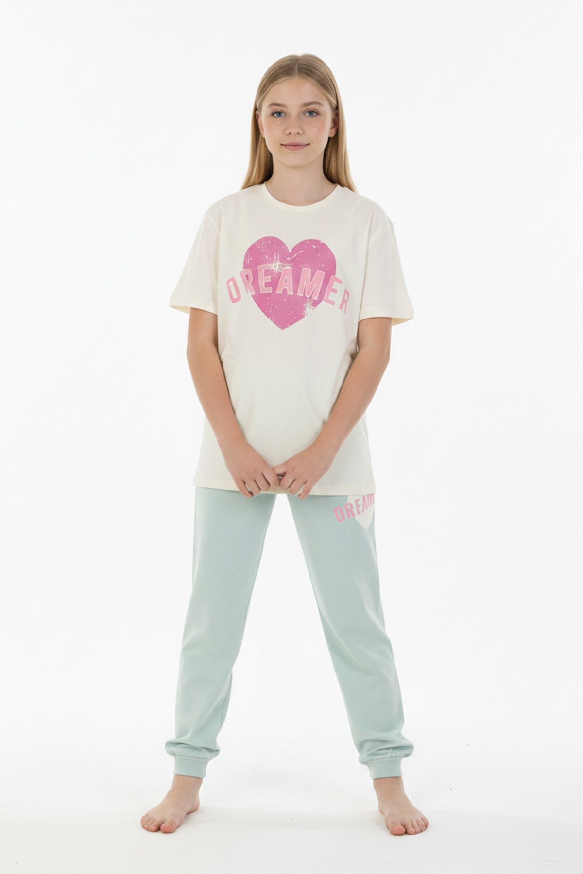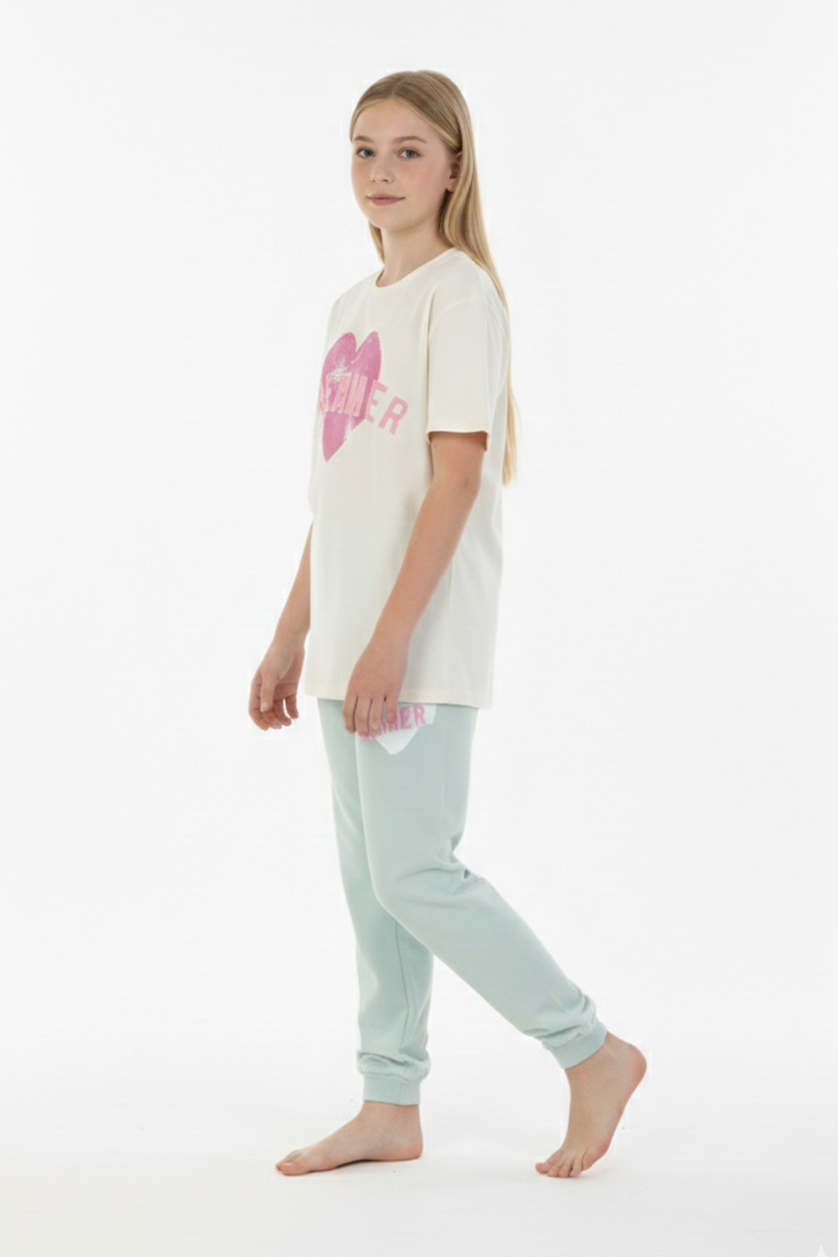 Garson Kız Çocuk Kalp Baskılı %100 Pamuk Reaktif Boyama Süprem Kumaş Kısa Kollu Pijama Takımı