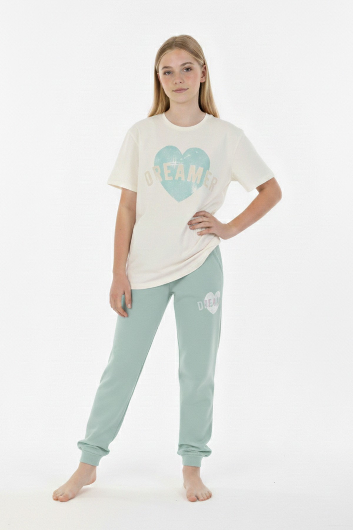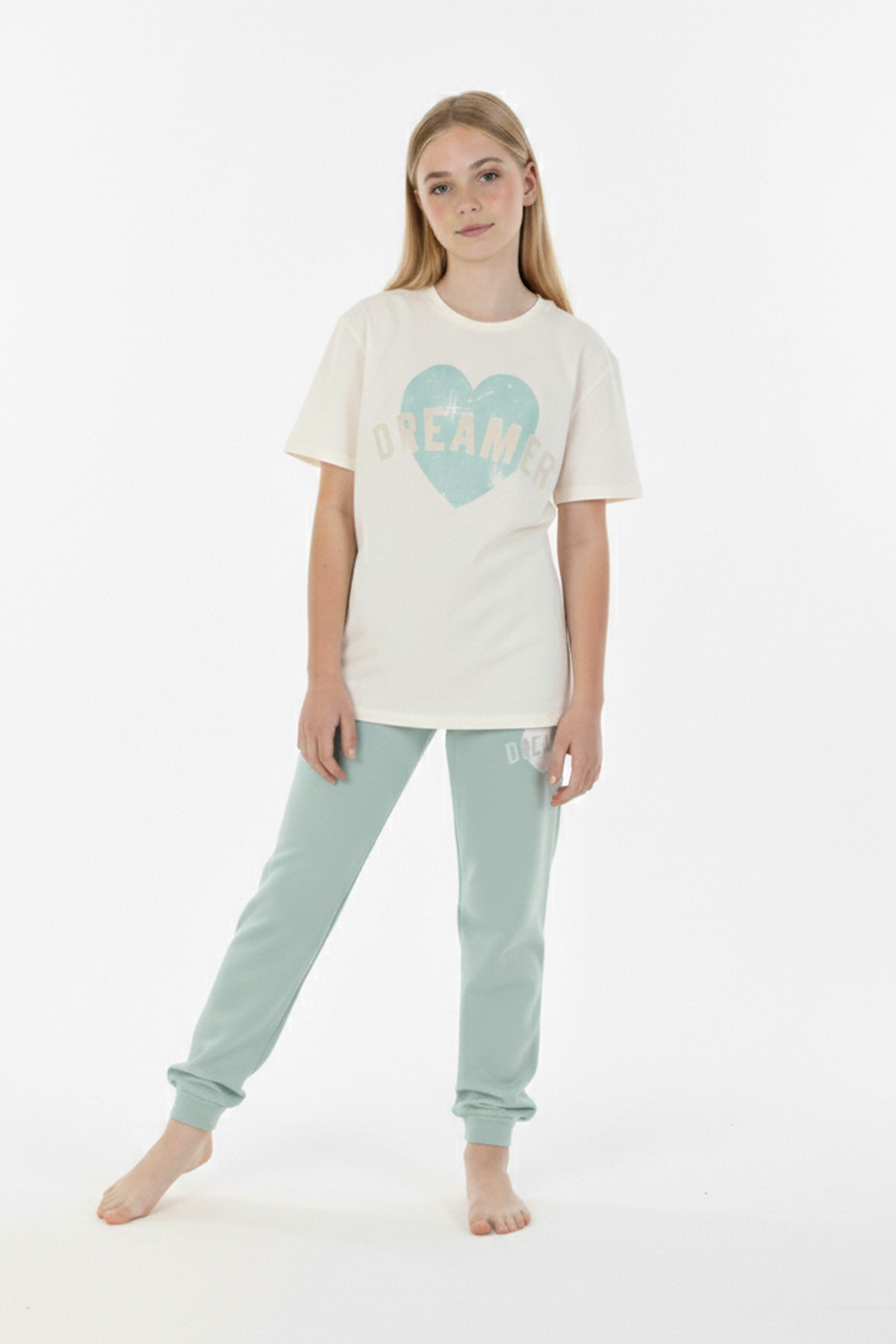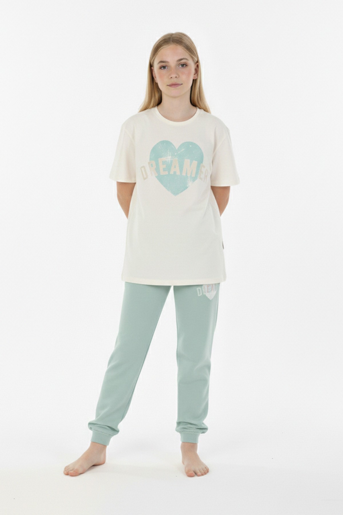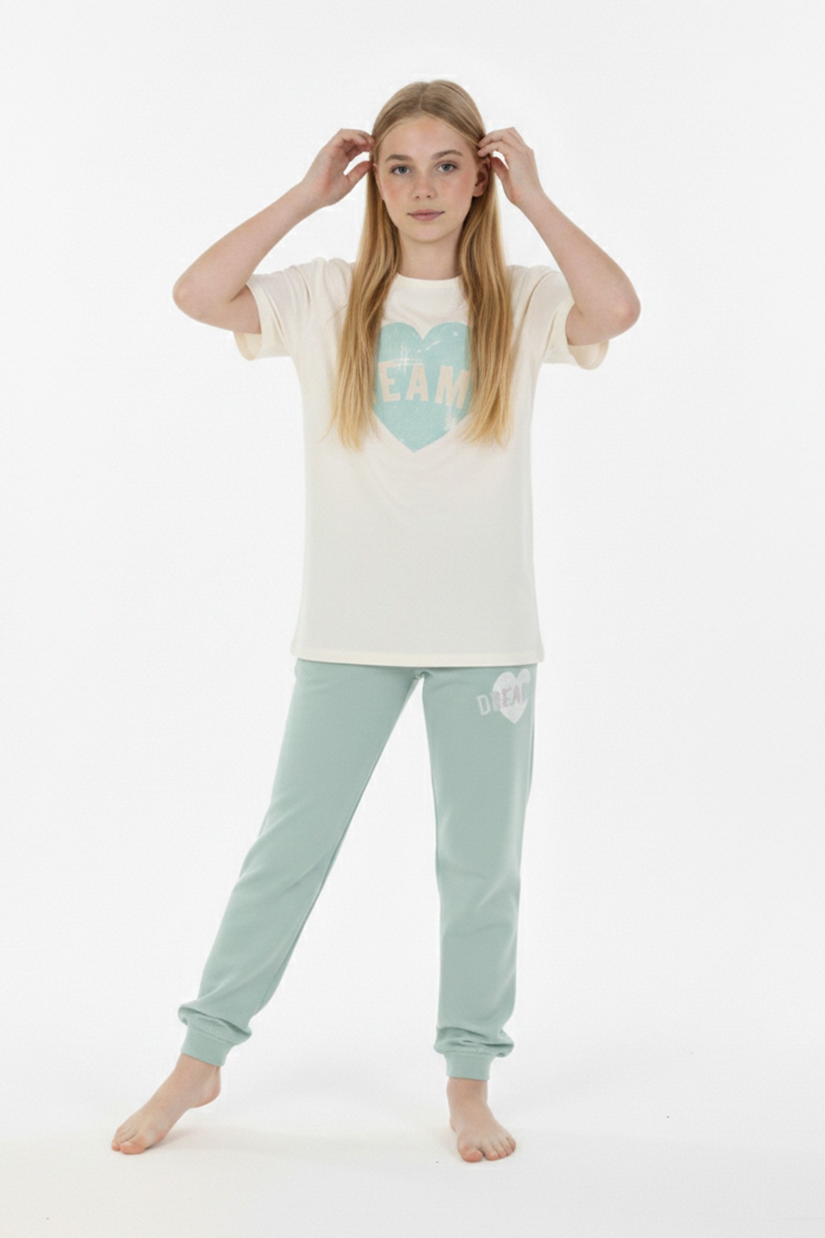 Garson Kız Çocuk Kalp Baskılı %100 Pamuk Reaktif Boyama Süprem Kumaş Kısa Kollu Pijama Takımı